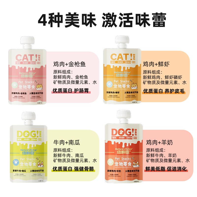 纽粹臣宠物鲜食包90g 4种口味鲜肉酱 补水湿粮包 宠物零食拌粮 线下专供 乱价包退!