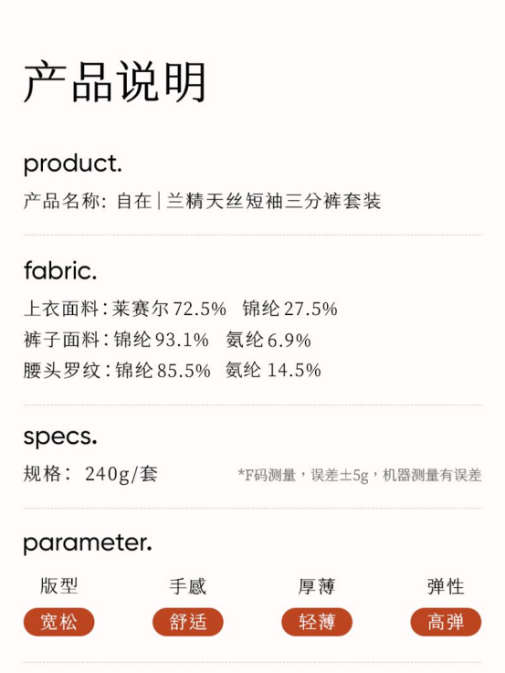 上衣用的是奥地利进口的天丝面料 懂的人都知道这个料子有多绝 可以说是天丝中的天花板级别了! 透气又亲肤 摸起来滑滑亮亮的 穿上身真的舒服到不想脱