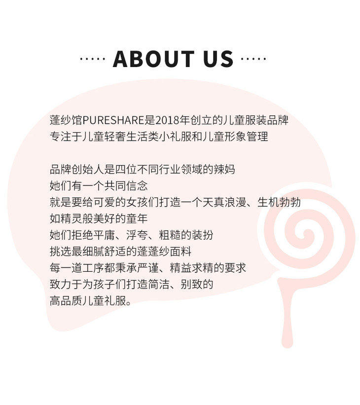 - PureShare蓬纱馆,2018年创立的儿童服装品牌,专注于儿童轻奢生活类小礼服,主张“让孩子做最独特的自己”的品牌理念,为孩子们提供时尚简洁、优雅而又不失童真的生活类礼服。