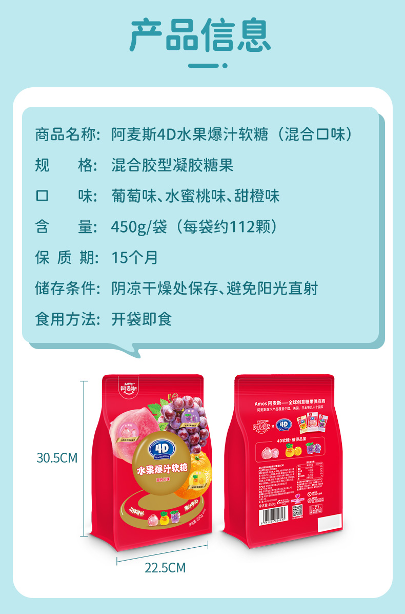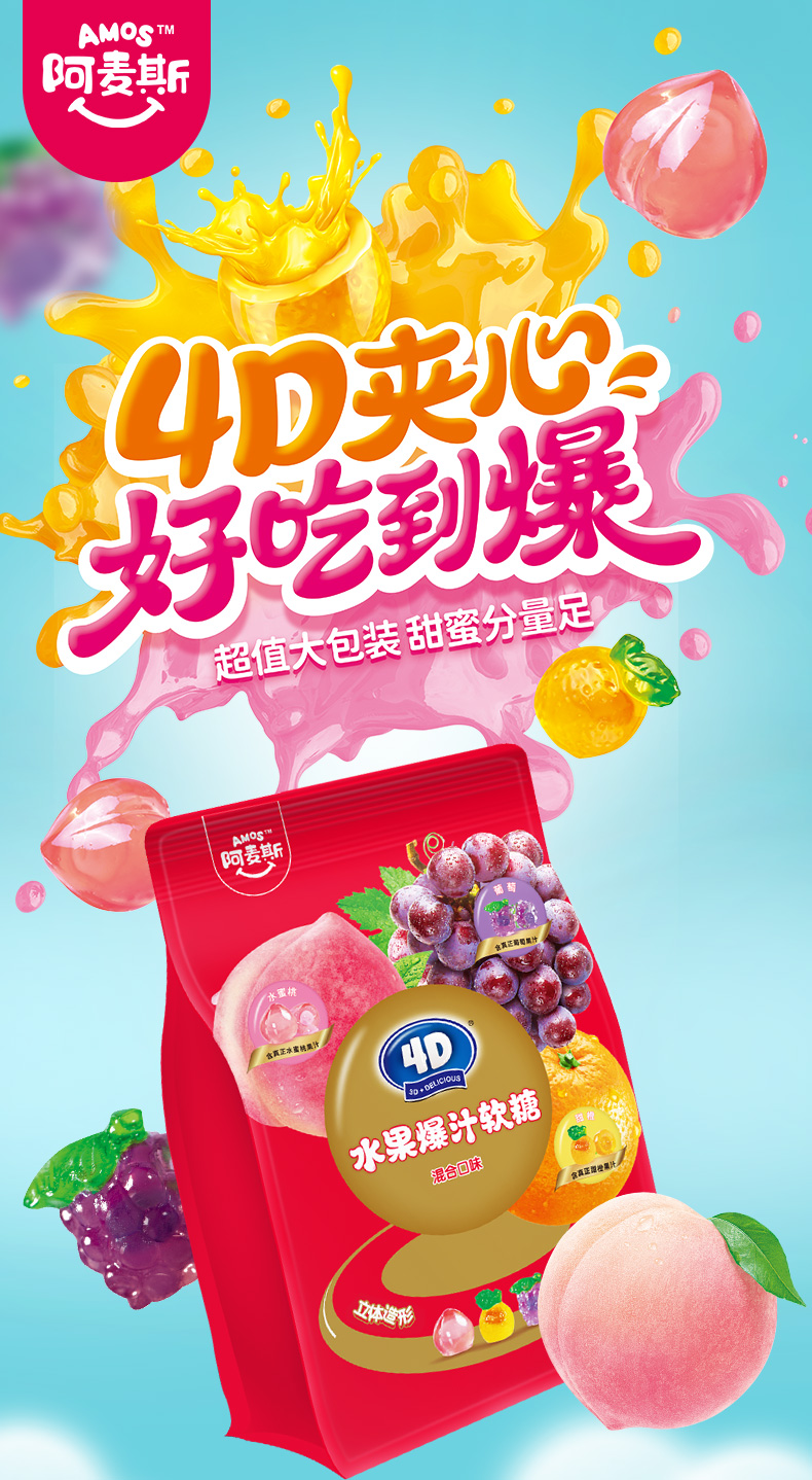 Amos阿麦斯4d爆浆爆汁软糖水果果汁夹心糖果零食儿童礼物450g/228g