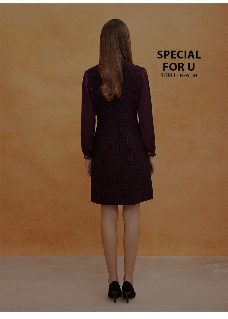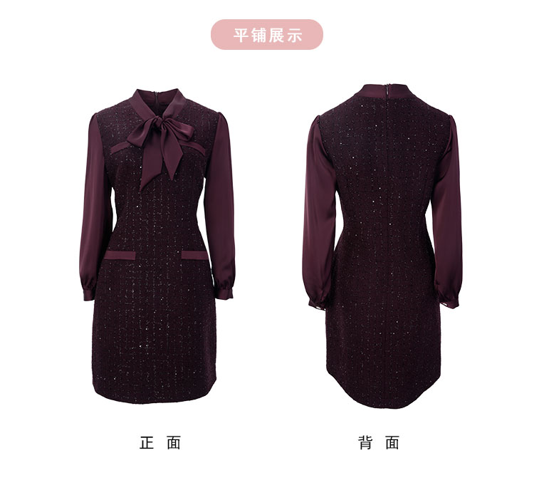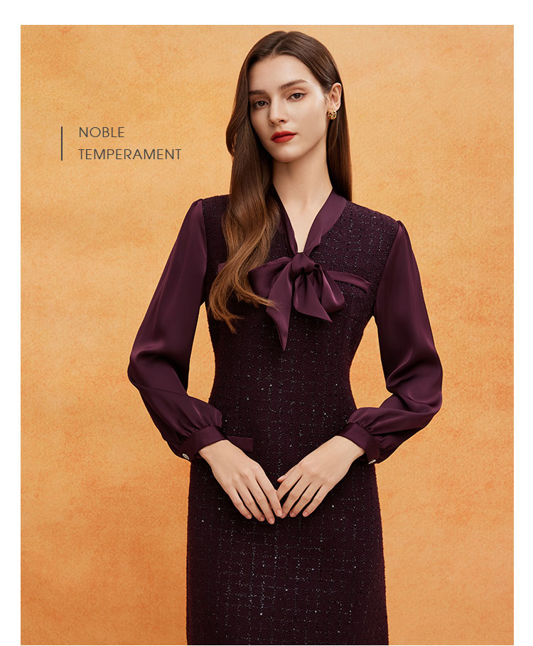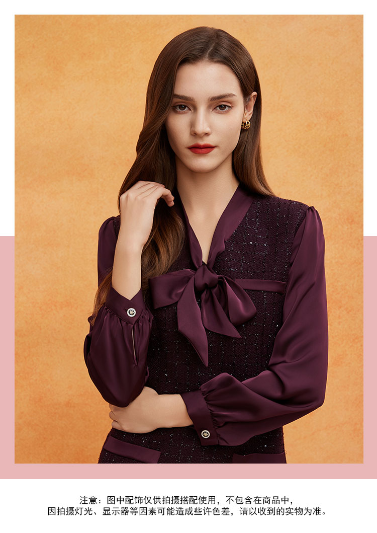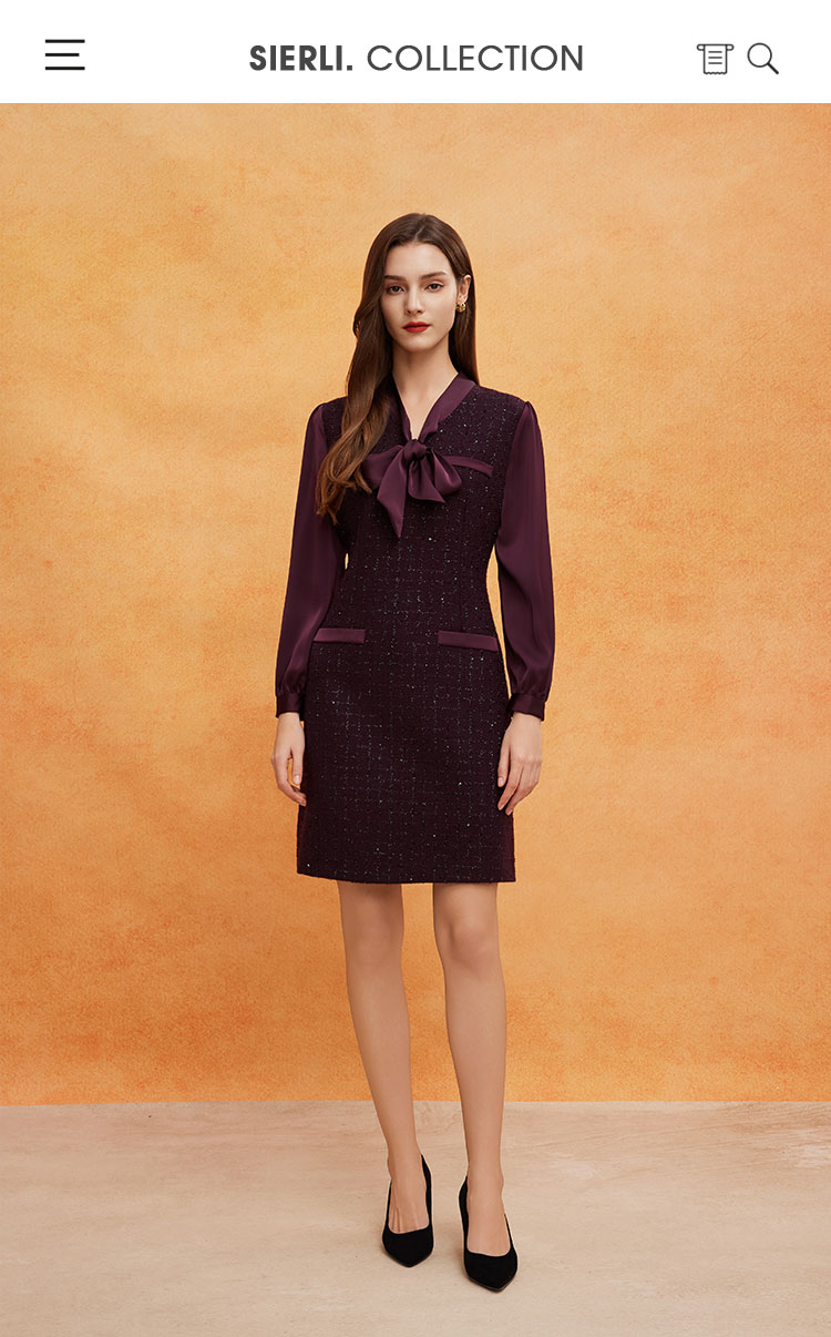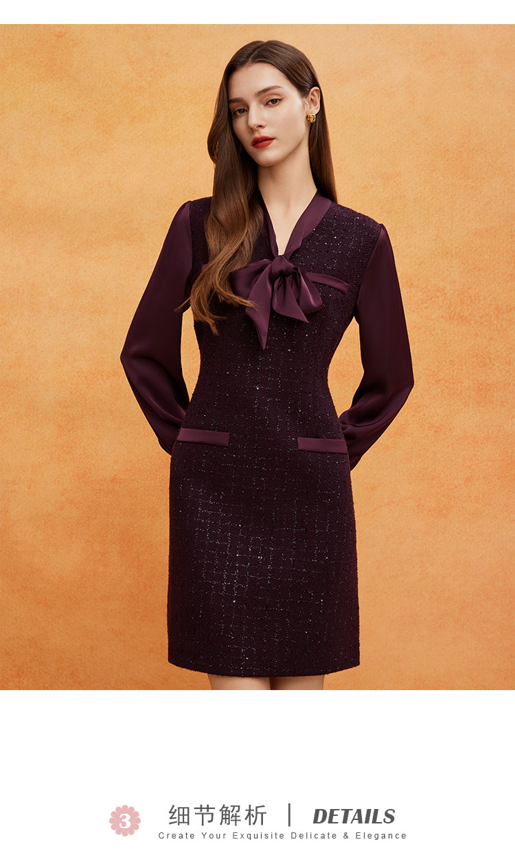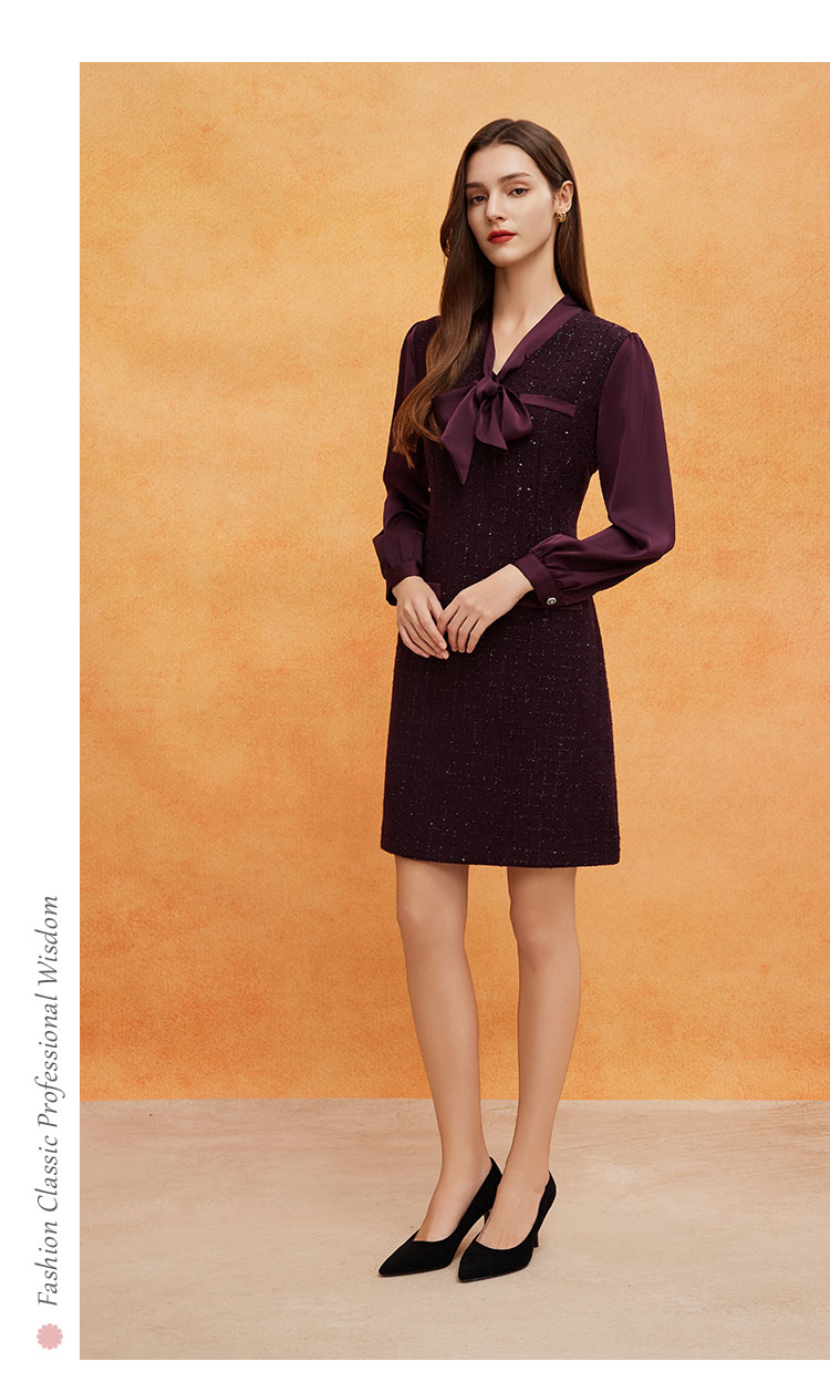 QE826斯尔丽25春季新款通勤时尚花纱小香风直身型领口飘带气质连衣裙