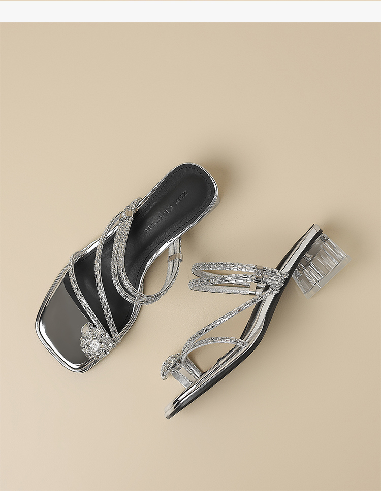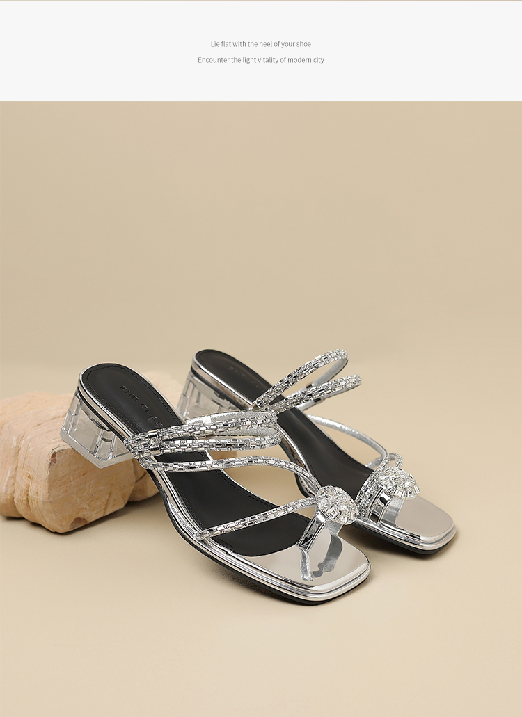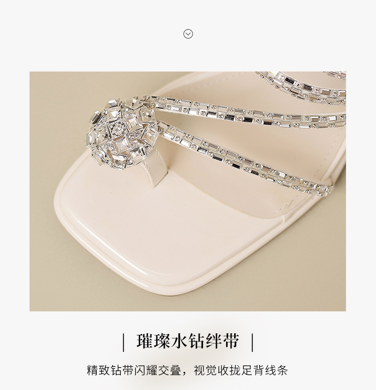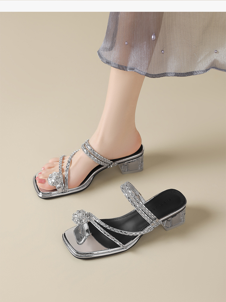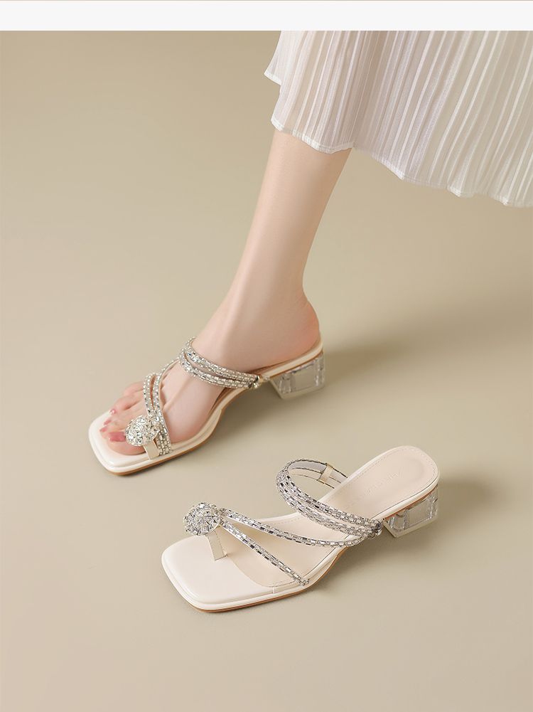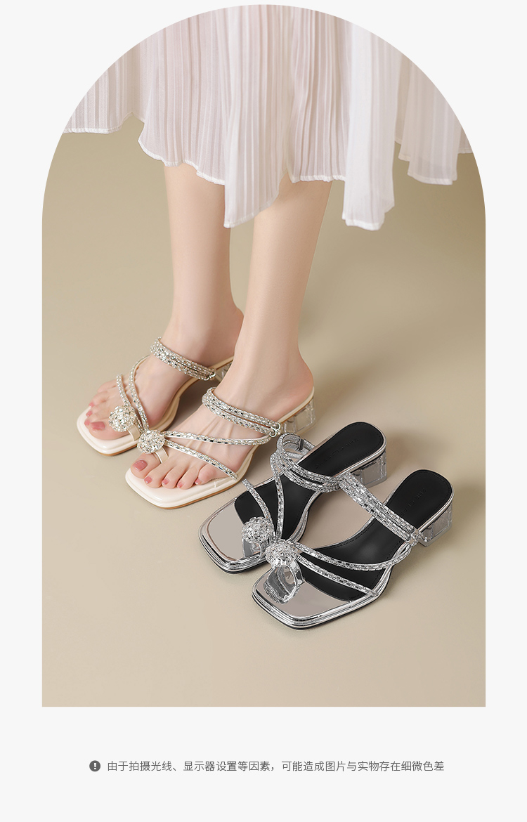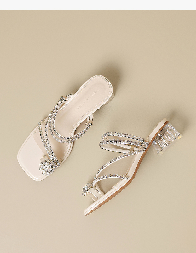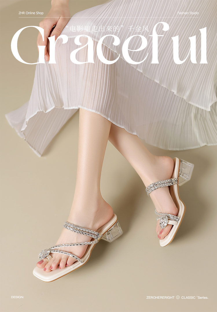 ZHR粗跟凉鞋女2025夏季新品外穿水钻夹趾法式轻奢高级凉拖鞋