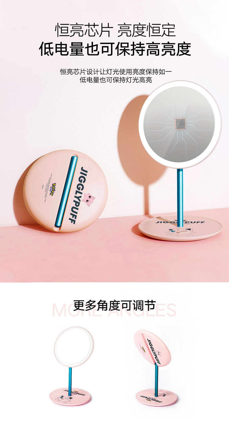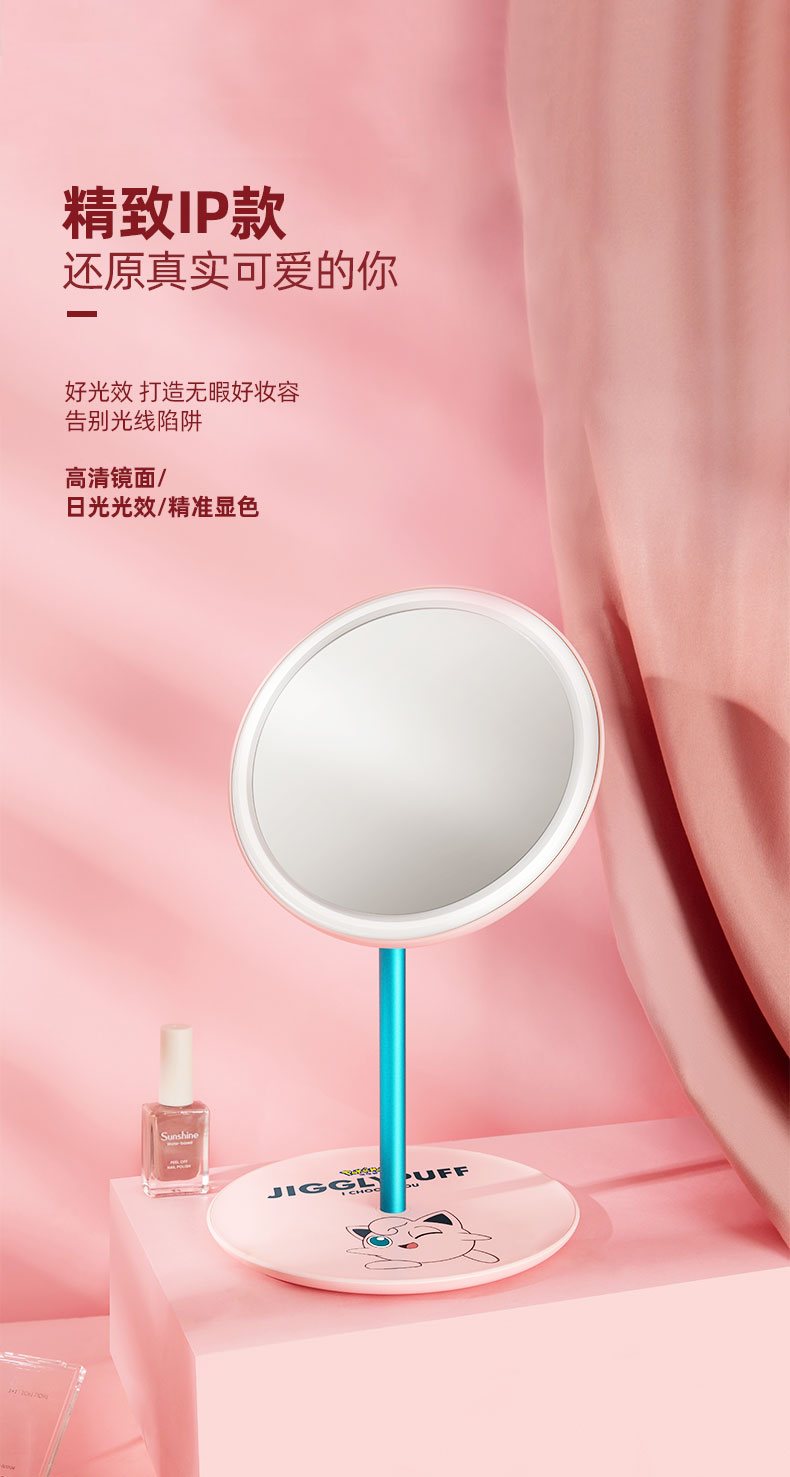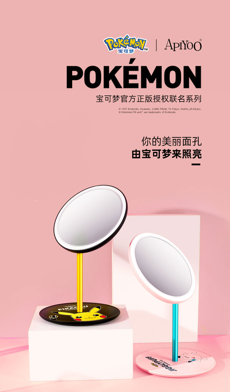 艾优皮卡丘胖丁款便携式美妆镜化妆镜带灯led随身镜桌面台式梳妆【艾优】