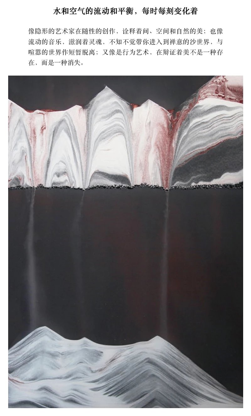 在克莱斯的作品中,沙通过水和空气的流动和平衡,每时每刻变化着,像隐形的艺术家在随性的创作,诠释着时间,空间和自然的美;也像流动的音乐,滋润着灵魂,不知不觉带你进入到禅意的沙世界,与喧嚣的世界作短暂脱离;又像是行为艺术,在辩证着美不是一 种存在,而是一种消失。