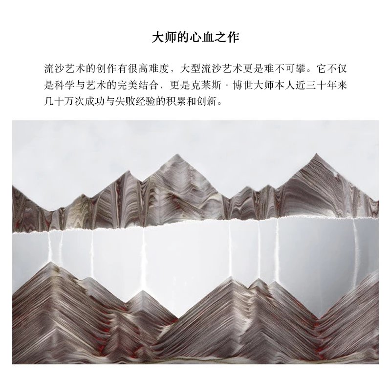 流沙艺术是科学与艺术的完美结合,它诠释了大自然形成的原理,又有着让人放松, 冥想,和静心的功能。大师在流沙艺术创作中应用了重力,密度,和流体力学领域的科学原理,结合大师至臻的艺术创意,每幅艺术作品都是克莱斯本人和他培训的工艺师的精心手工制作。