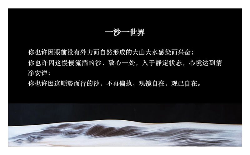 一沙一世界。你也许因眼前没有外力而自然形成的大山大水感染而兴奋;你也许因这慢慢流淌的沙,致心一处,入于静定状态,心境达到清净安详;你也许因这顺势而行的沙, 不再偏执,观镜自在,观己自在。