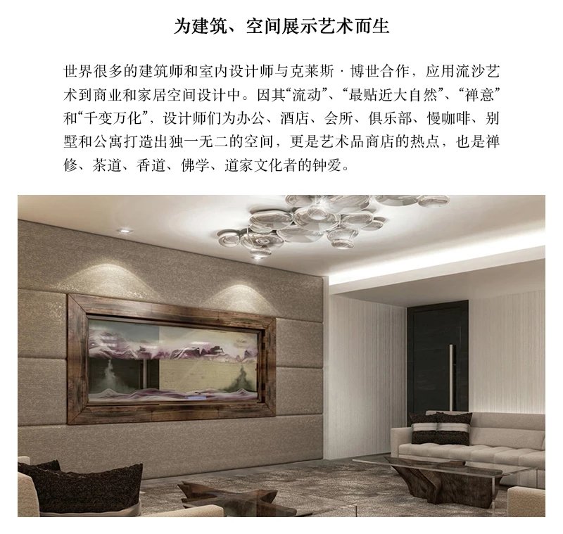 世界很多的建筑师和室内设计师与克莱斯·博世合作,应用流沙 艺术到商业和家居空间设计中。因其“流动”,“最贴近大自然”,“禅意” 和“千变万化”,设计师们为办公、酒店、会所、俱乐部、慢咖啡、别墅 和公寓打造出独一无二的空间,更是艺术品商店的热点,也是禅修、茶 道、香道、佛学、道家文化者的钟爱。