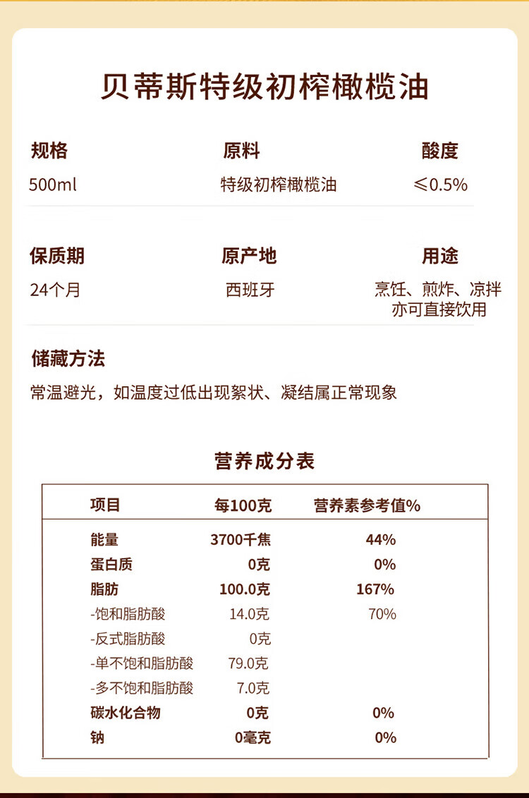 贝蒂斯 特级初榨橄榄油500ml/瓶
