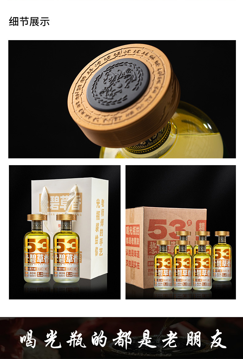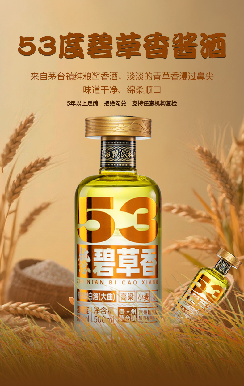 53度碧草香500ml,层次丰满,酱香浓郁,标准酱酒度数适合酱香爱好饮用者,