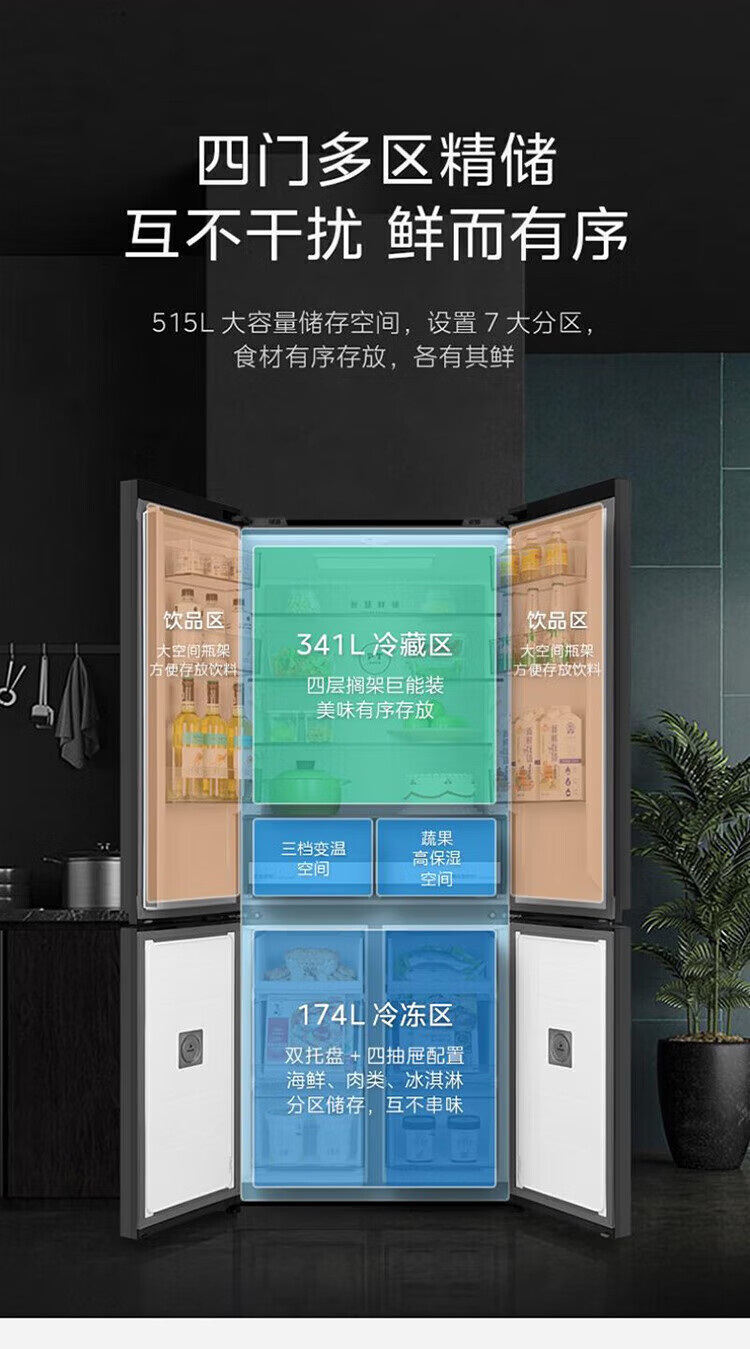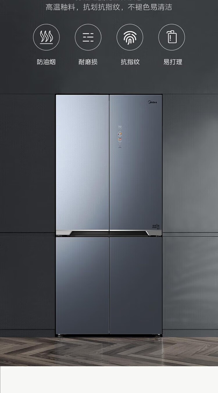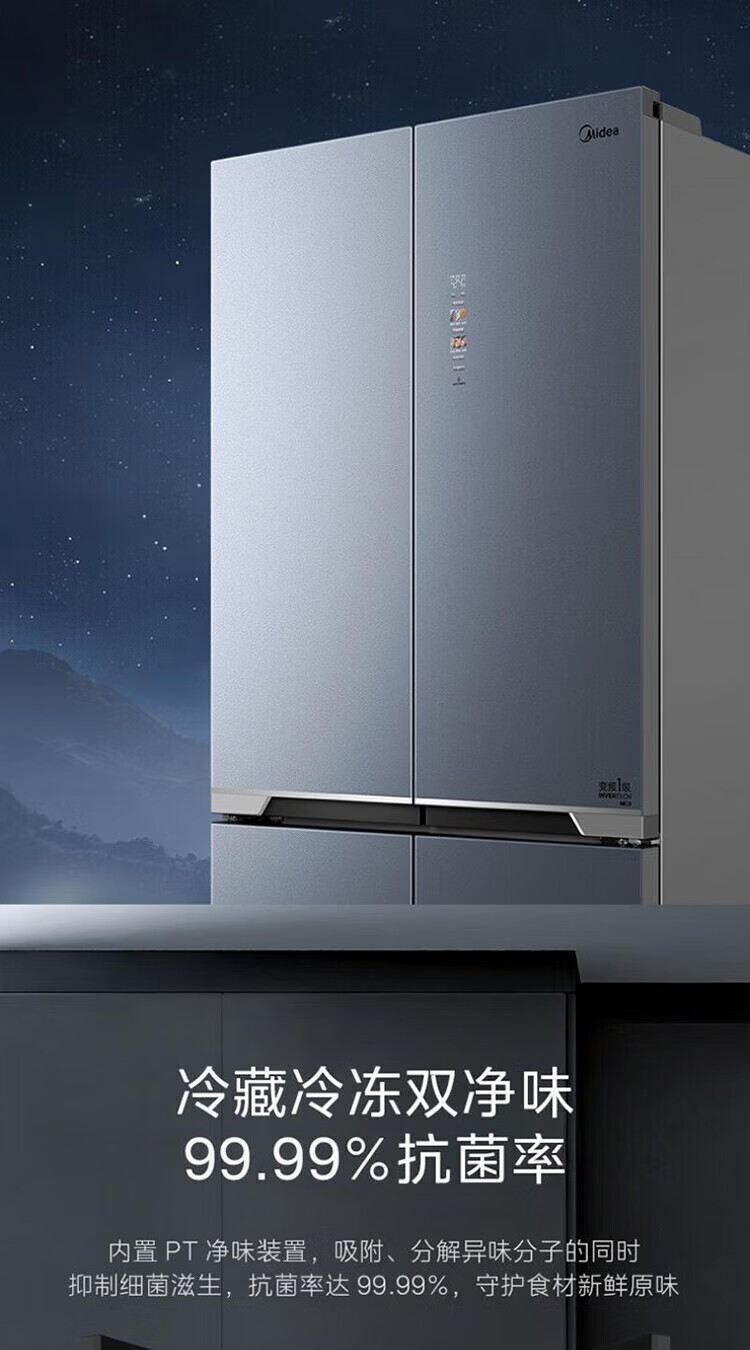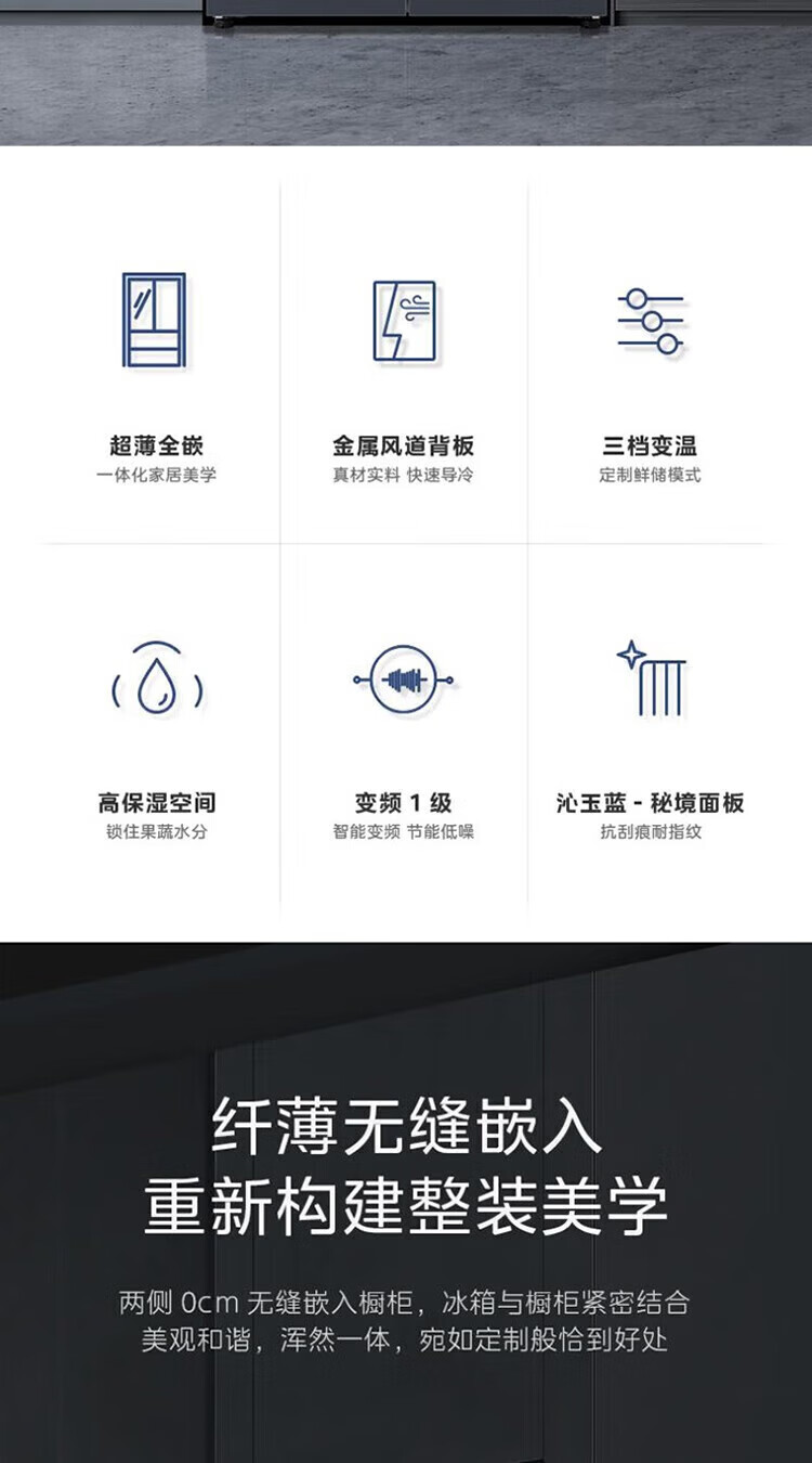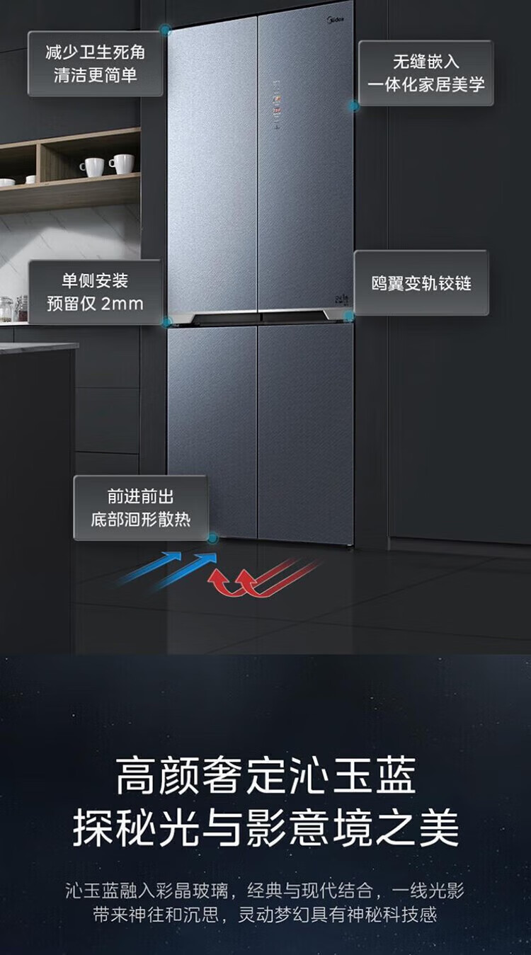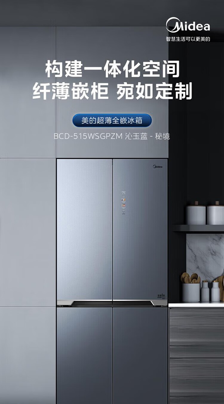 美的515升517升四门风冷无霜一级能效双变频超薄净味大容量家用电冰箱 纯平全嵌BCD-515WSGPZM沁玉蓝