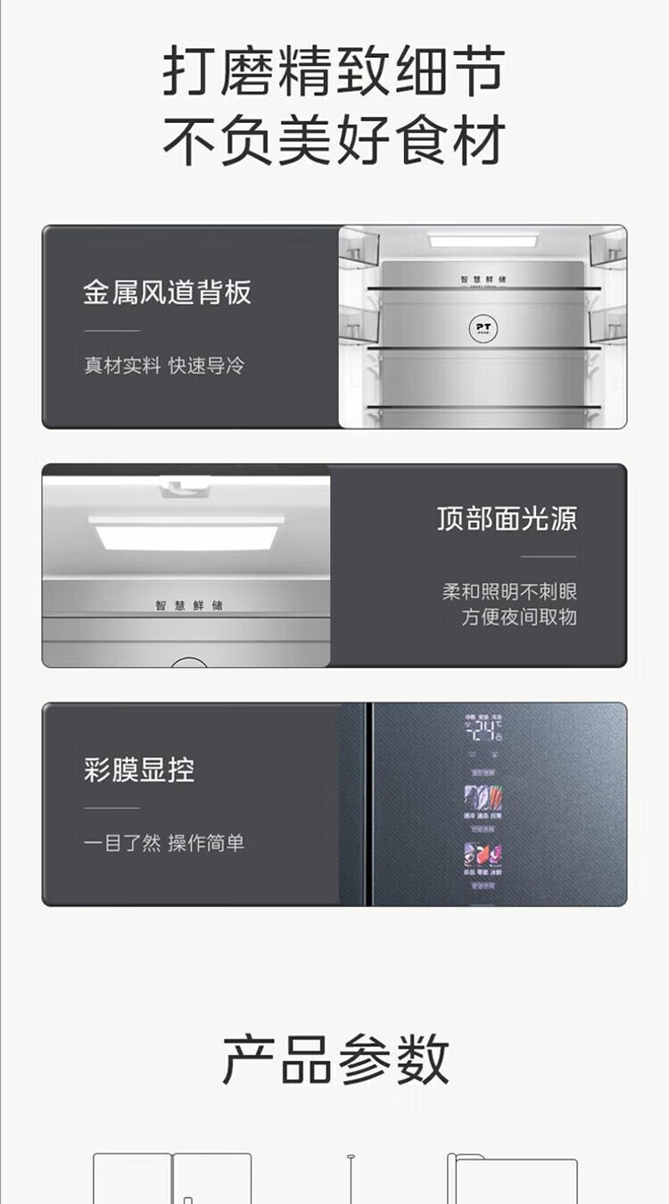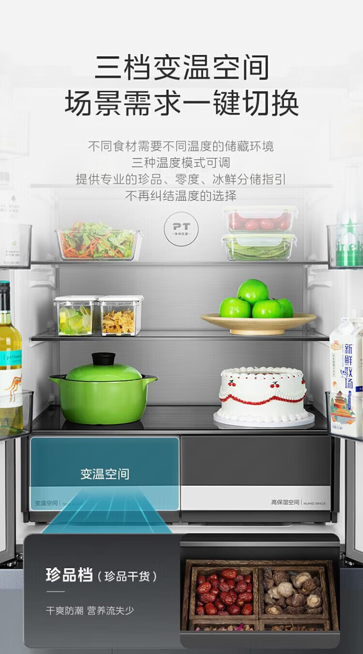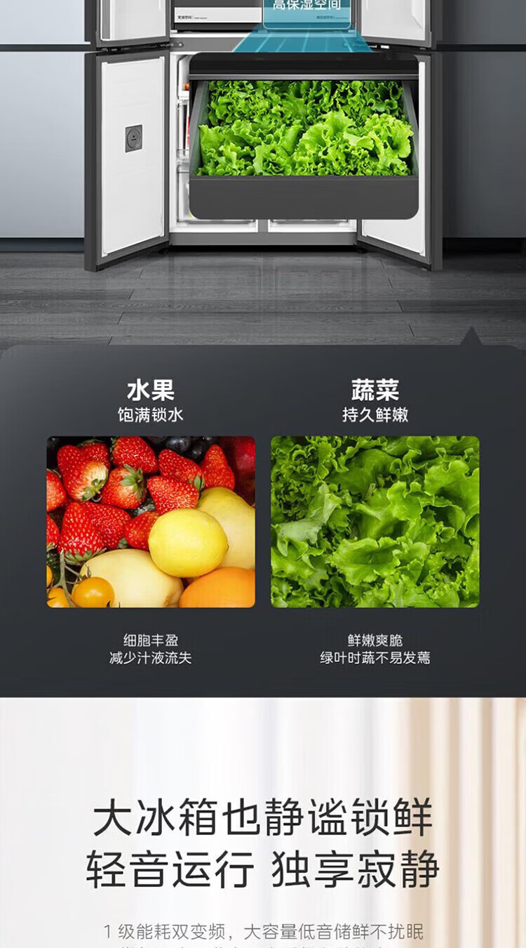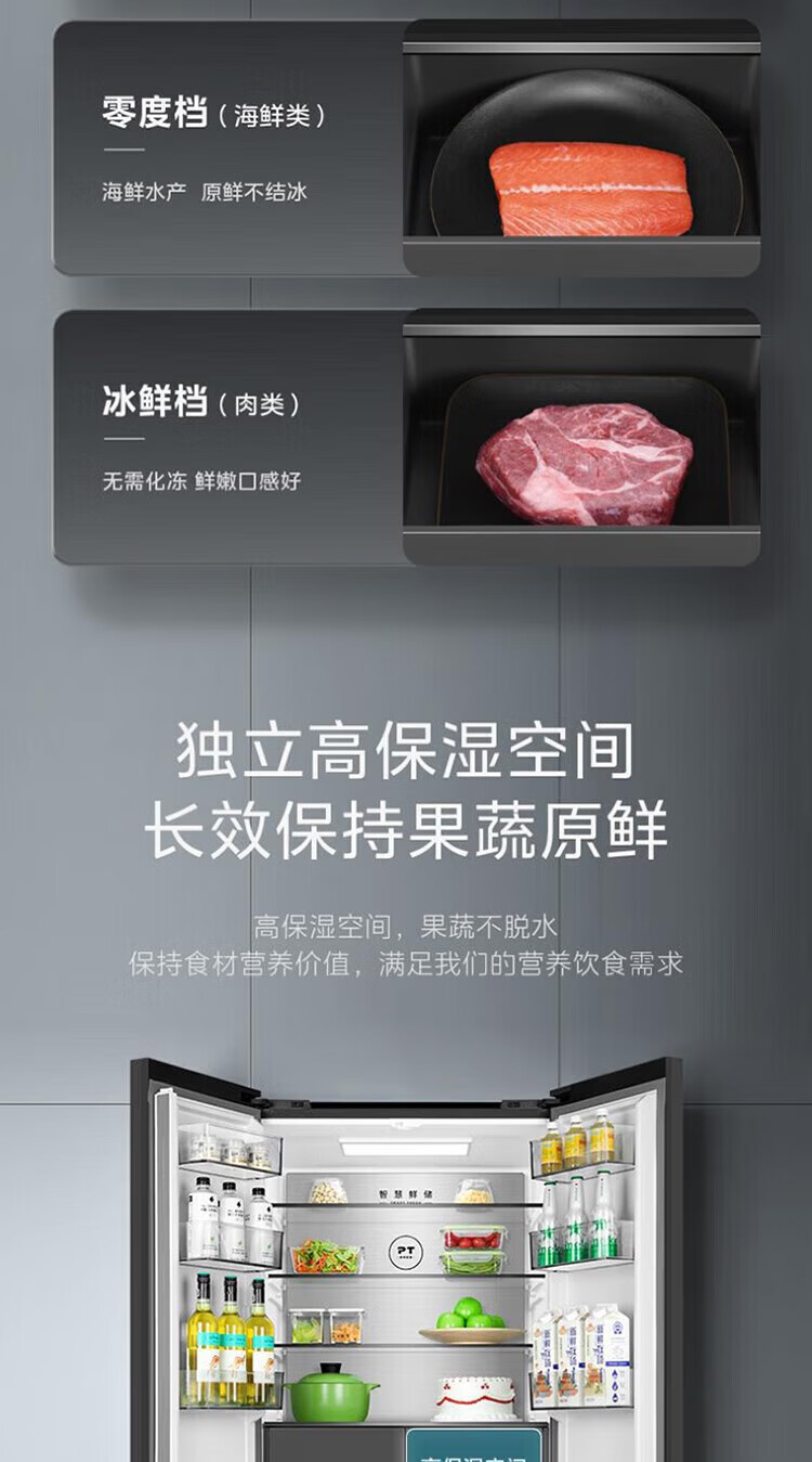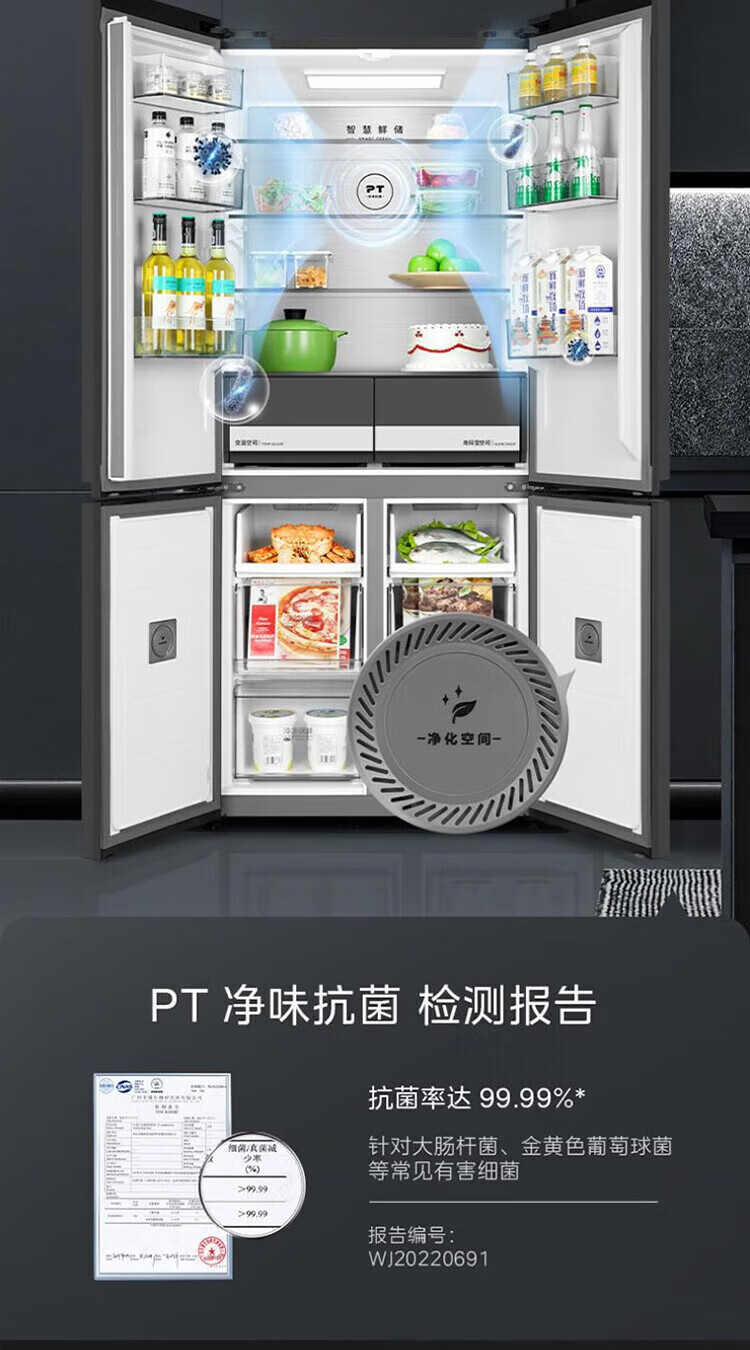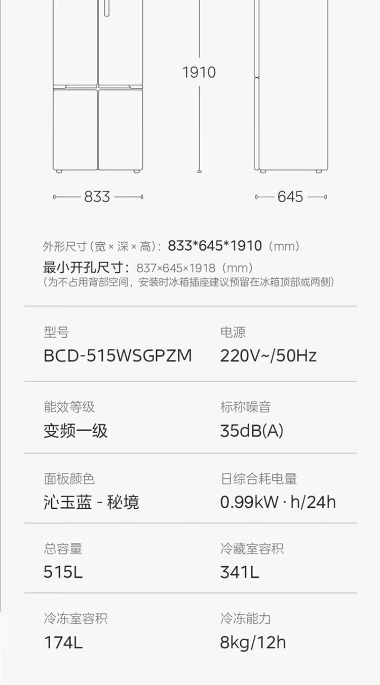 美的515升517升四门风冷无霜一级能效双变频超薄净味大容量家用电冰箱 纯平全嵌BCD-515WSGPZM沁玉蓝