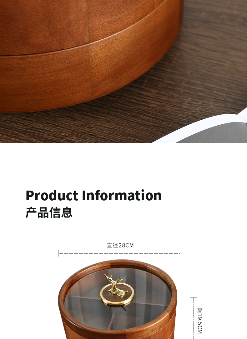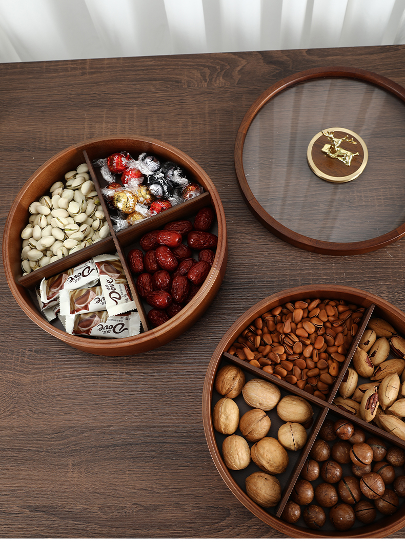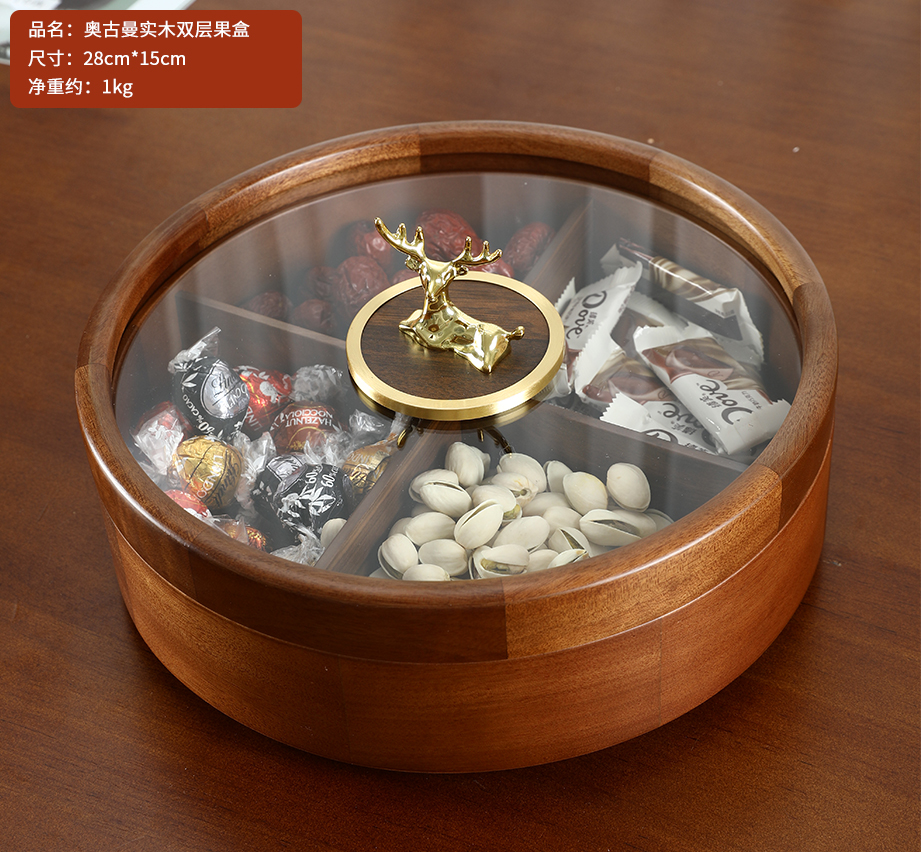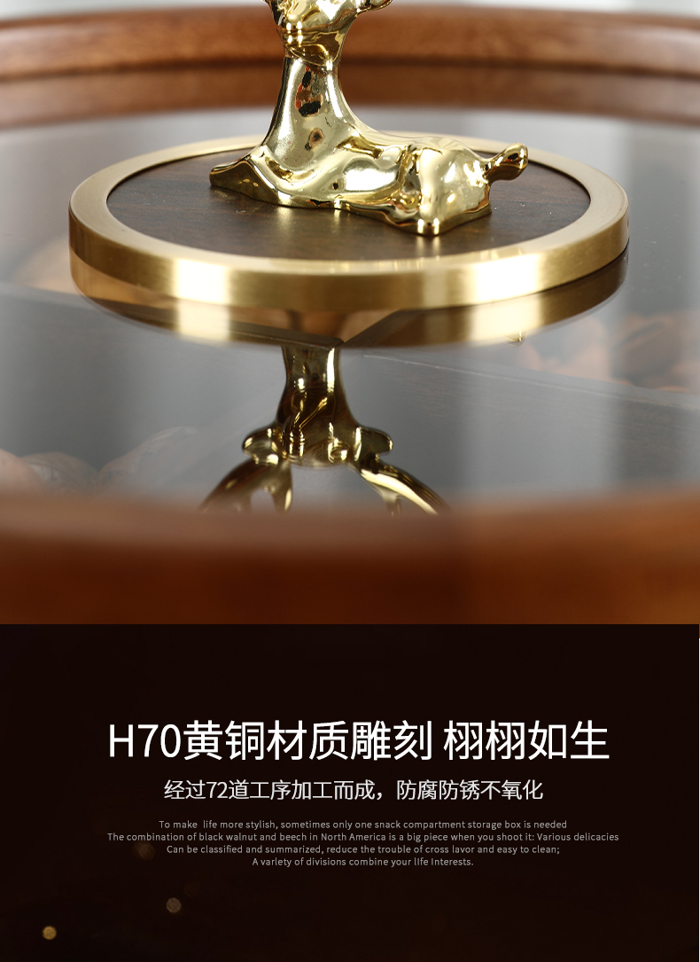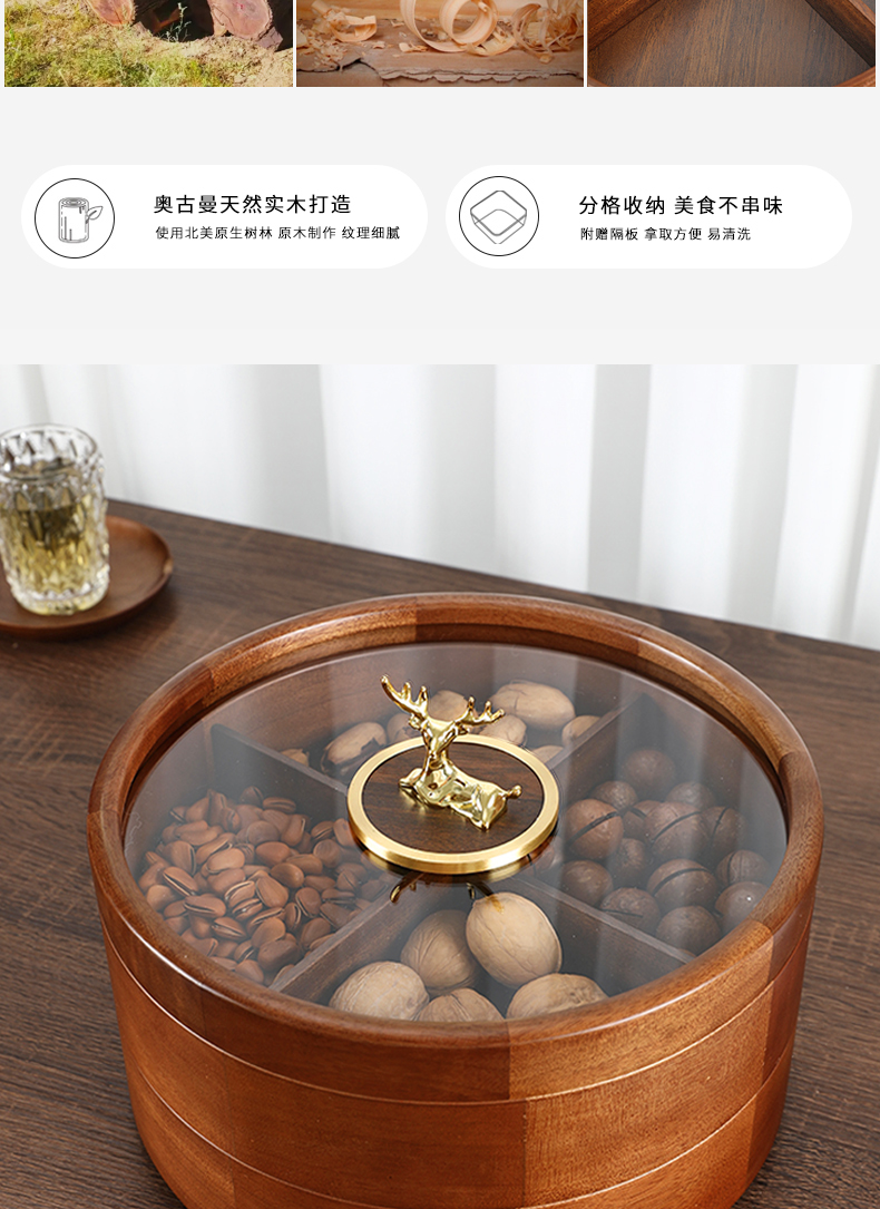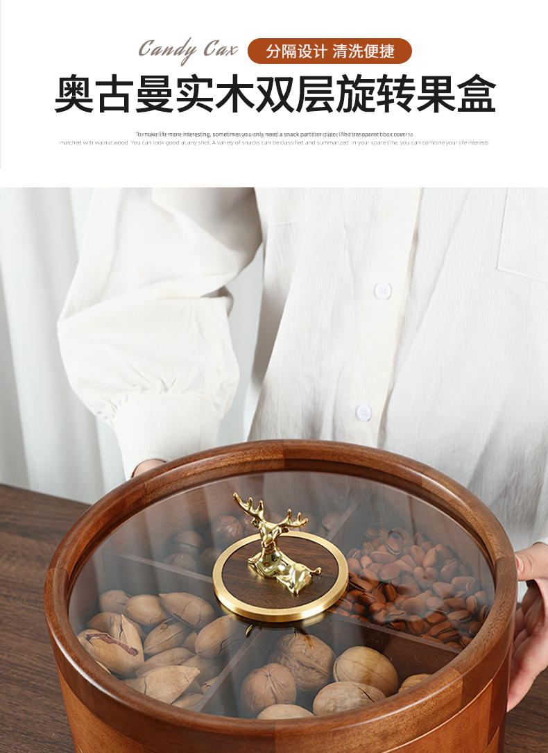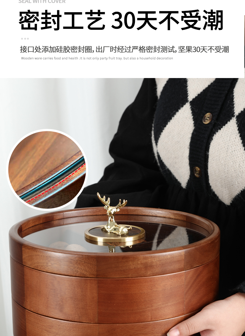 新款密封实木干果盒客厅家用茶几坚果瓜子果盘轻奢高档收纳盒铜鹿头透明盖 胡桃木旋转果盒 糖果盒 首饰盒 单双层收纳