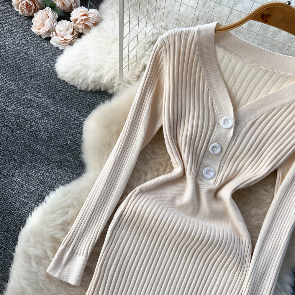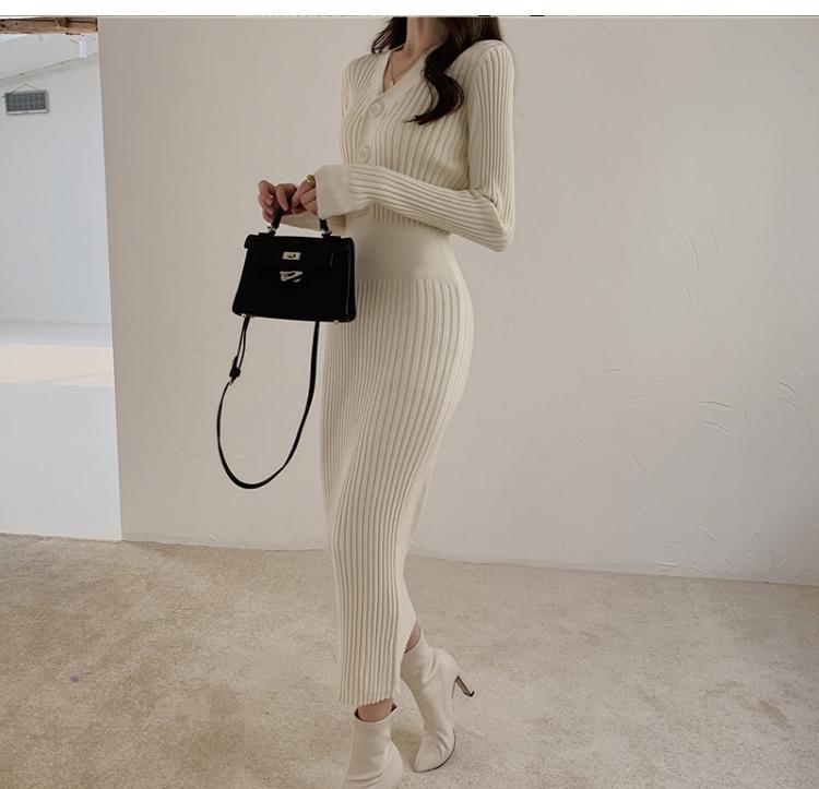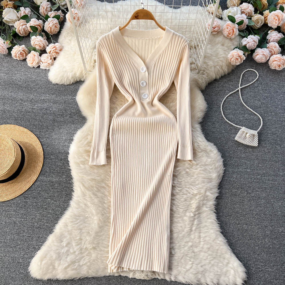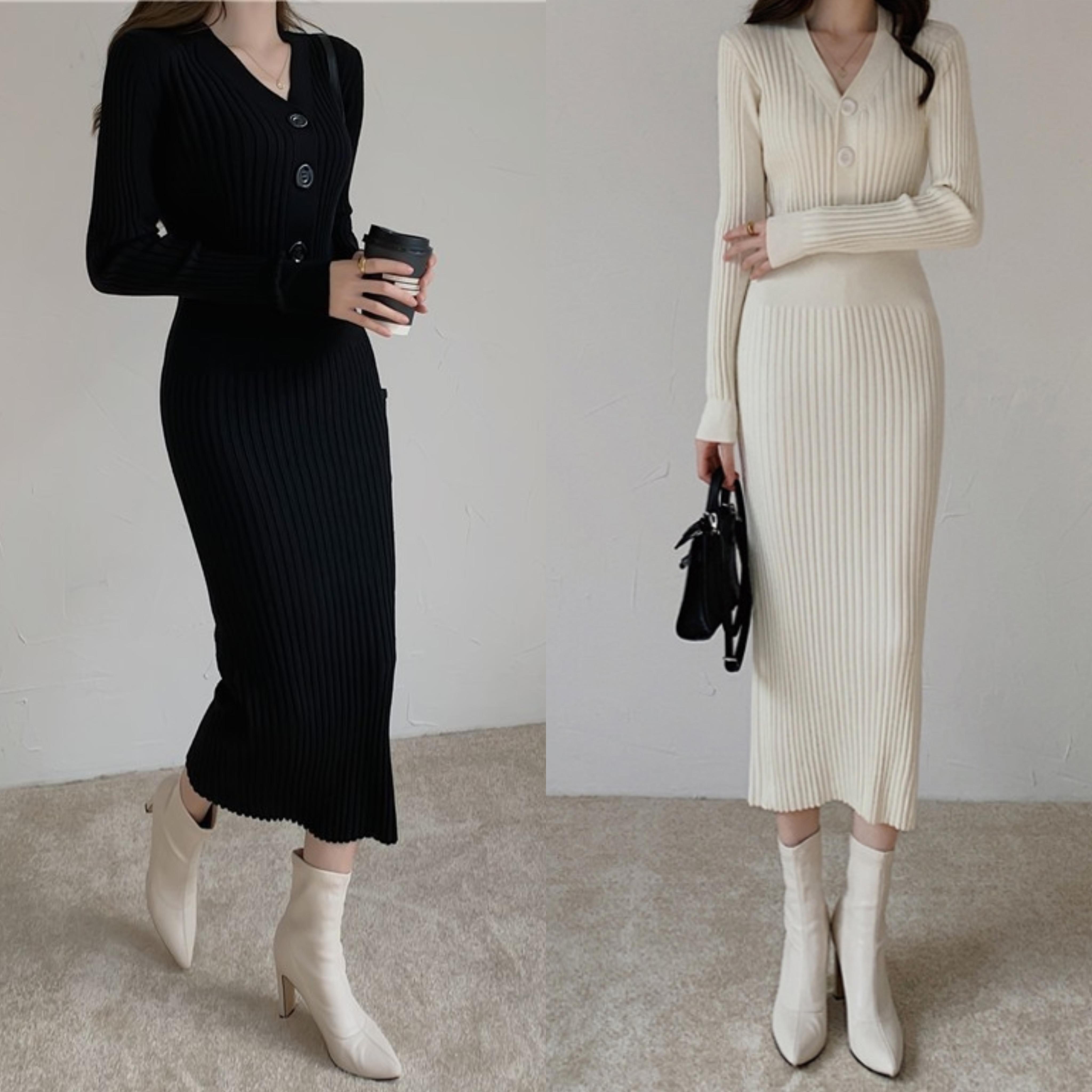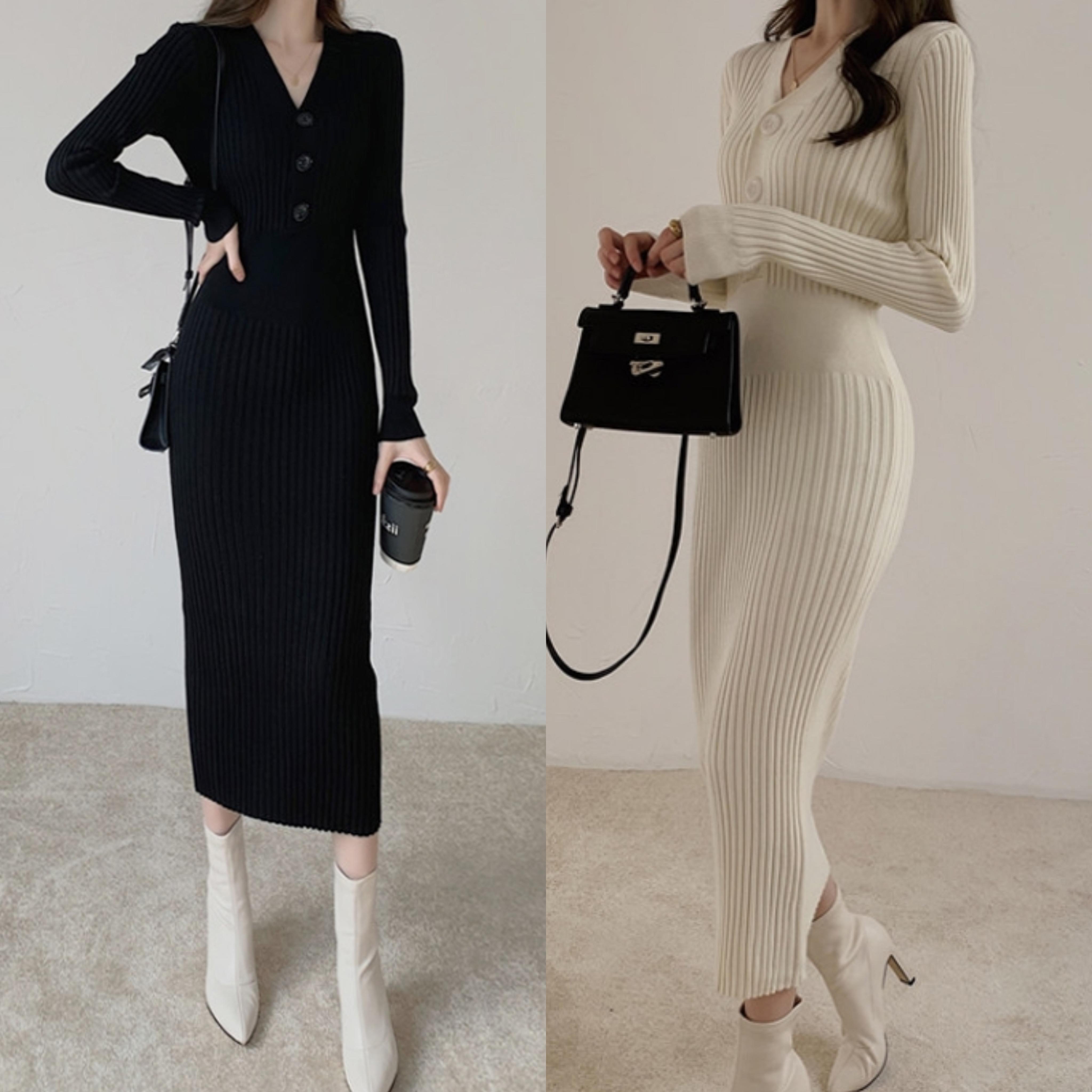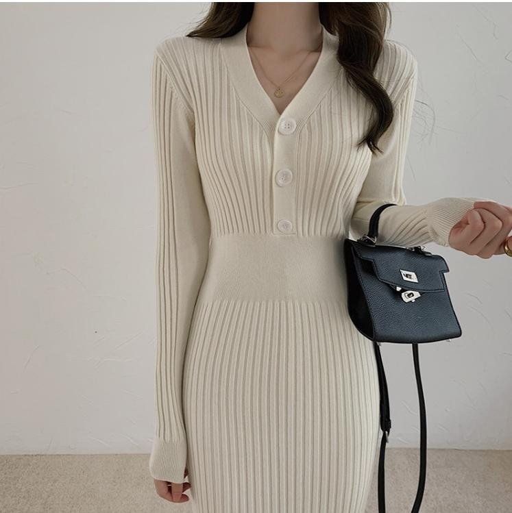 【商品名称】毛衣裙v领纽扣针织长袖连衣裙 黑色/杏色