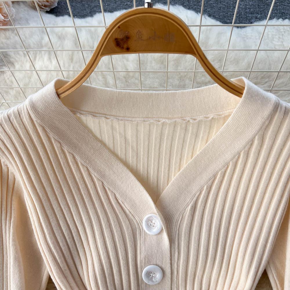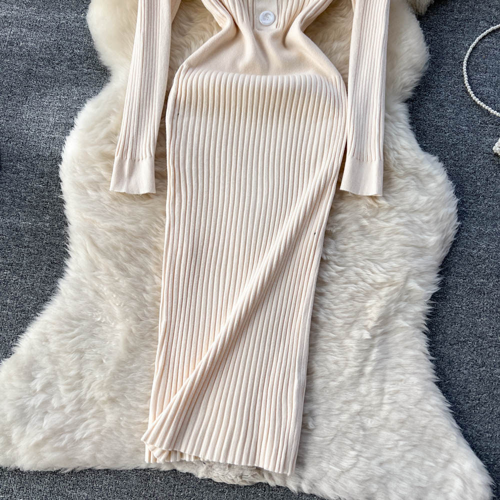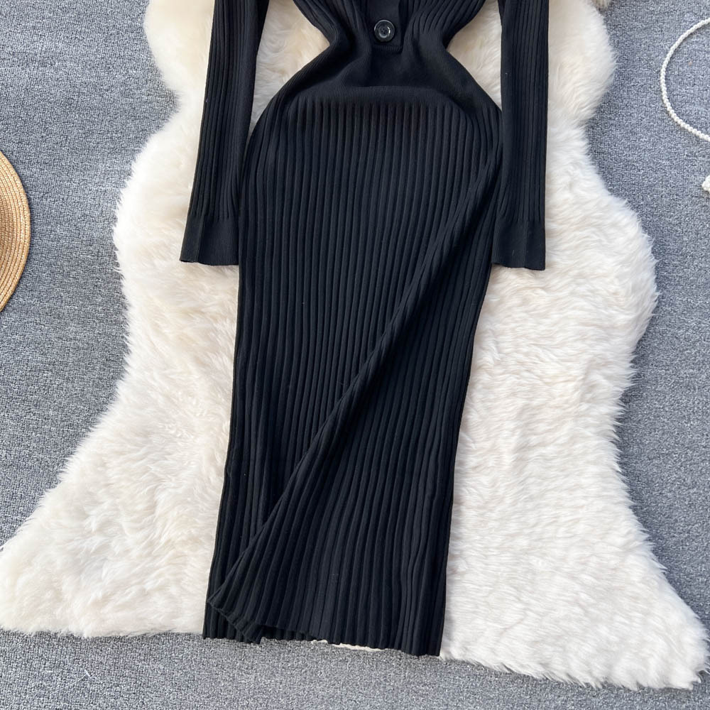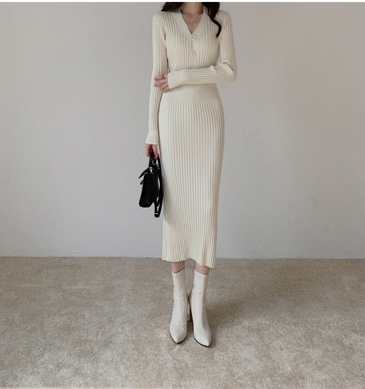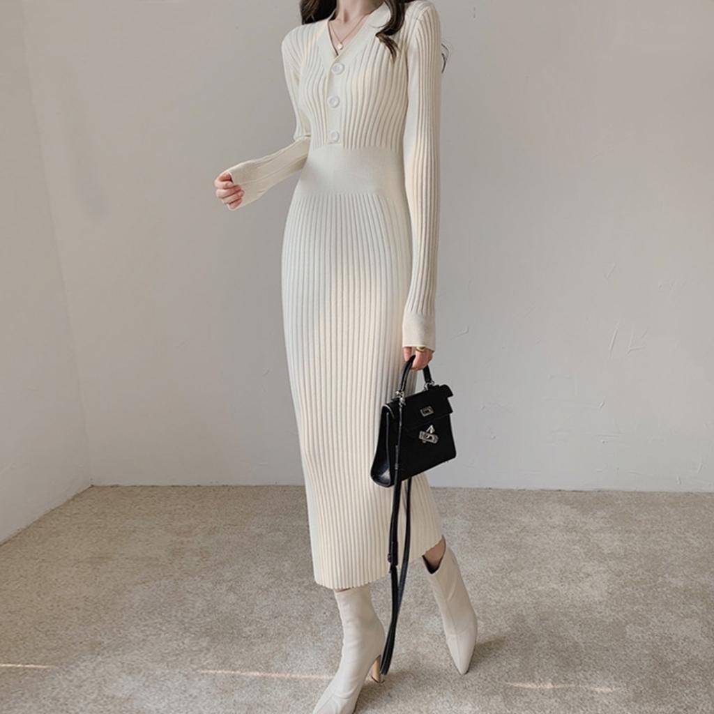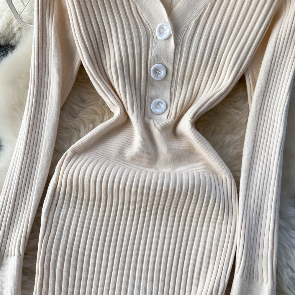【商品名称】毛衣裙v领纽扣针织长袖连衣裙 黑色/杏色