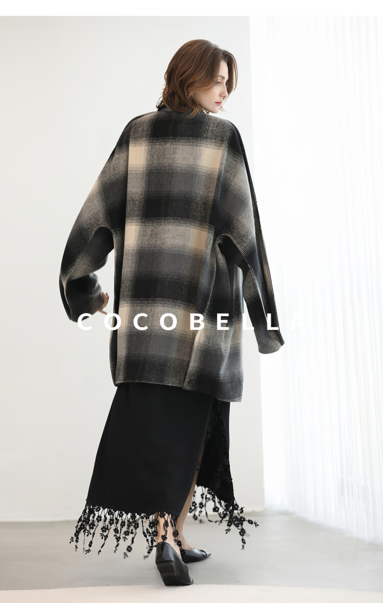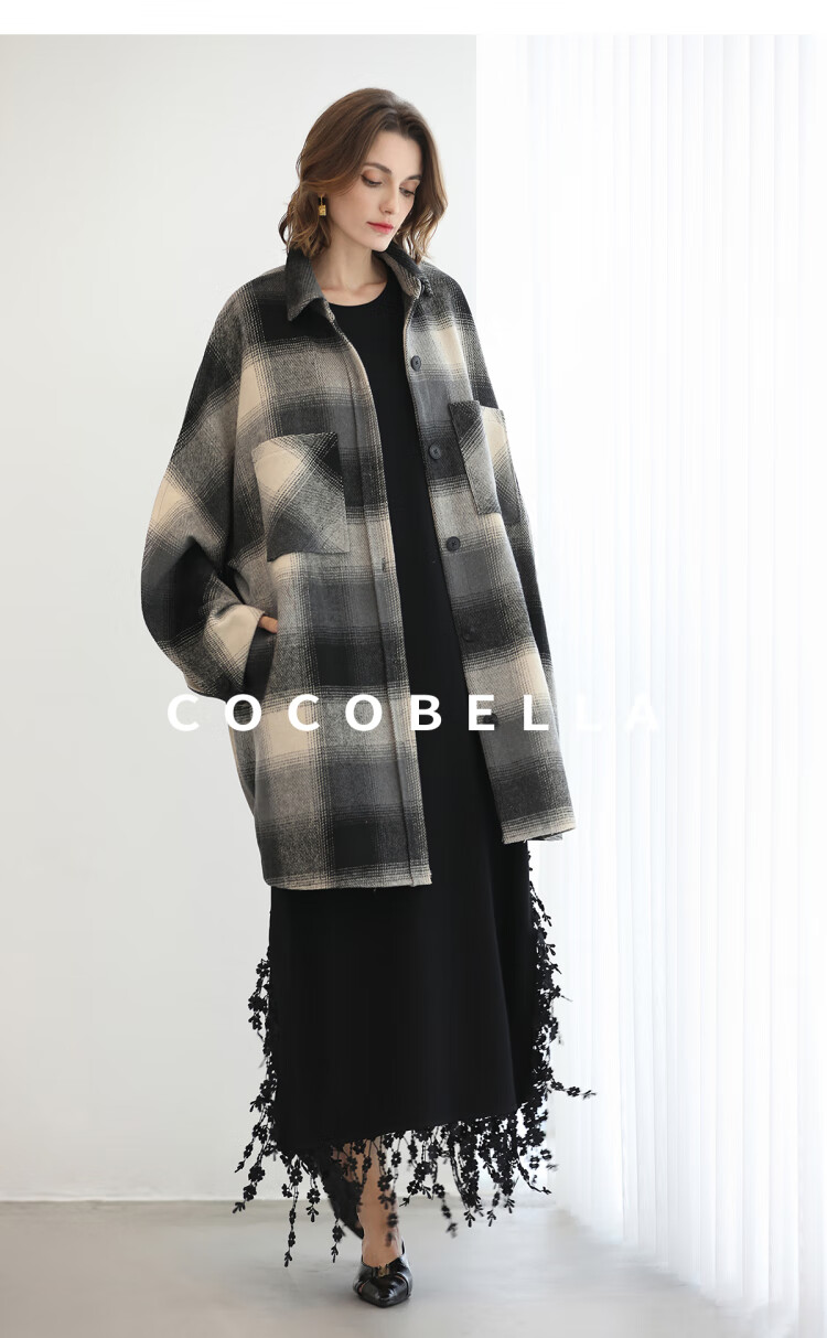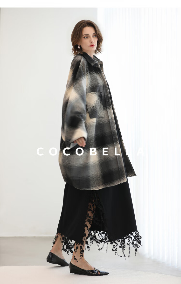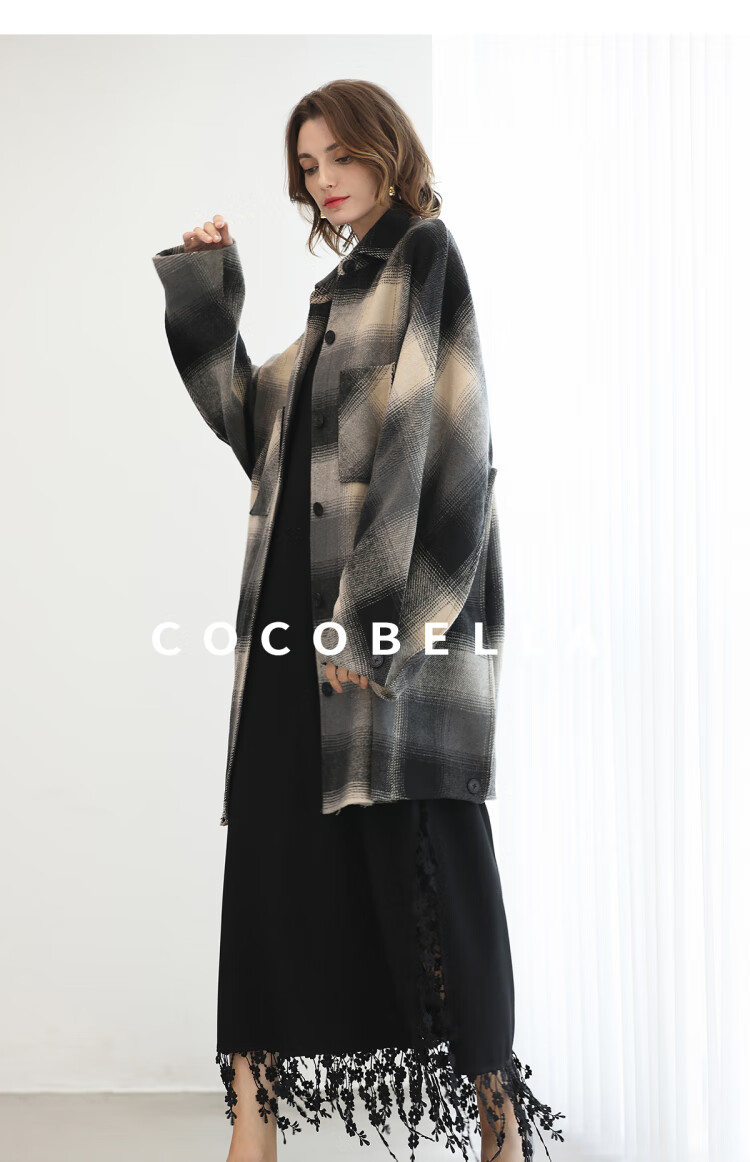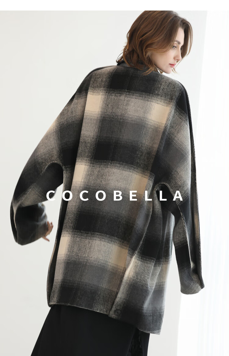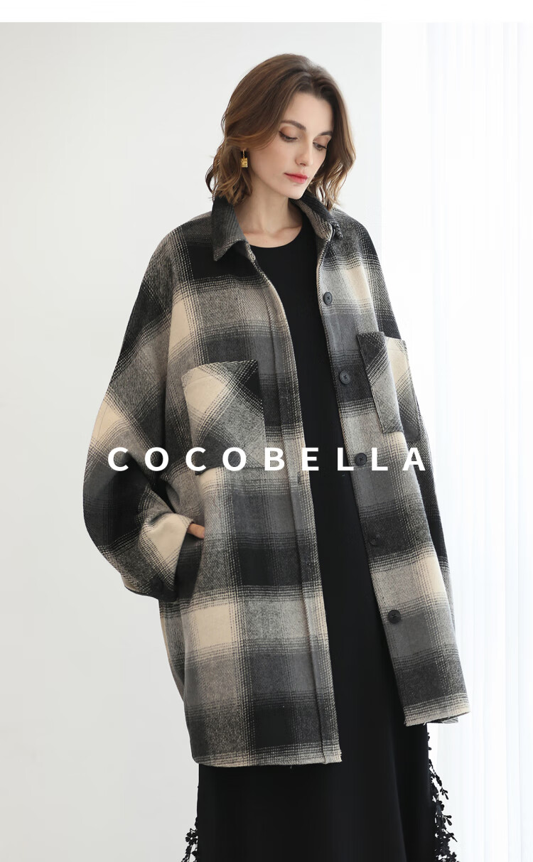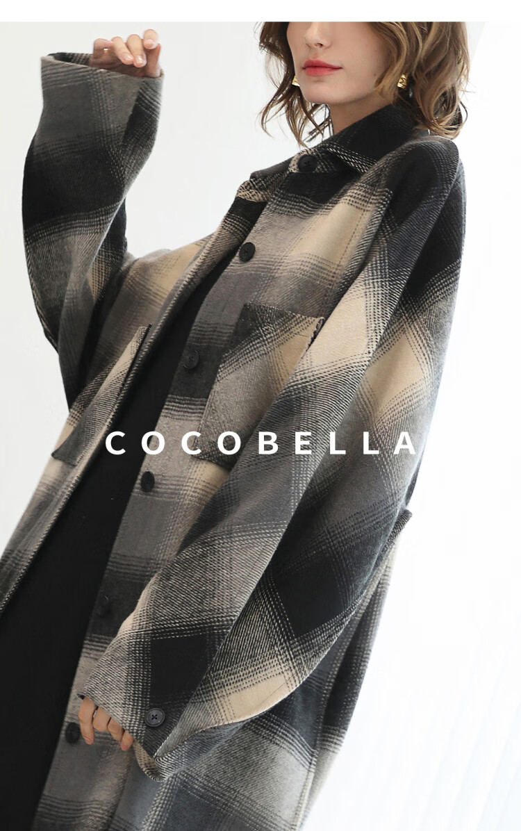 COCOBELLA英伦风格子毛呢外套秋冬中长款翻领呢子大衣WL3223