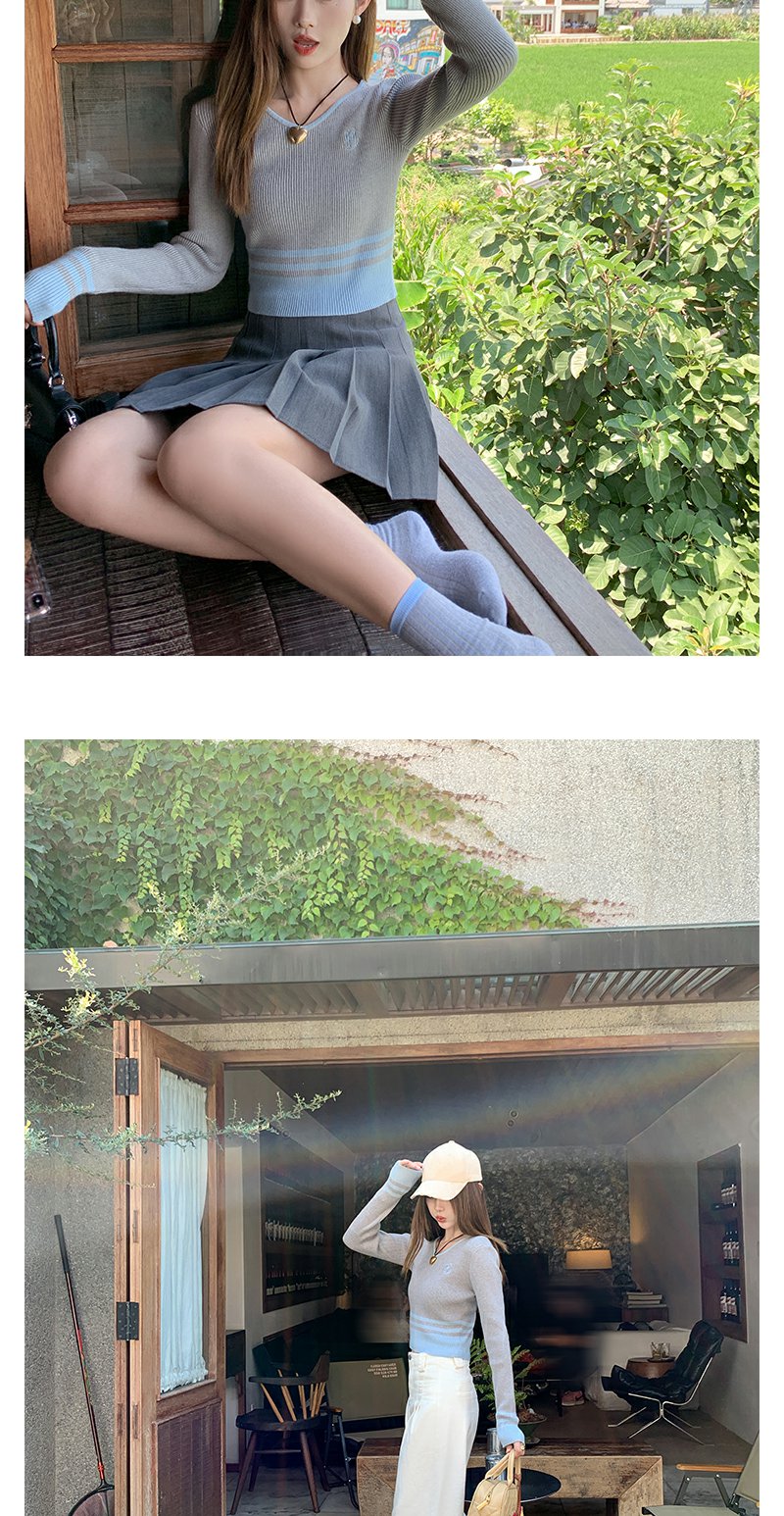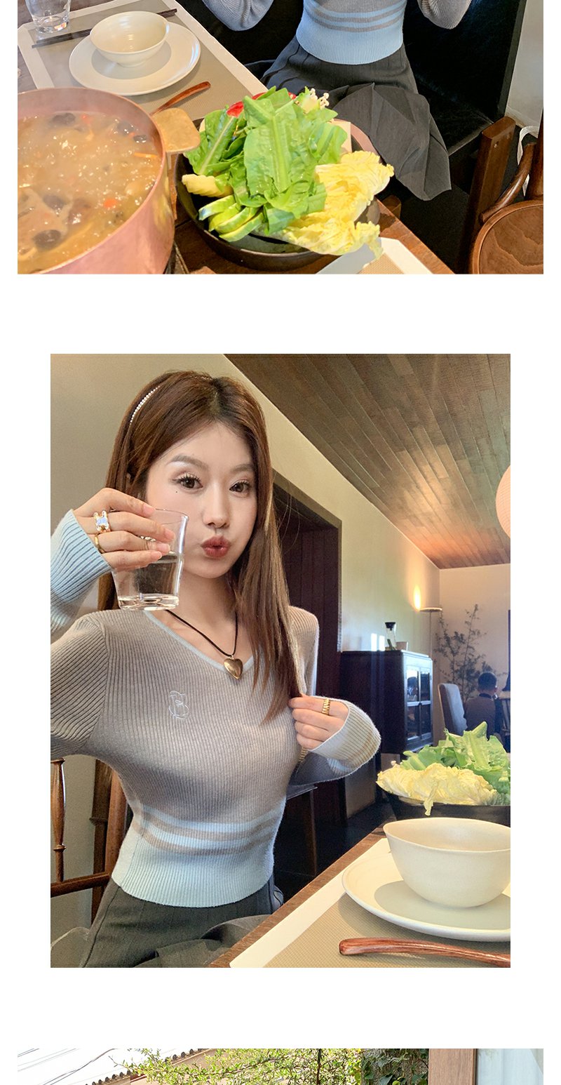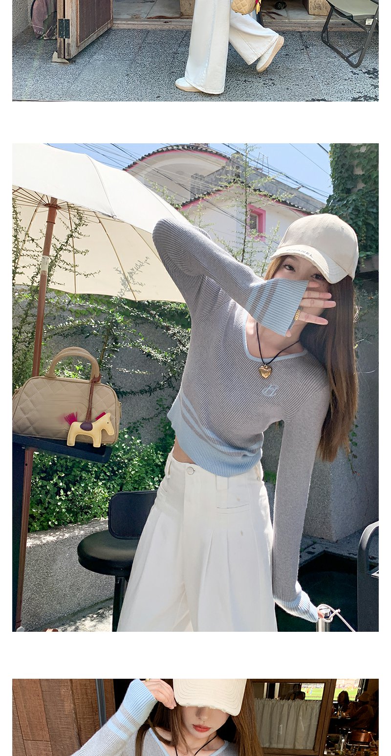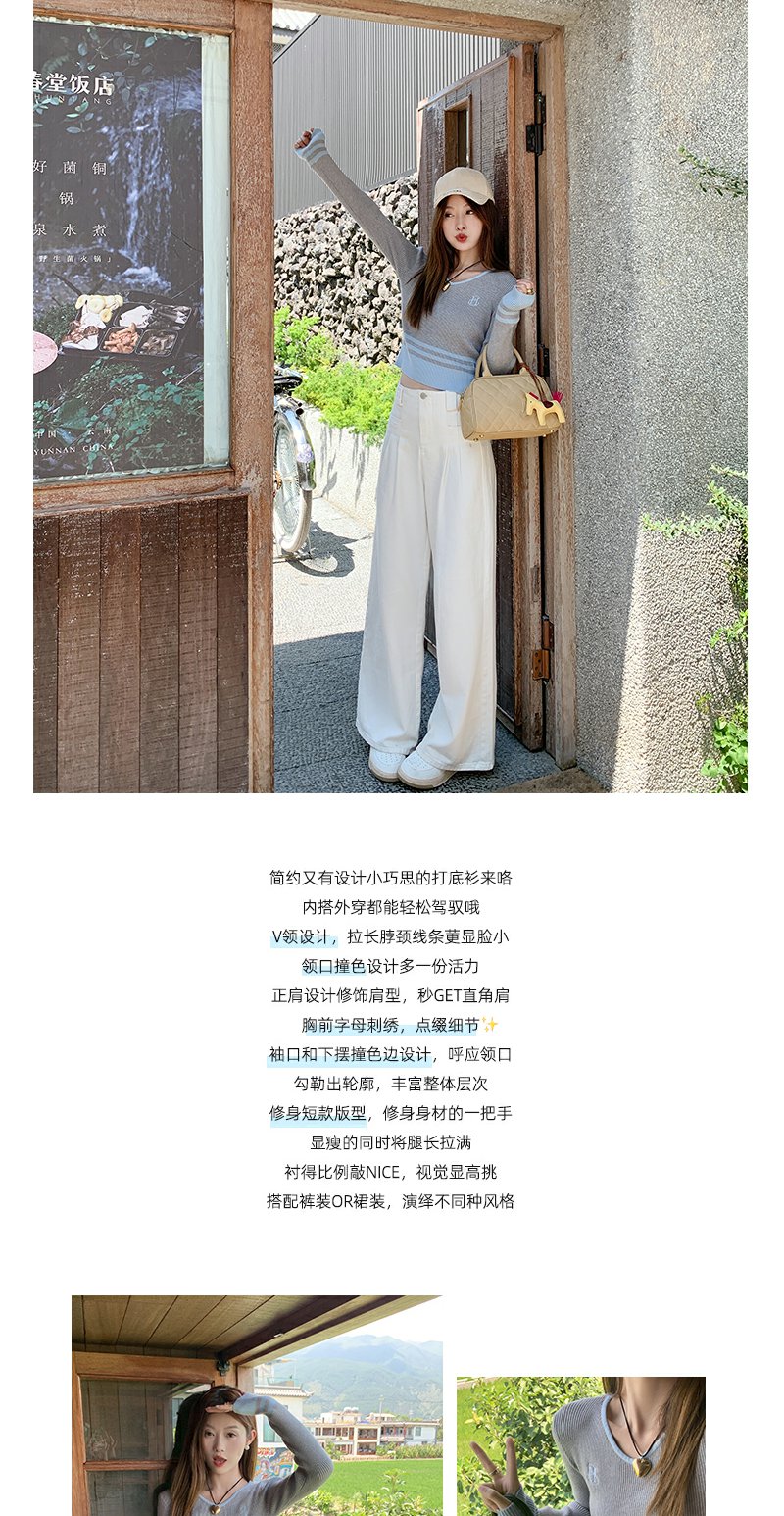 <曾小咸推荐> 设计感撞色拼接灰色短款V领打底衫