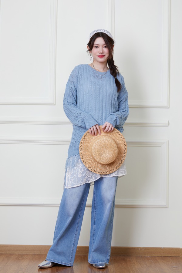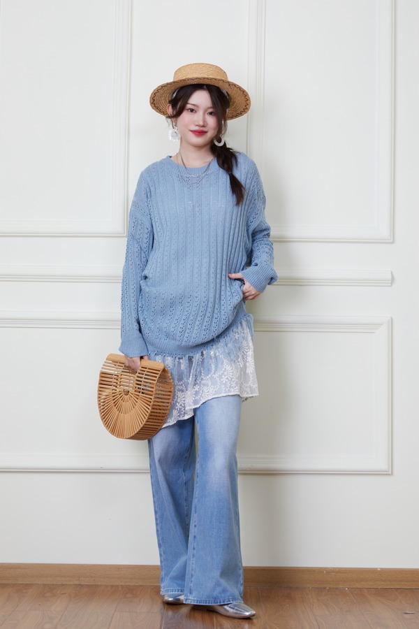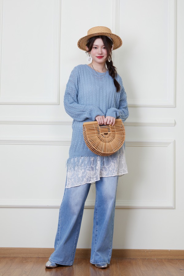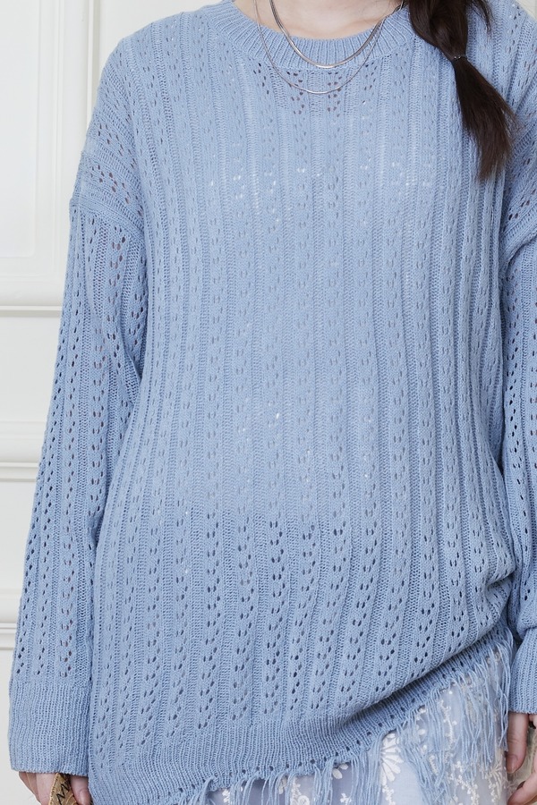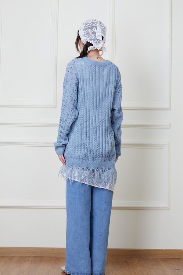 LNNNS 蓝色钩针镂空流苏针织衫 20127