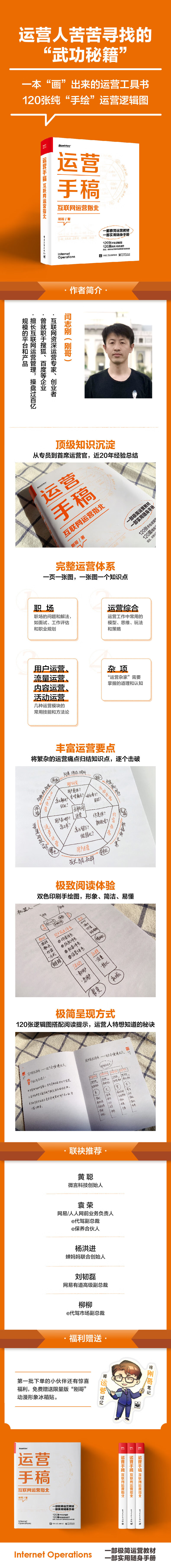 本书系统介绍了互联网运营的思维和方法。本书通过120张手绘导图,从职场、运营综合、用户运营、流量运营、内容运营、活动运营、杂项等7个方面,清晰、立体、直观、高效地提炼解决运营问题的各种认知、思维、方法和思路。本书遵循“一图胜千言”的理念,将复杂的认知逻辑知识用简单的图形加以呈现。从事互联网运营的初学者及老手阅读本书后,可以系统理解运营的相关知识,对职业发展有更清晰的规划。从事数字化转型的传统企业管理者阅读本书后,会更加了解运营,制订企业KPI时会更加有的放矢。