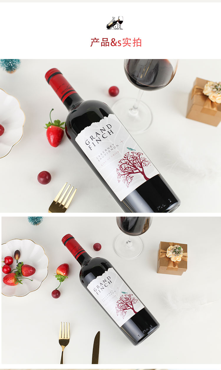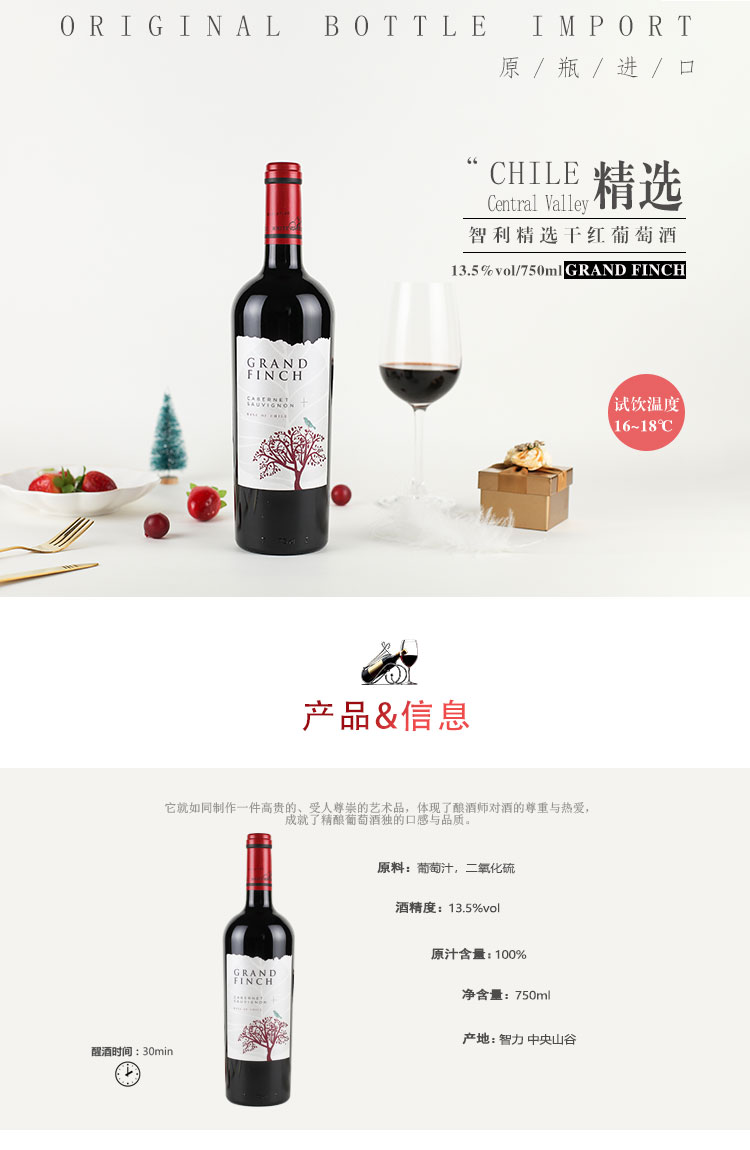 格兰雀赤霞珠干红葡萄酒 智利 中央山谷 原瓶进口 13.5度 750ml 单瓶装(整箱为6瓶)