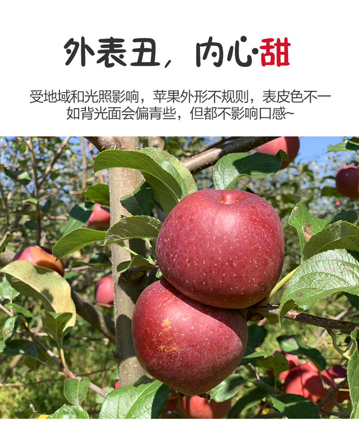 【产品规格】 丑苹果5斤大果约12内, 丑苹果8斤中果约24内, 丑苹果8斤大果约18内;数量仅供参考,以重量为准。
