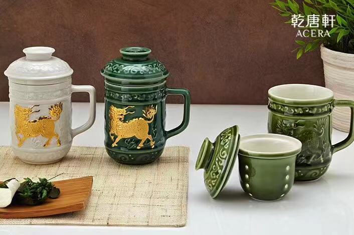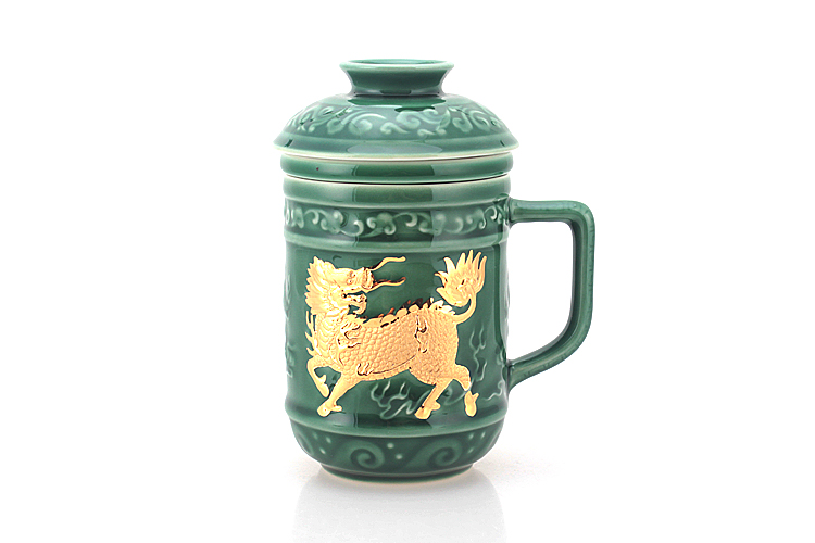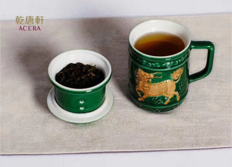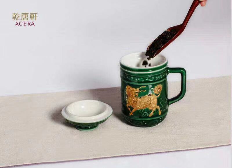 乾唐轩麒麟献瑞三件杯(翡翠绿描金380ML)