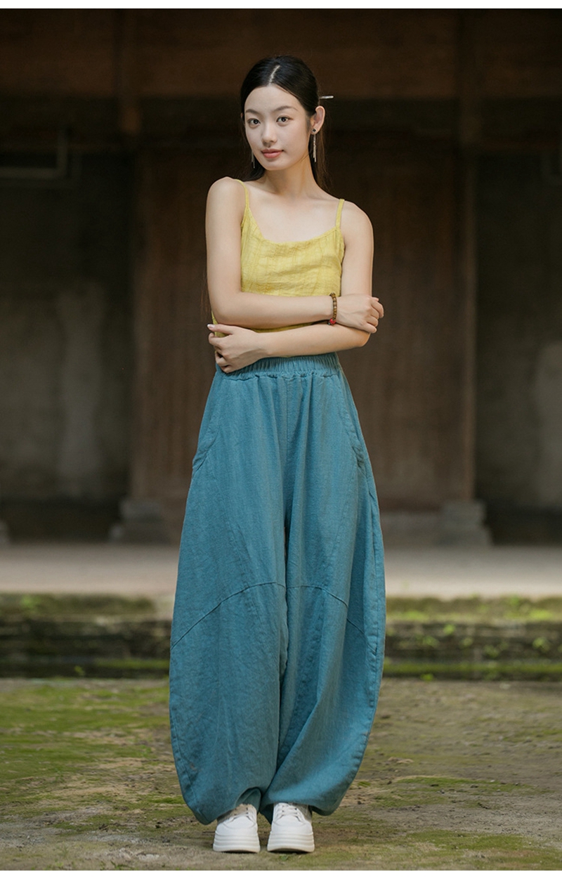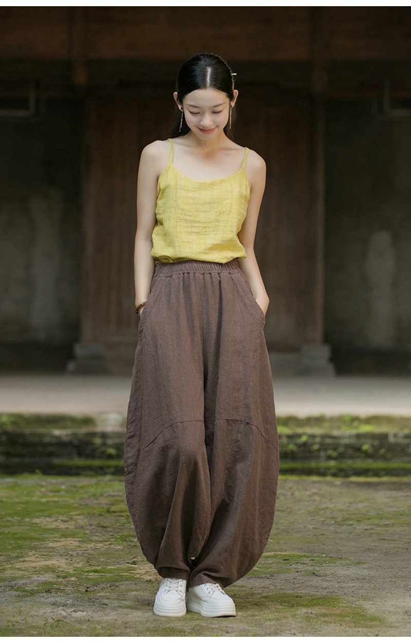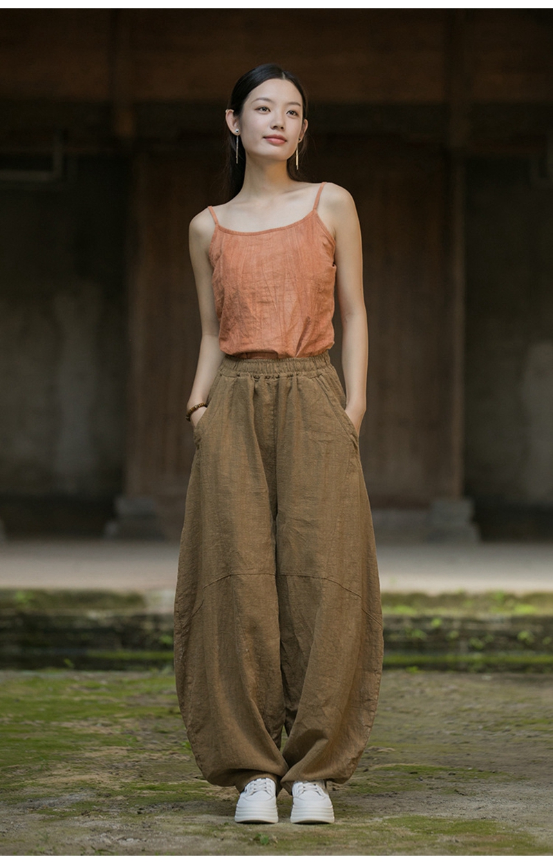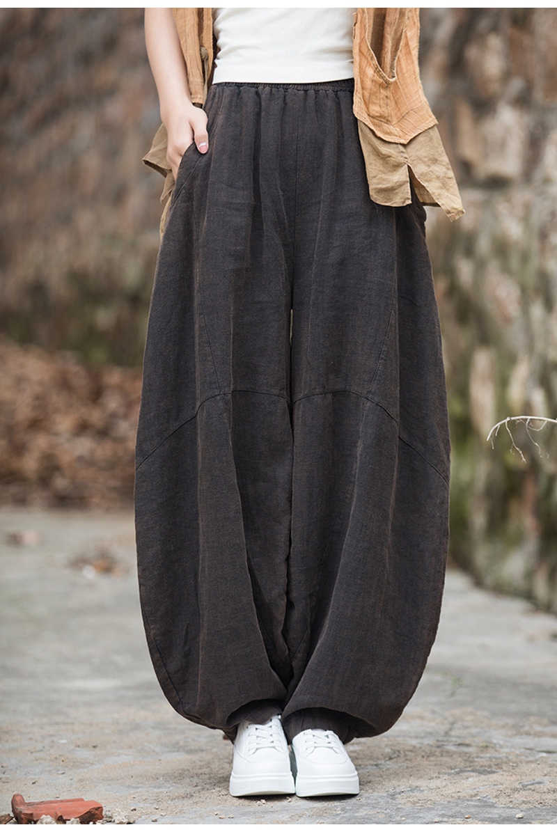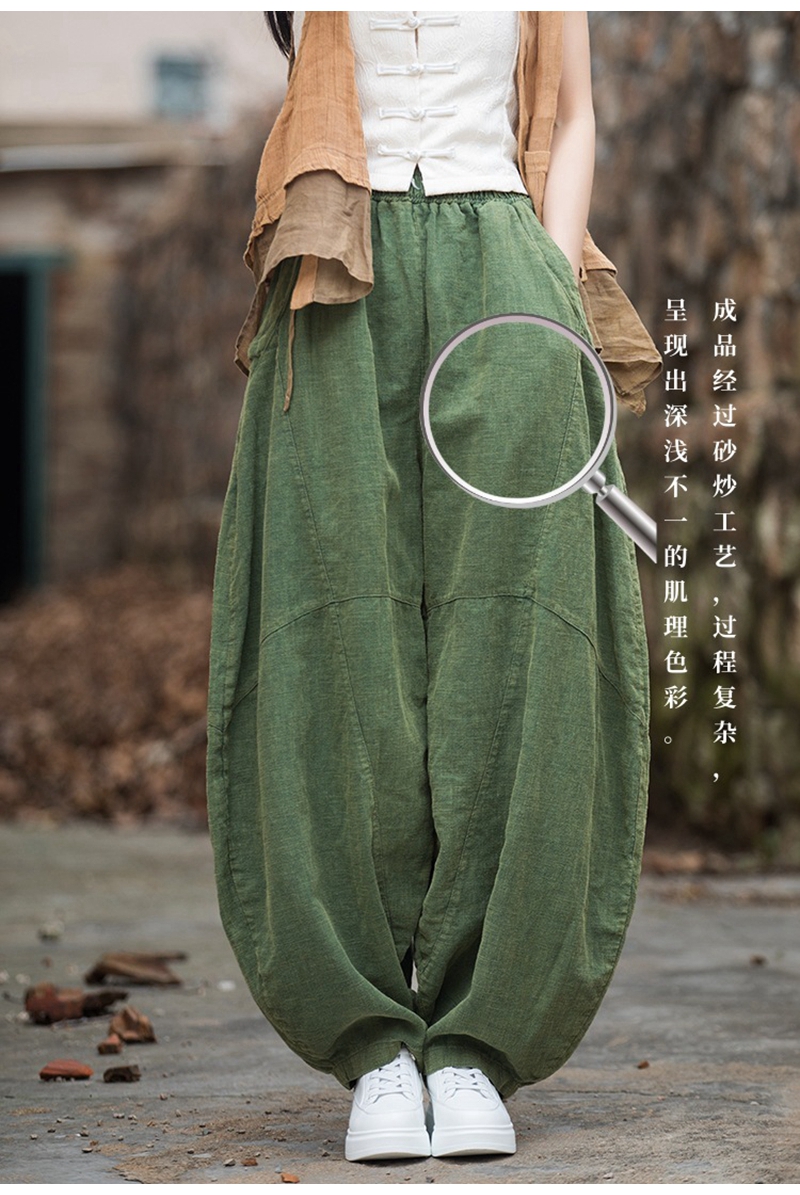 苎麻砂炒做旧垂感宽松高腰松紧腰灯笼裤