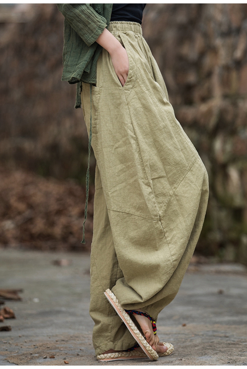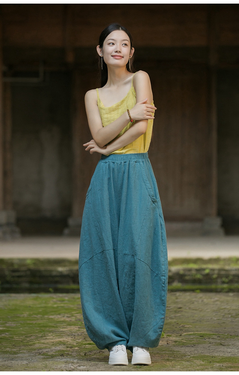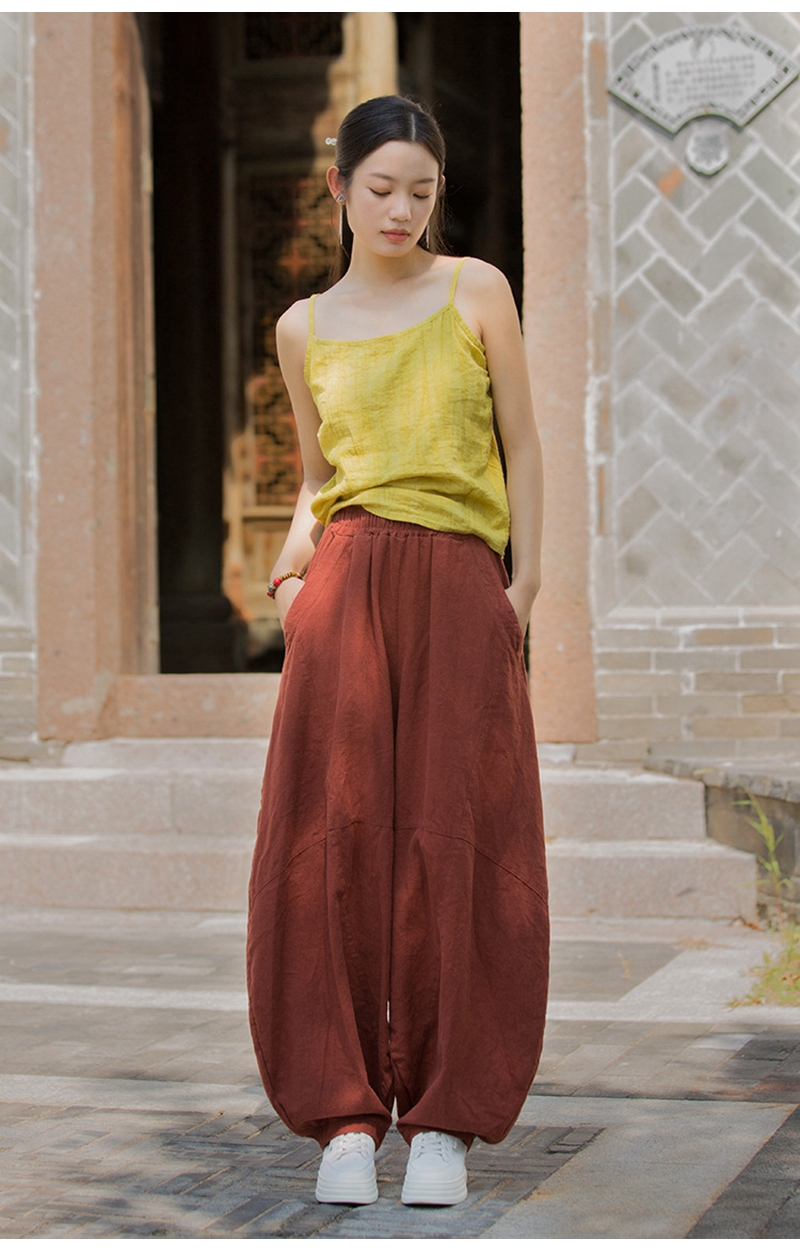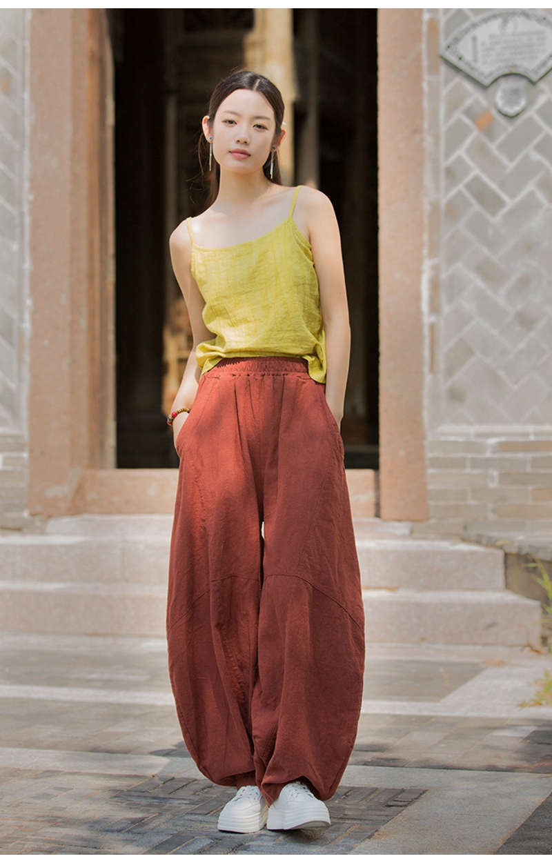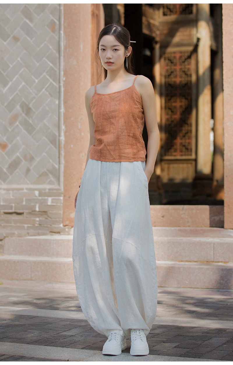 苎麻砂炒做旧垂感宽松高腰松紧腰灯笼裤