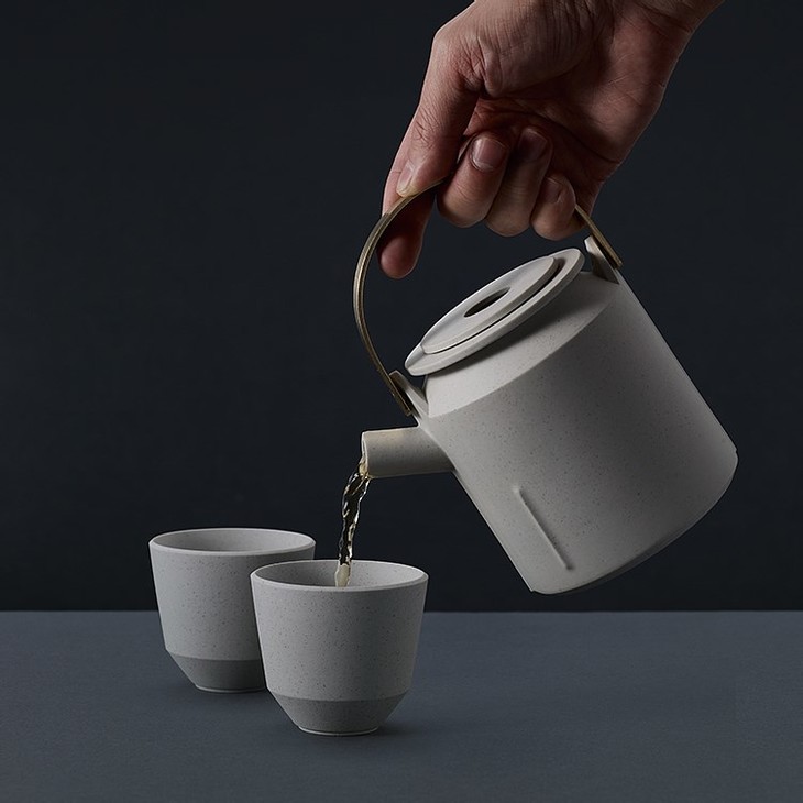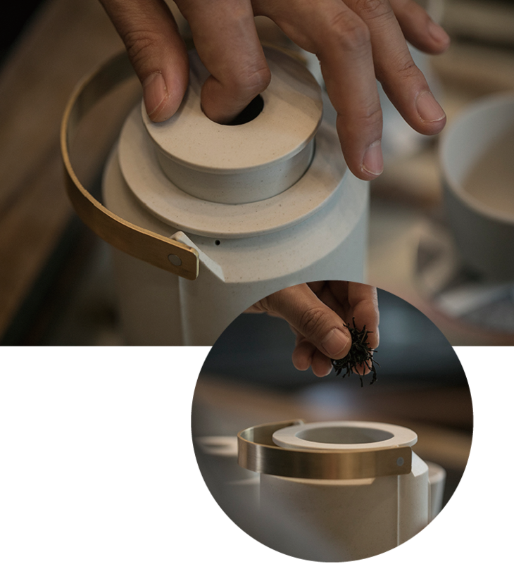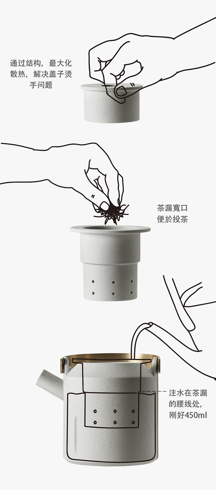 民间提梁壶的再设计,内外表面细腻无釉,容量450ml,提梁角度自由停滞,盖子孔状拎手不烫。
