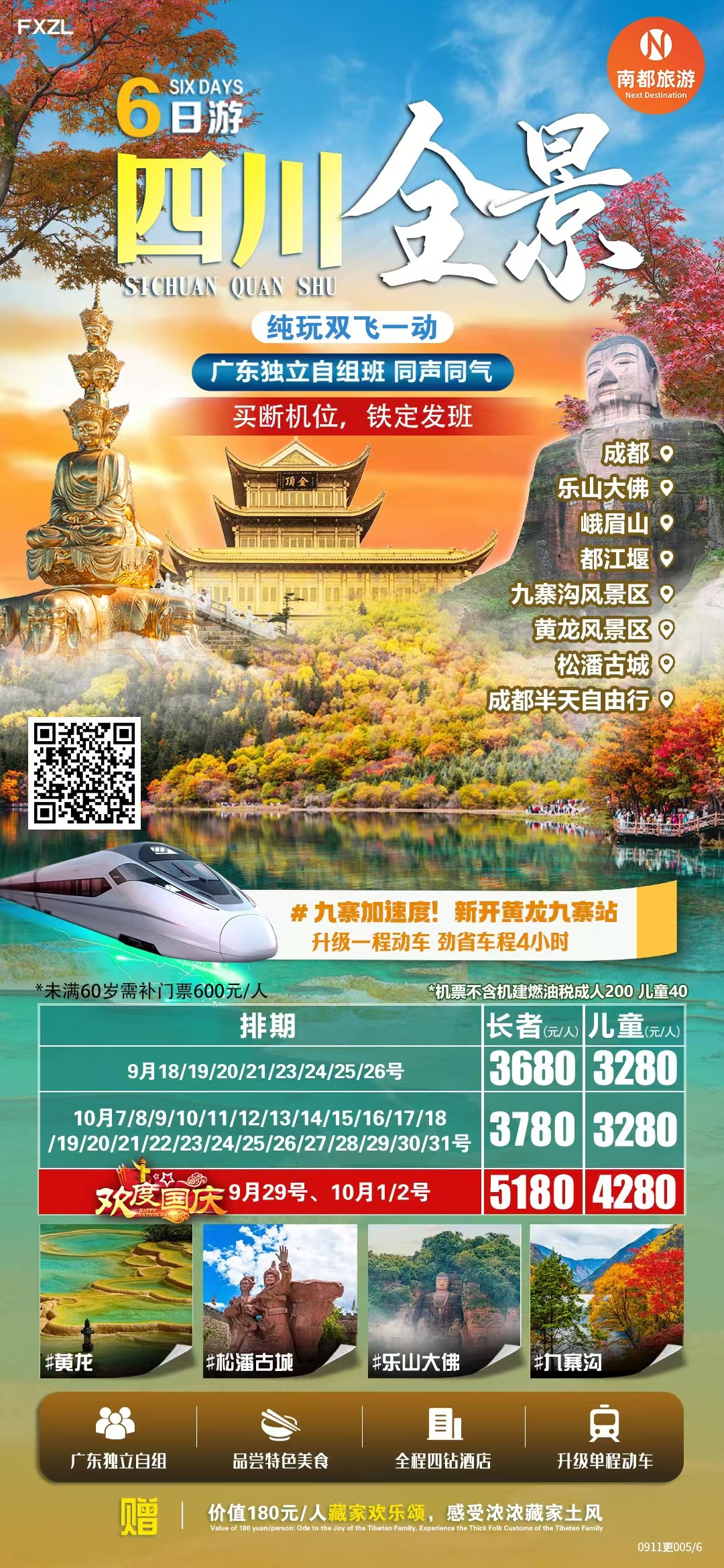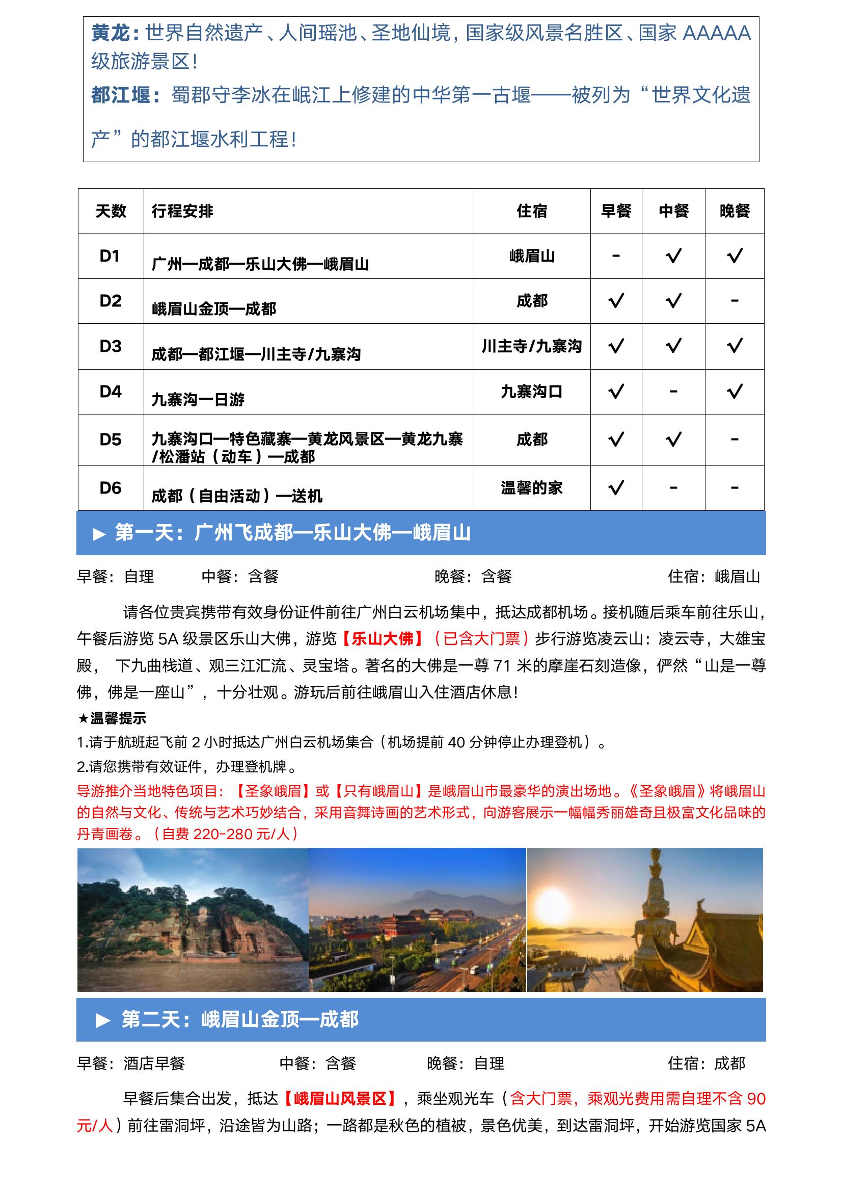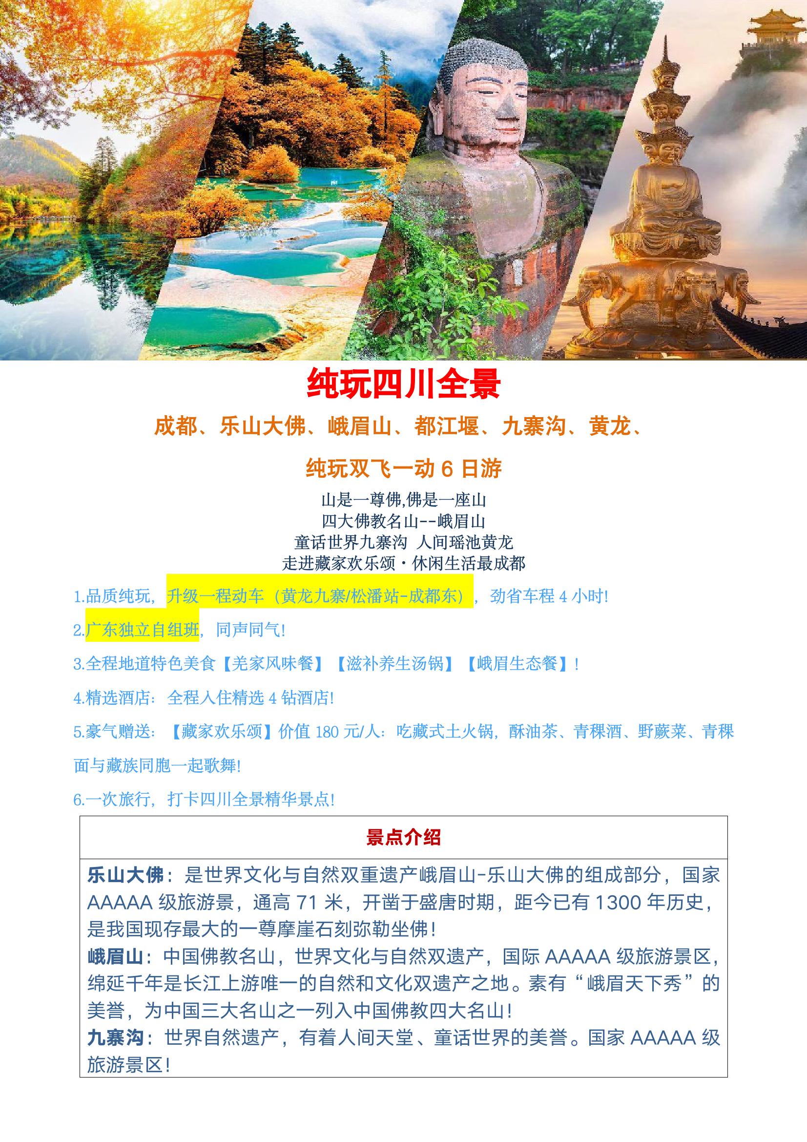 四川全景,纯玩双飞一动6天|成都|乐山大佛|都江堰|九寨沟风景区|黄龙风景区|松潘古城|成都半天自由行