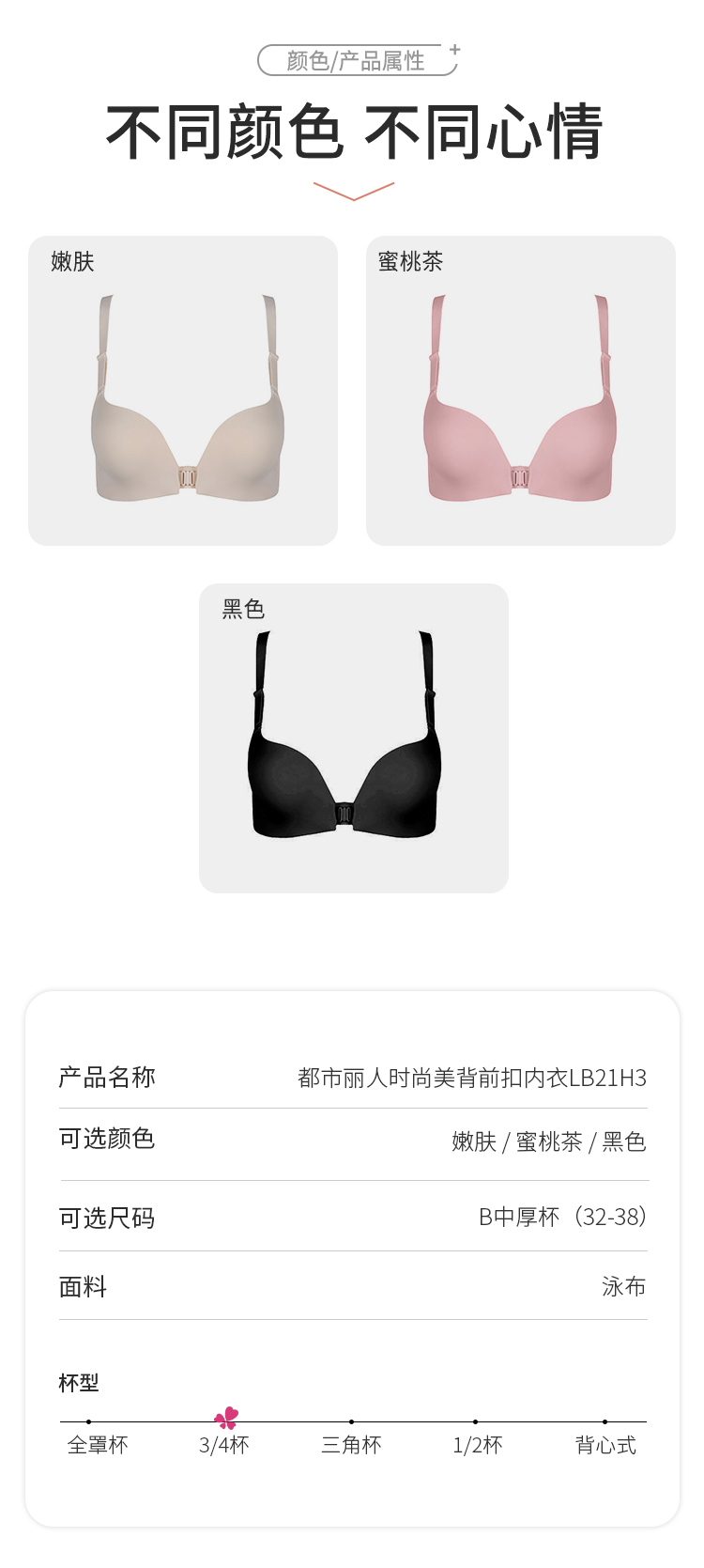 都市丽人B杯无痕内衣零压无痕中厚泳布前扣树脂胶圈3/4杯常规文胸LB21H3