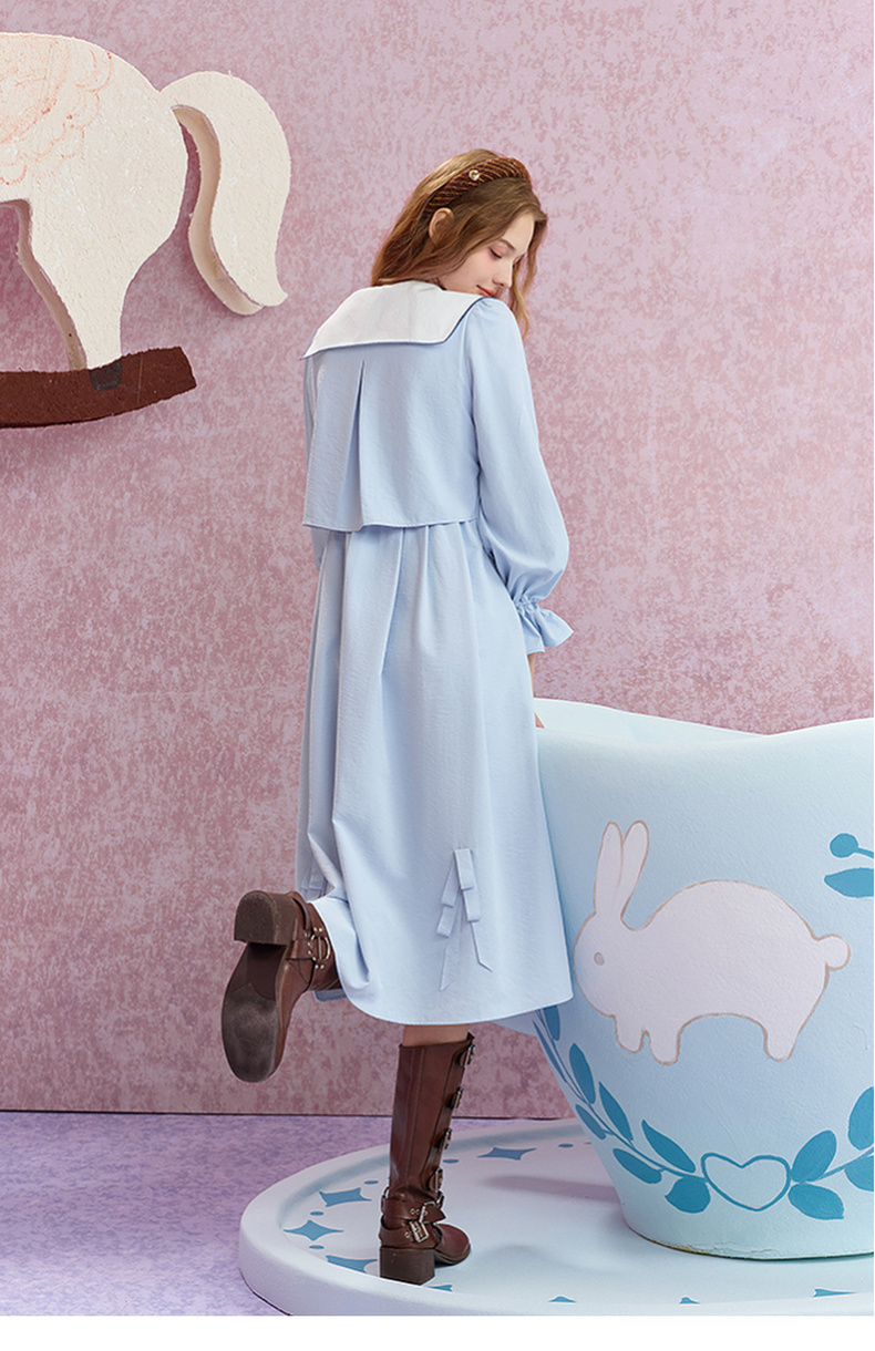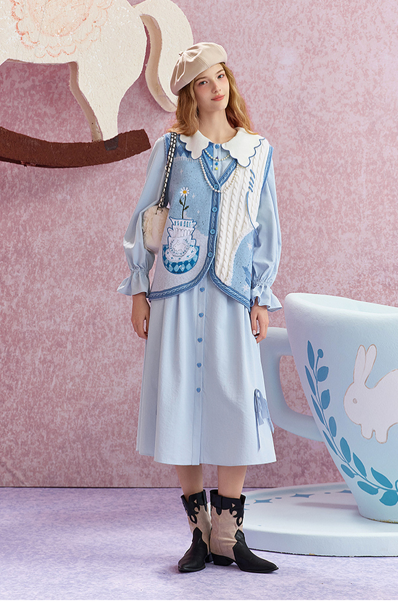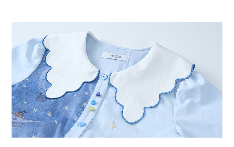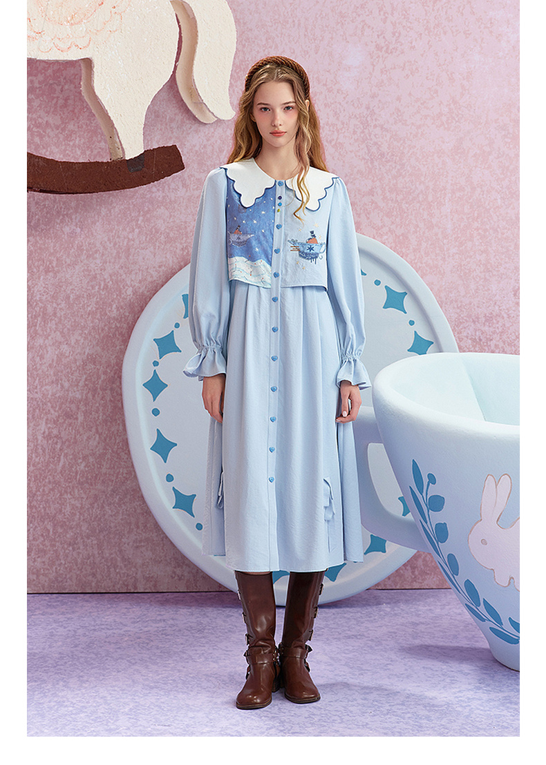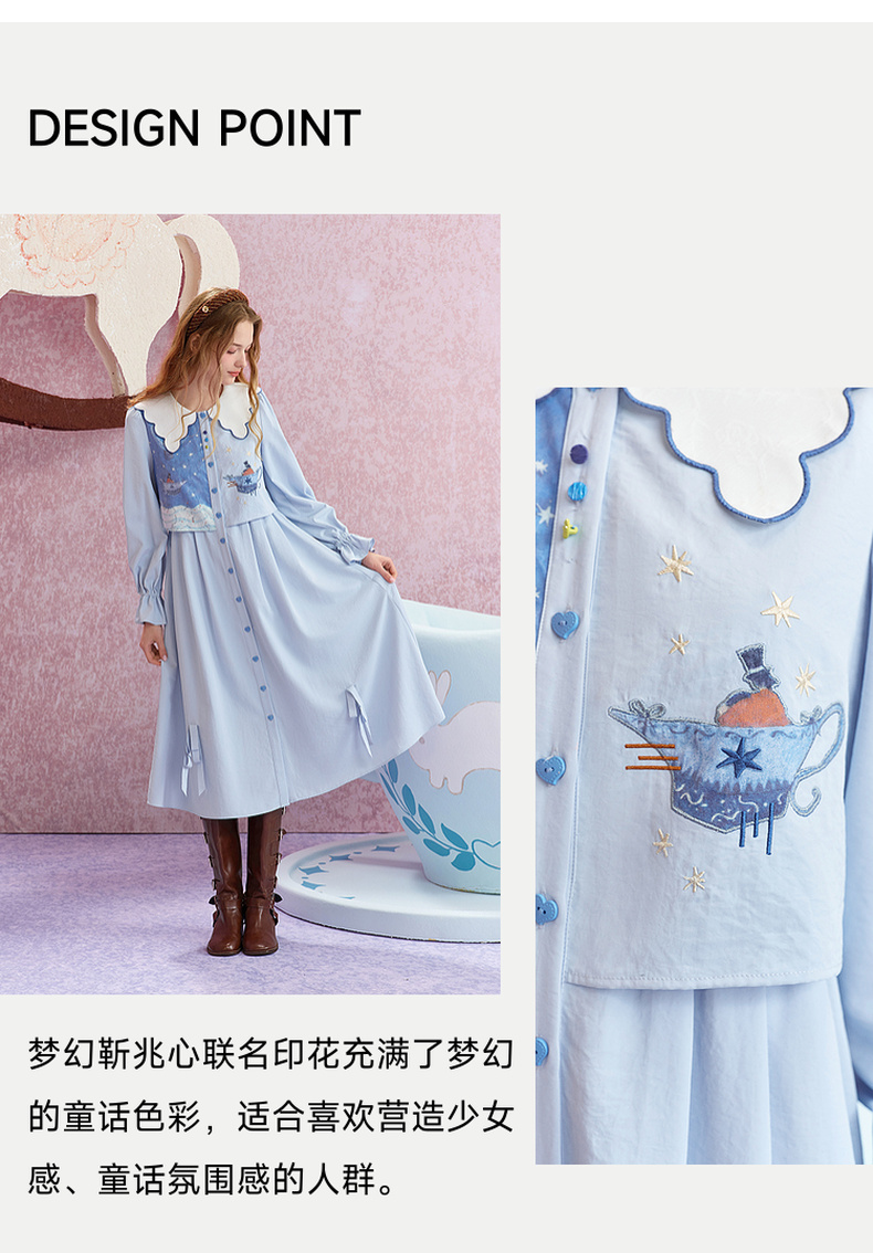两三事 星光糖纸 2025秋季新款小清新印花拼接假两件连衣裙