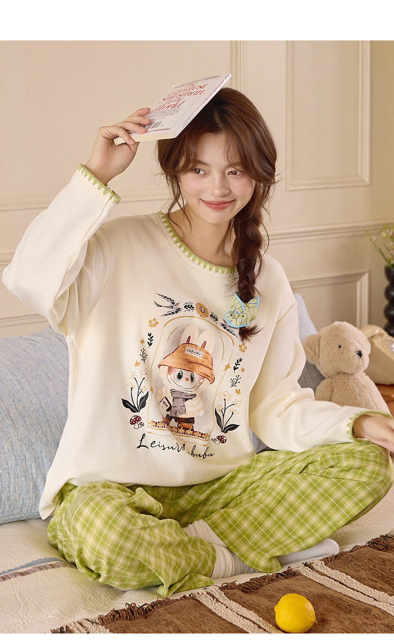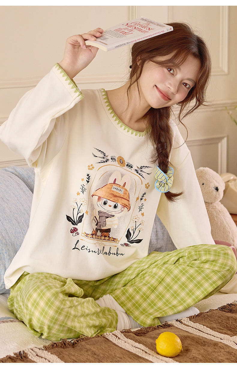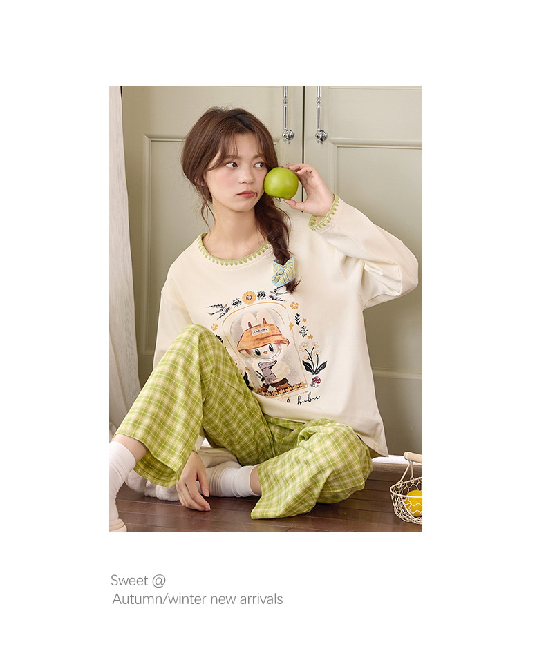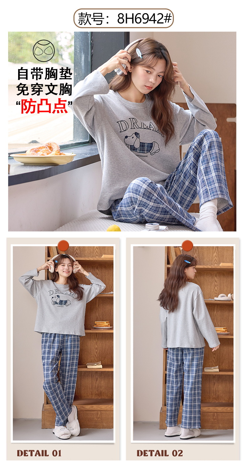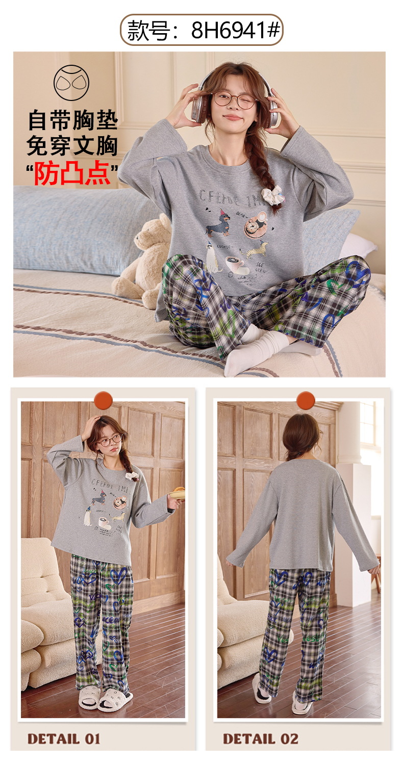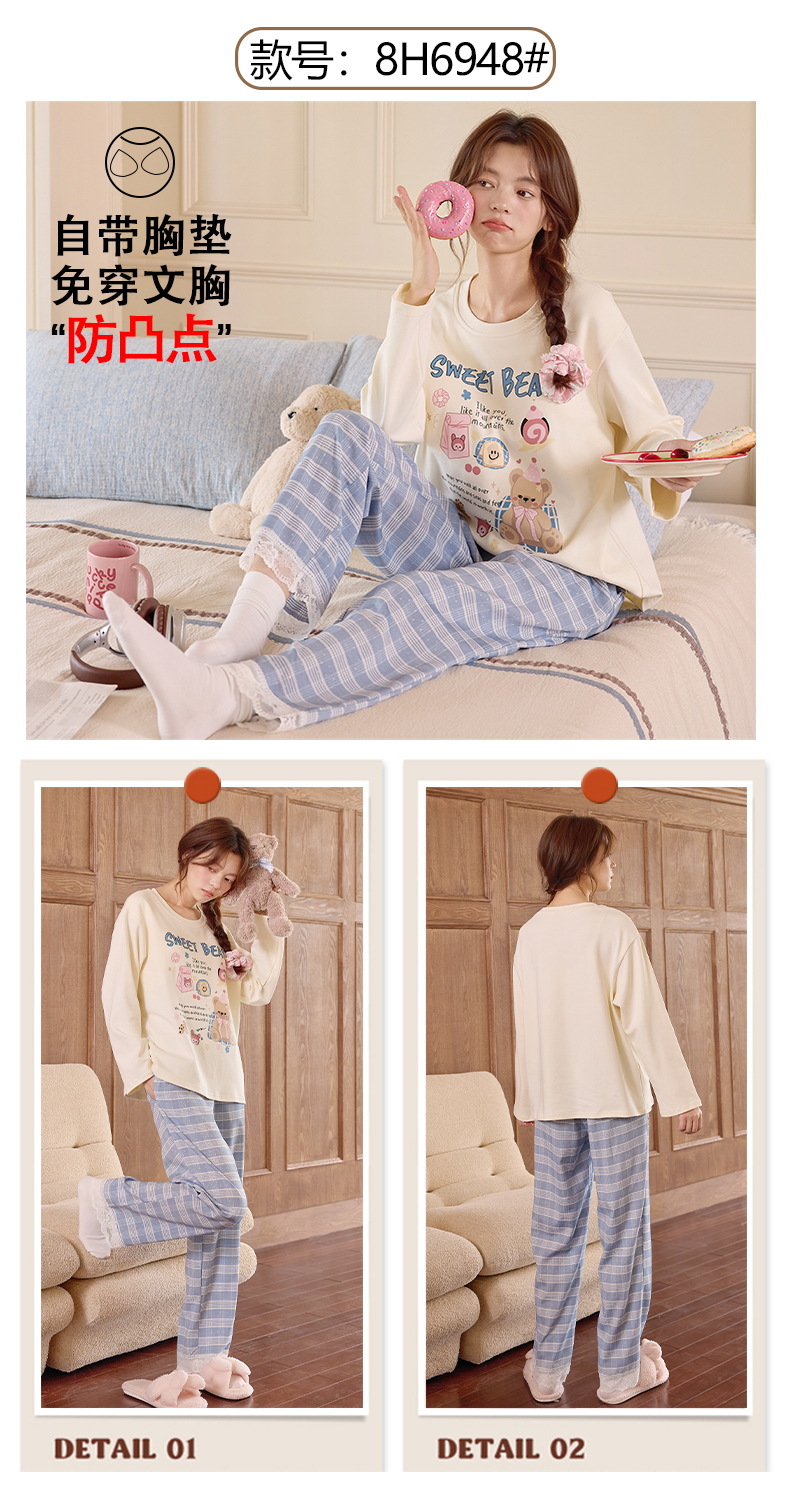 家居服新款学生可爱带胸垫睡衣女秋季套头长袖长裤甜美少女格子卡通可外穿秋冬家居服