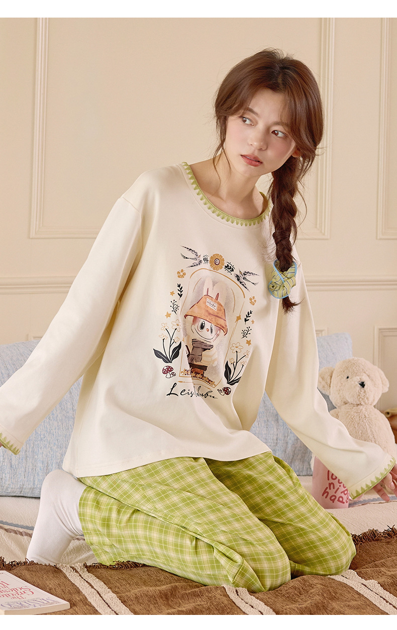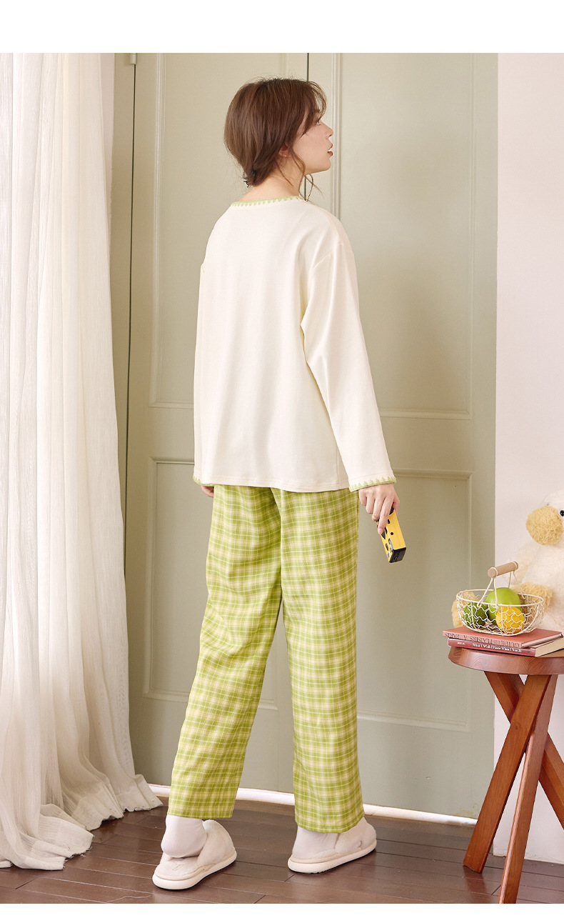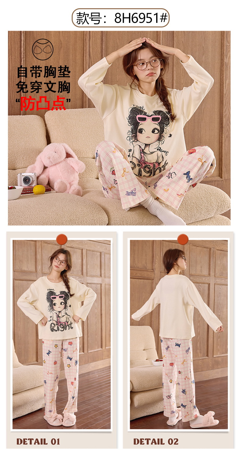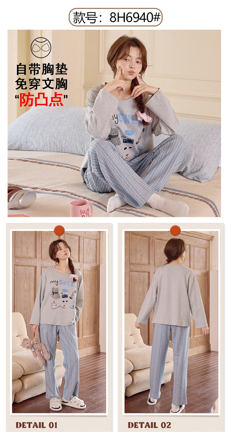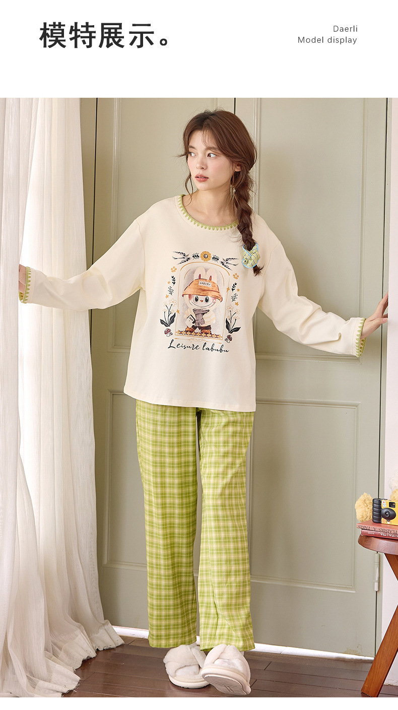 家居服新款学生可爱带胸垫睡衣女秋季套头长袖长裤甜美少女格子卡通可外穿秋冬家居服