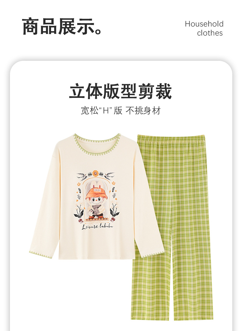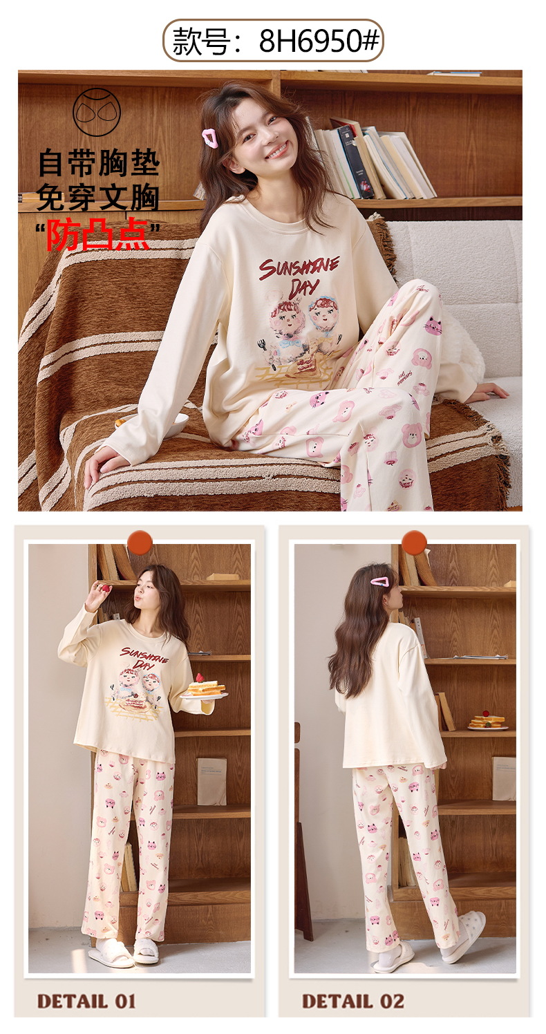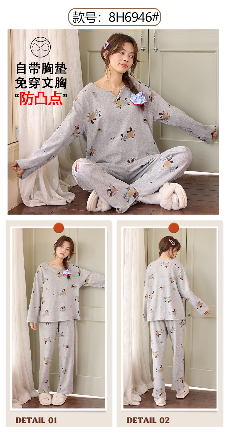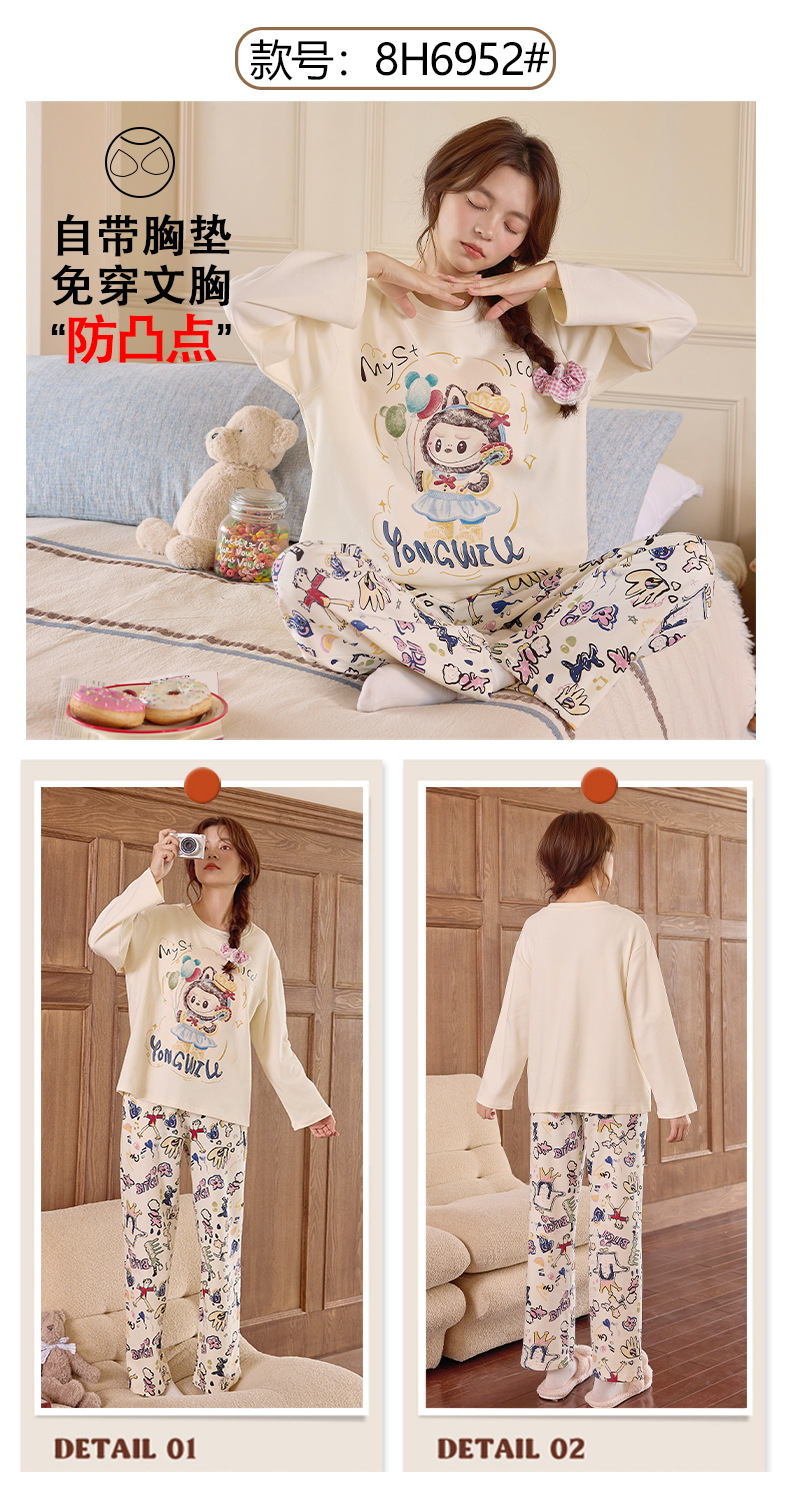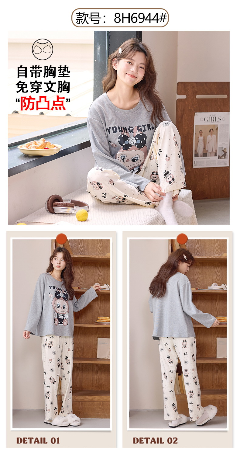 家居服新款学生可爱带胸垫睡衣女秋季套头长袖长裤甜美少女格子卡通可外穿秋冬家居服