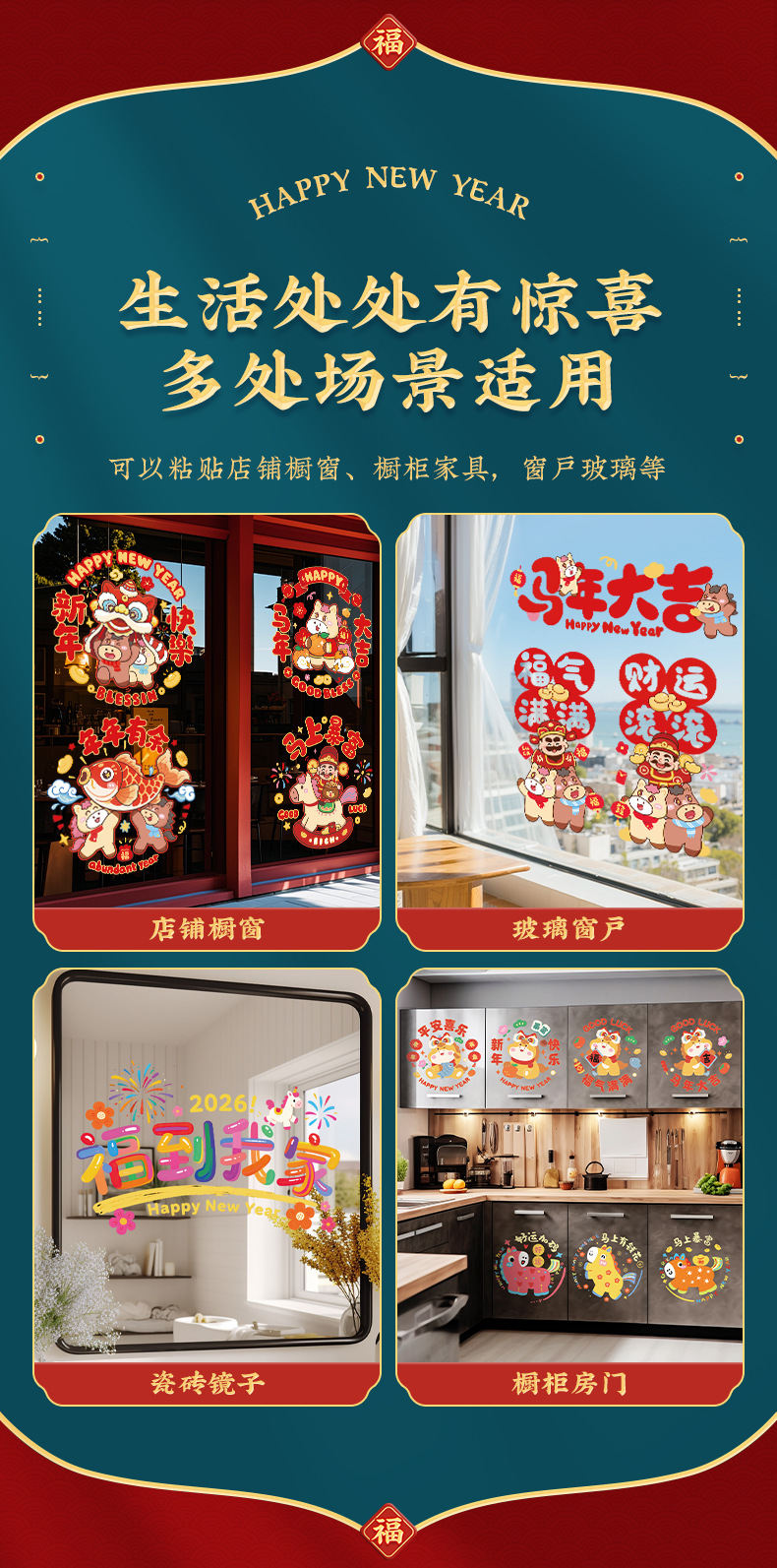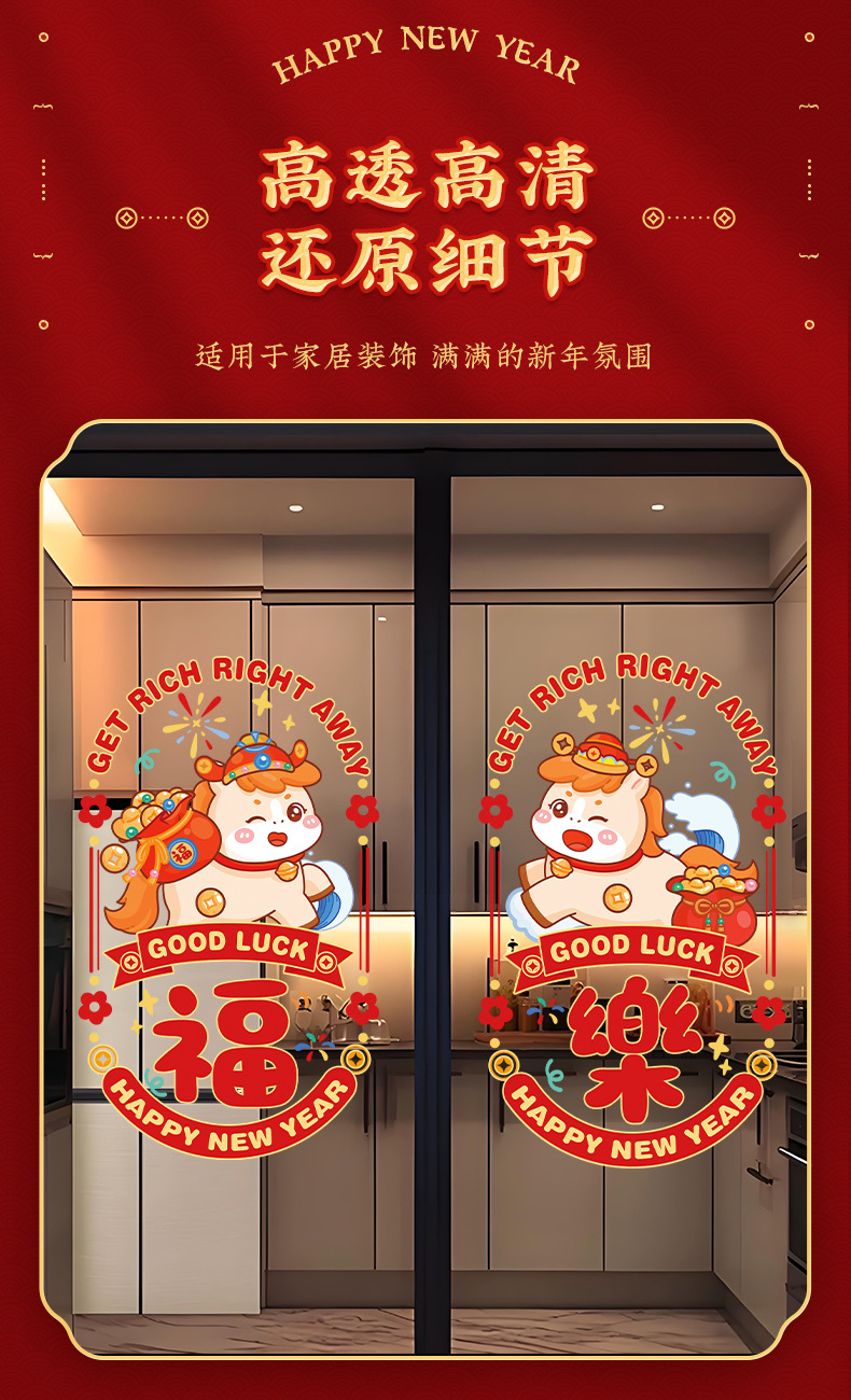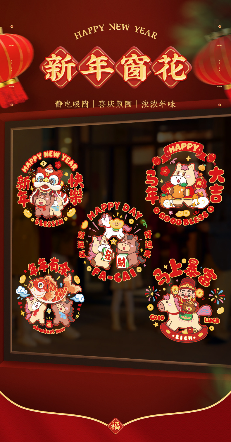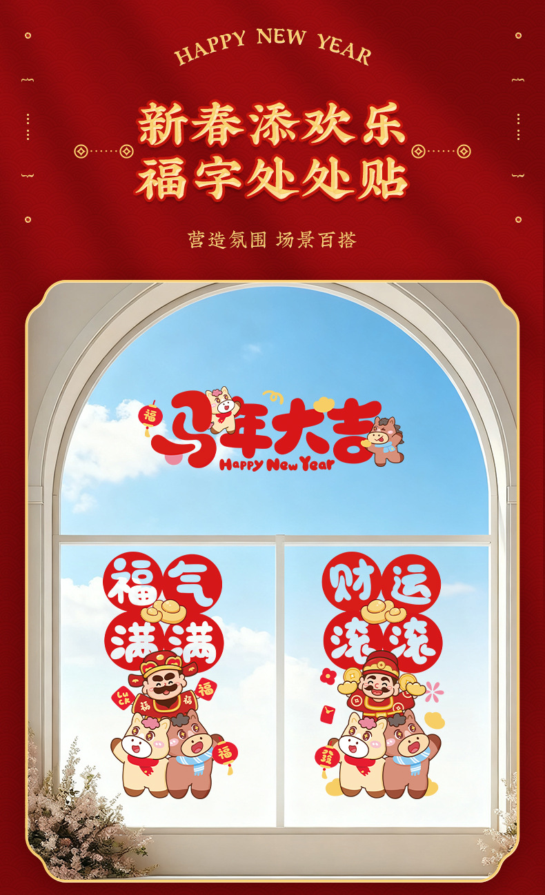 2026新款马年窗花静电贴新年福字玻璃贴剪纸过年春节布置装饰2026马年彩色窗花免胶双面静电贴新春春节彩色静电贴玻璃窗贴纸