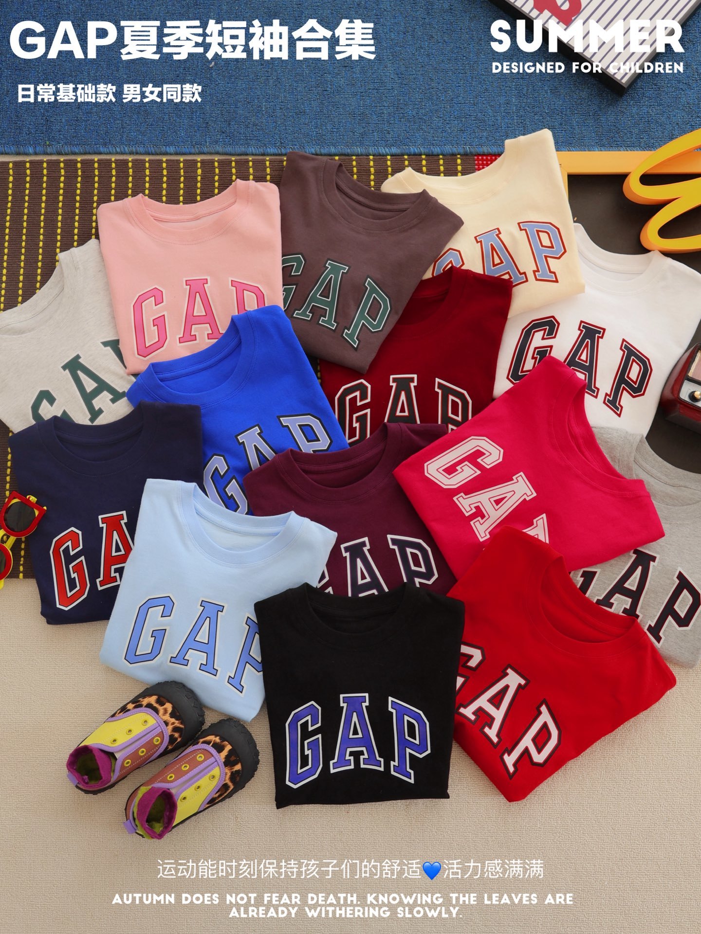 十四个色,夏天穿透气不闷汗,印花耐造不裂,娃跑跳一整天都舒服!