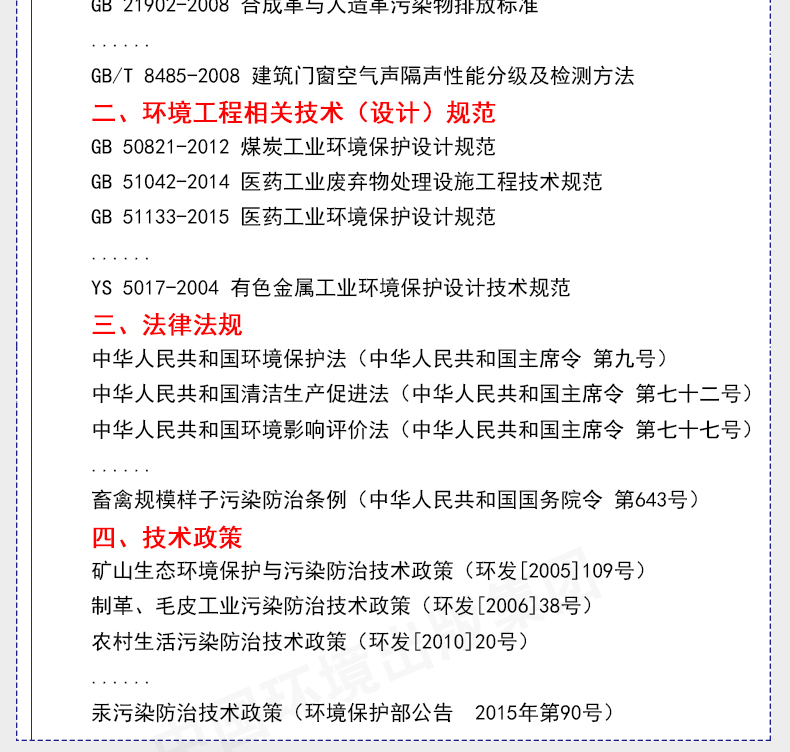 《注册环保工程师专业考试复习教材:综合类法规和标准(第四版)》内容有合成革与人造革工业污染物排放标准、陶瓷工业污染物排放标准、建筑门窗空气声隔声性能分级及检测方法、医药工业废弃物处理设施工程技术规范、废铅酸蓄电池处理污染控制技术规范等。