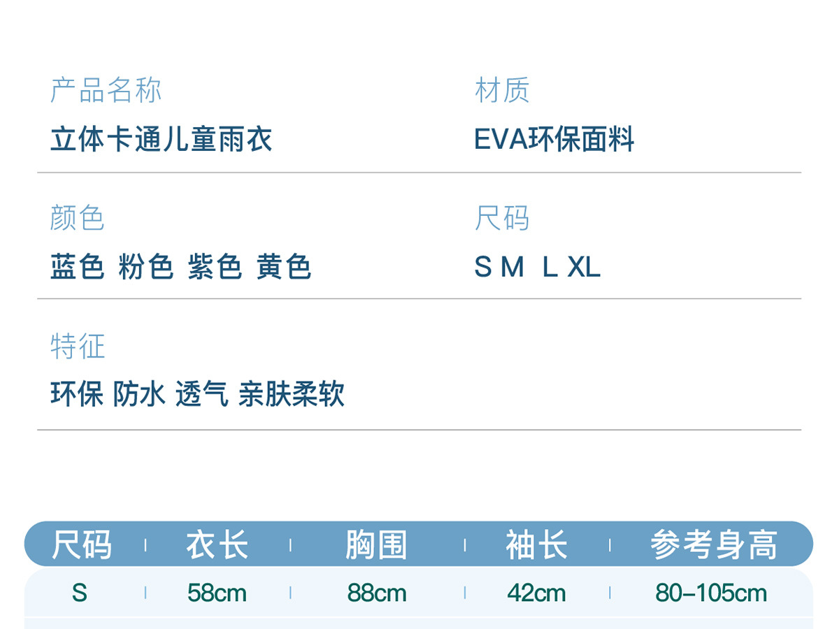 【儿童雨衣,宝贝必备】轻松应对雨季。女童男童皆宜,贴心呵护,让宝宝高枕无忧。幼儿园专属款式,五小孩争相穿戴,个性时尚抢眼。4岁小朋友适用身高80-140CM,自由穿搭不受限,让宝贝在雨中依然灿烂!