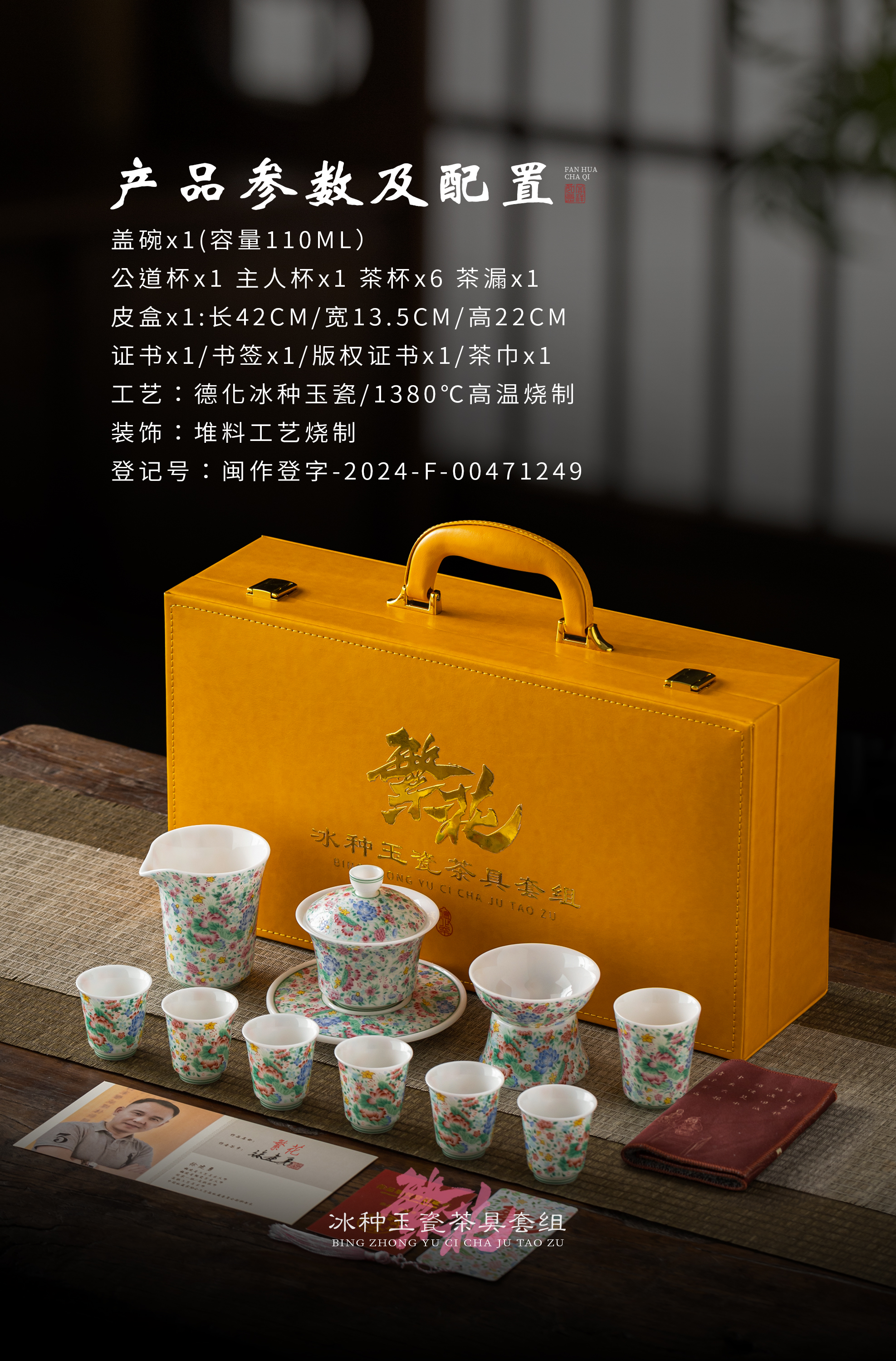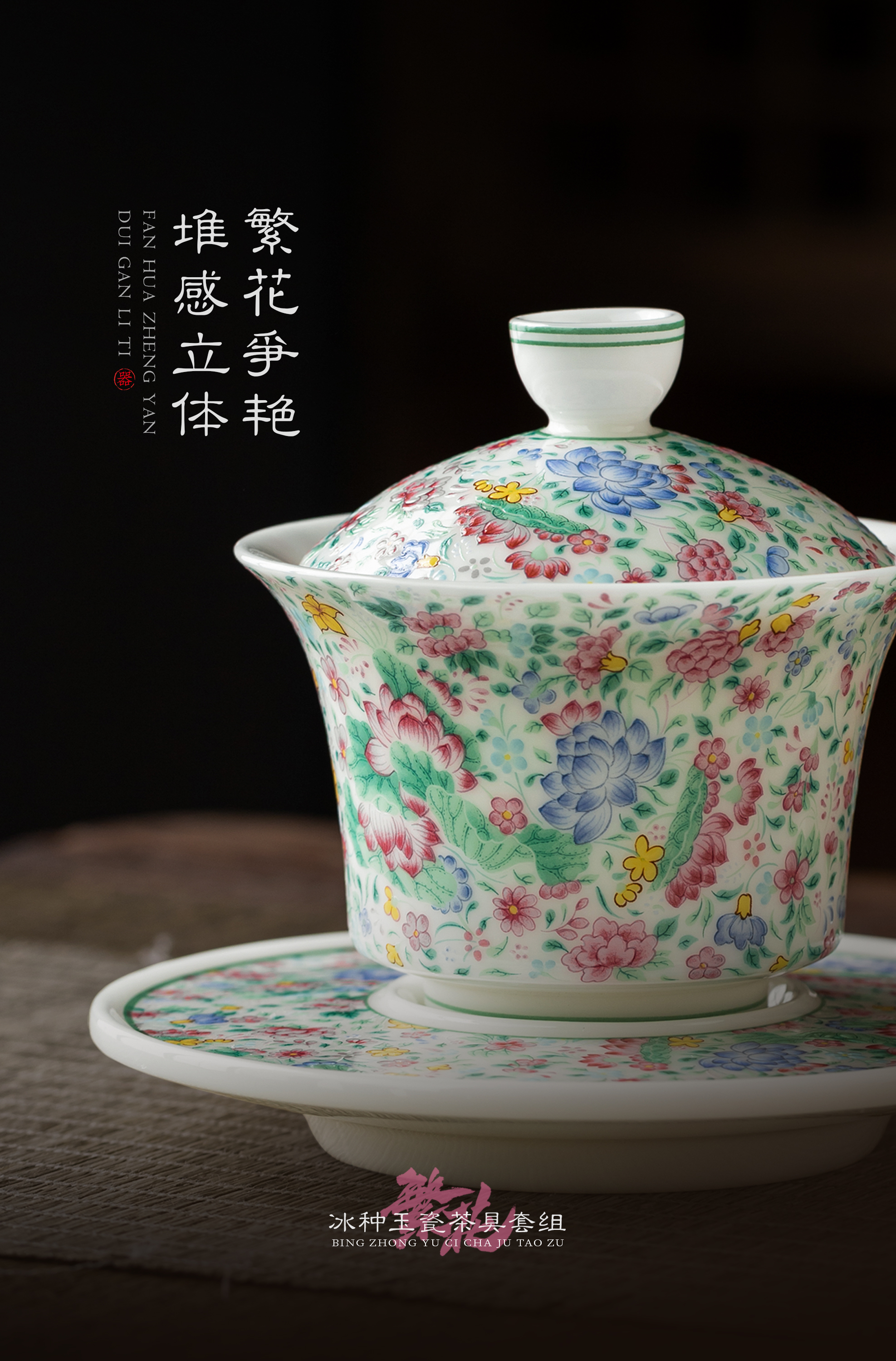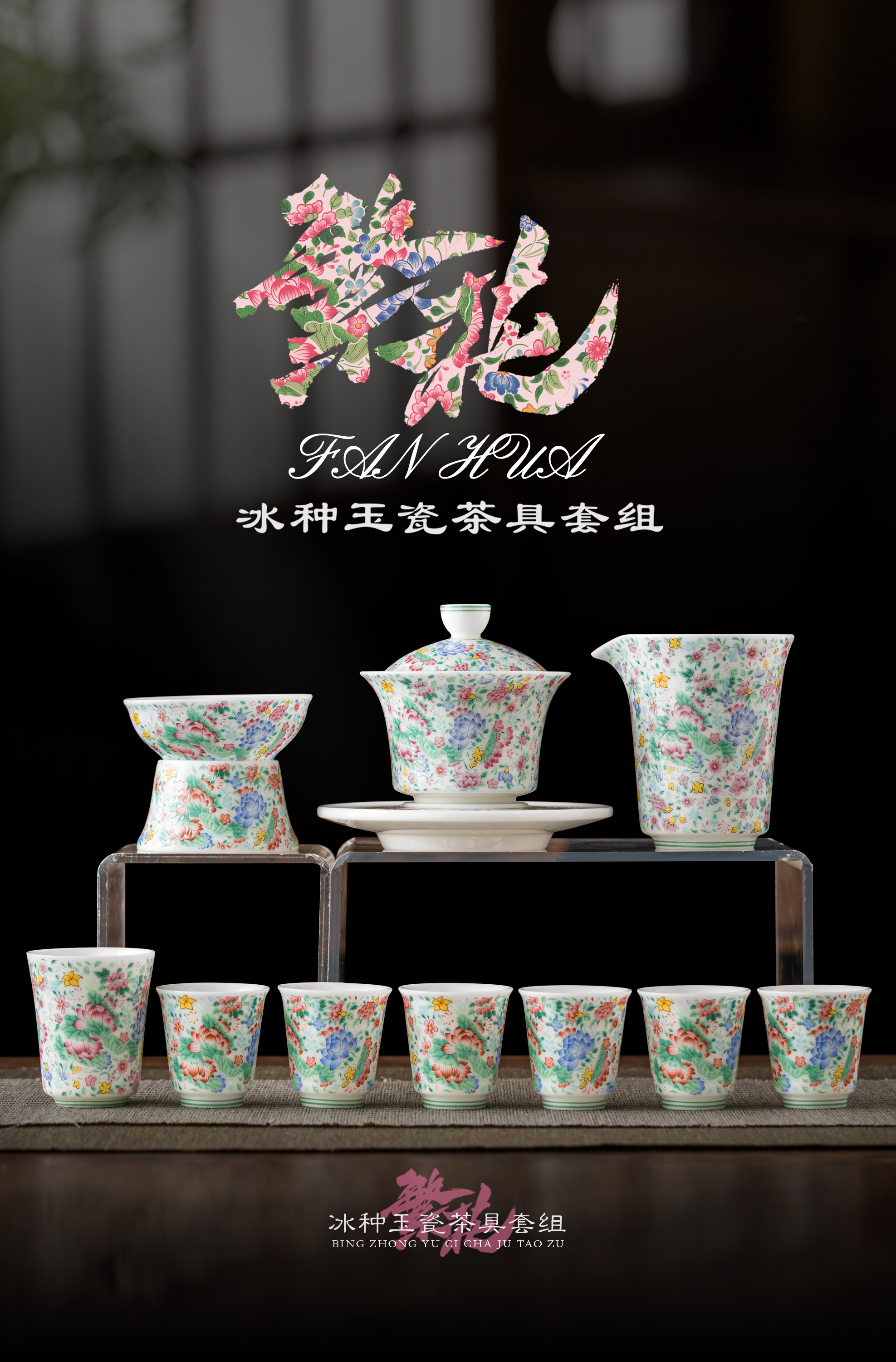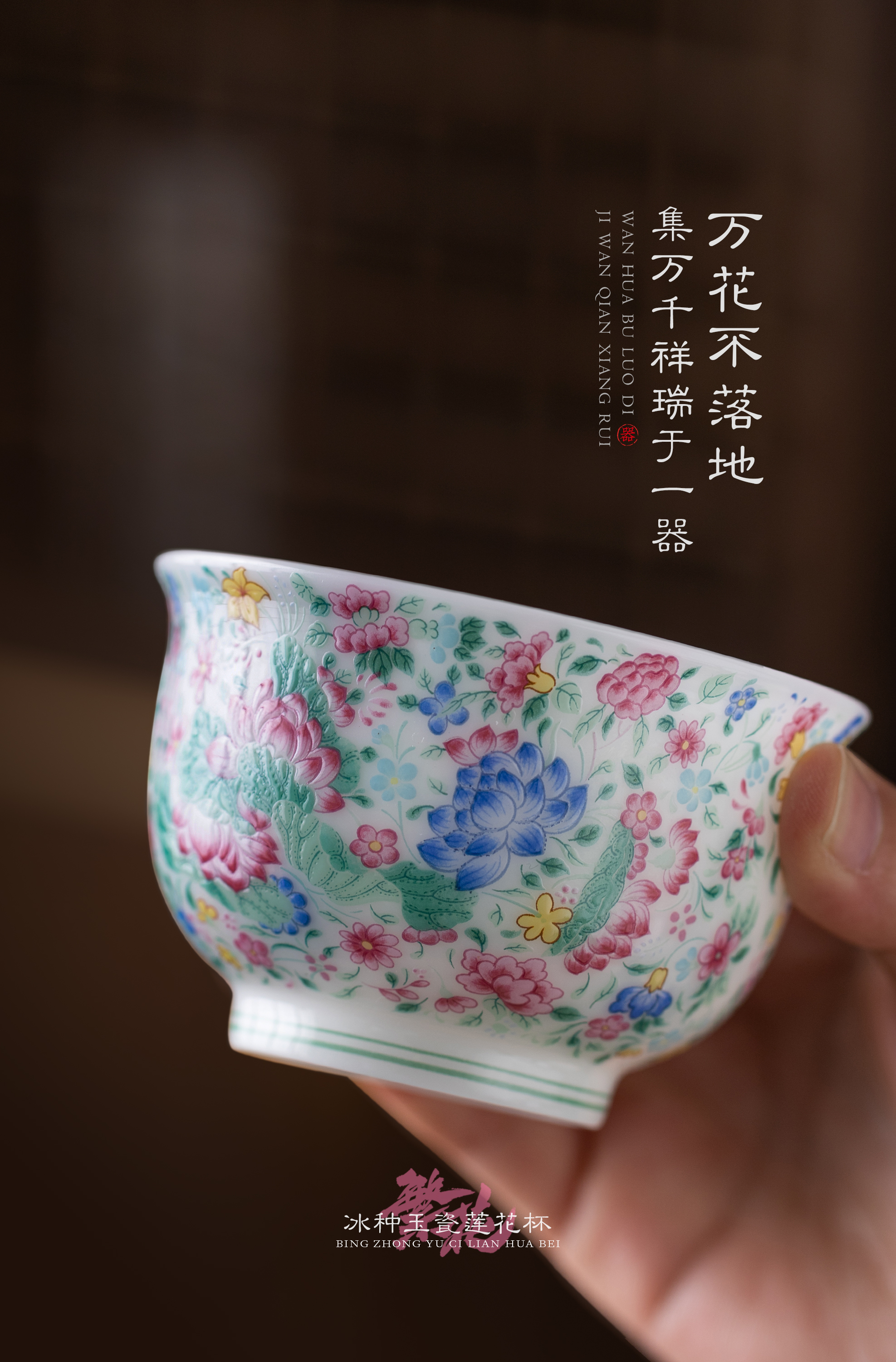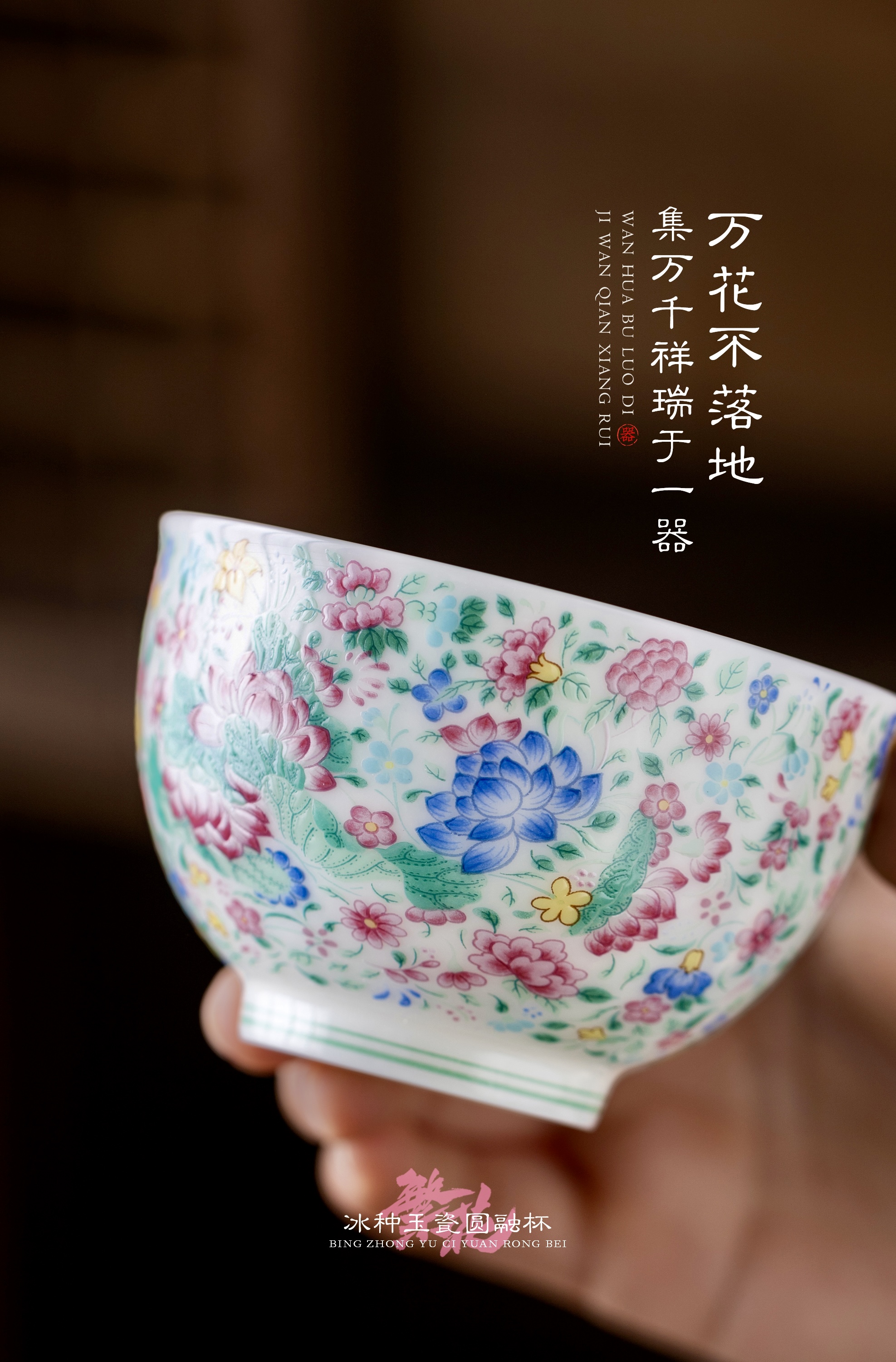 【万花呈瑞 盛世升平】繁花冰种玉瓷茶具套组/圆融杯/莲花杯主人杯/咖啡杯 徐建勇大师签章,繁花争艳 推感立体 迎光透亮,精美包装 gao端豪礼