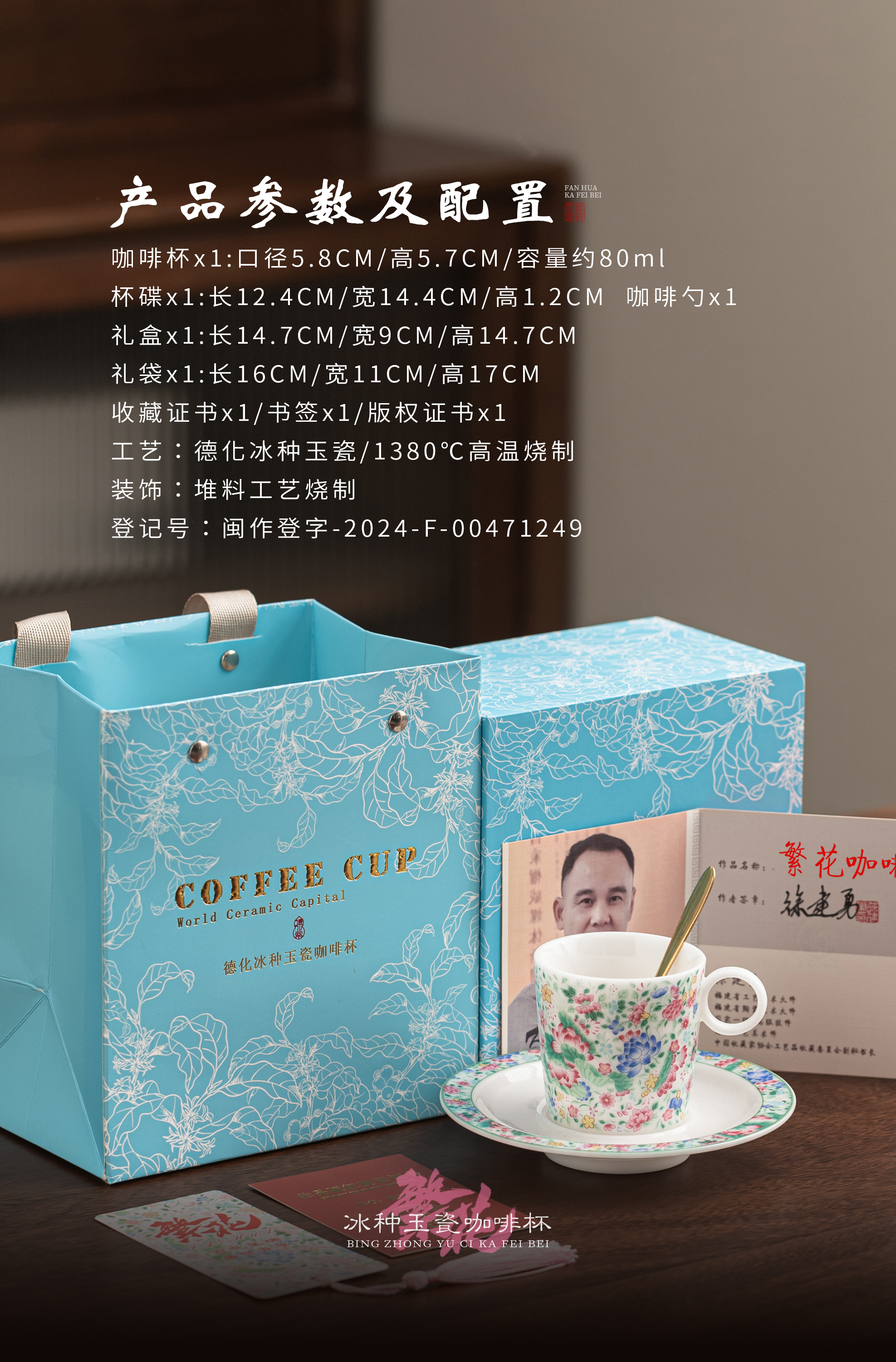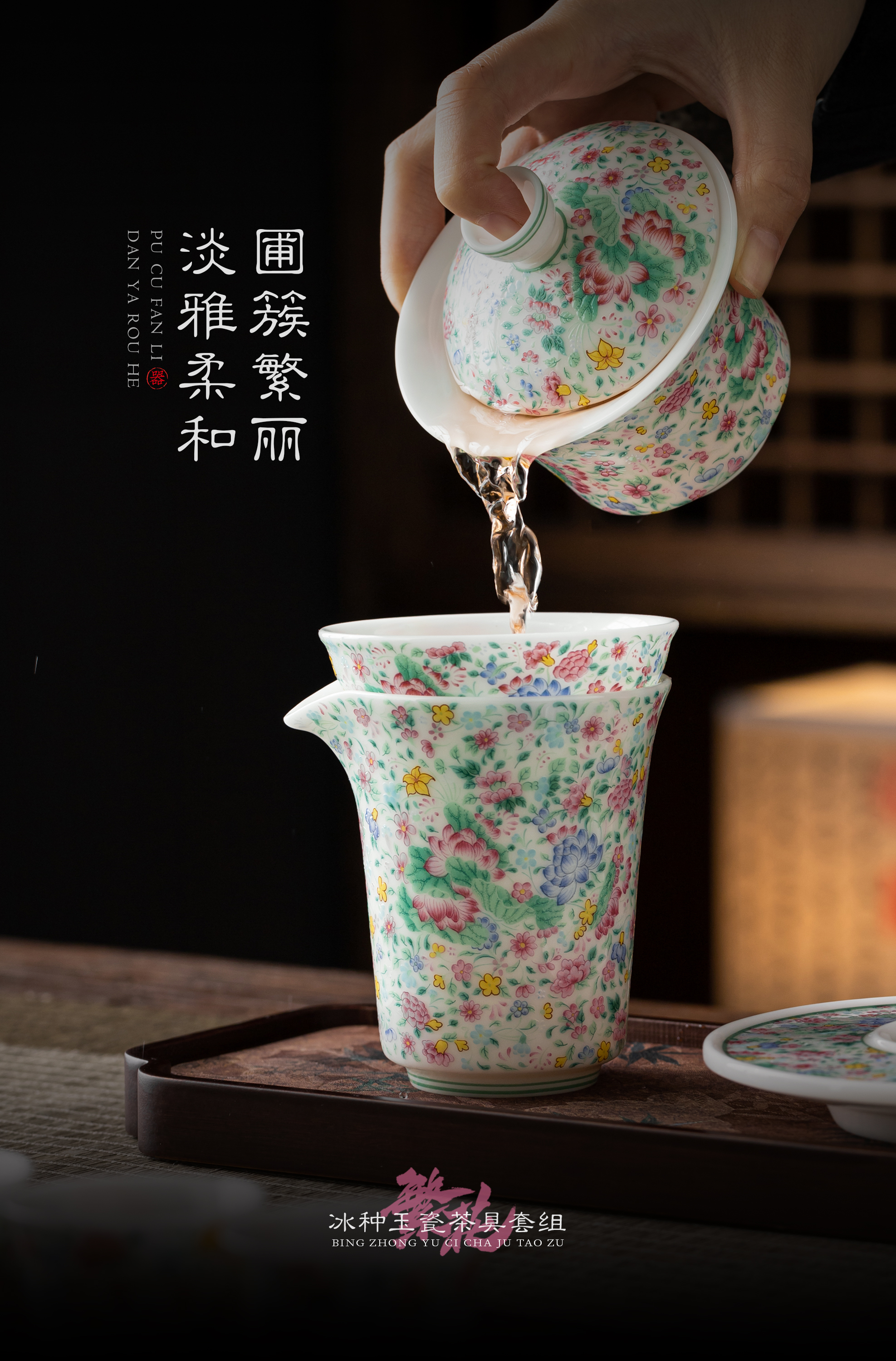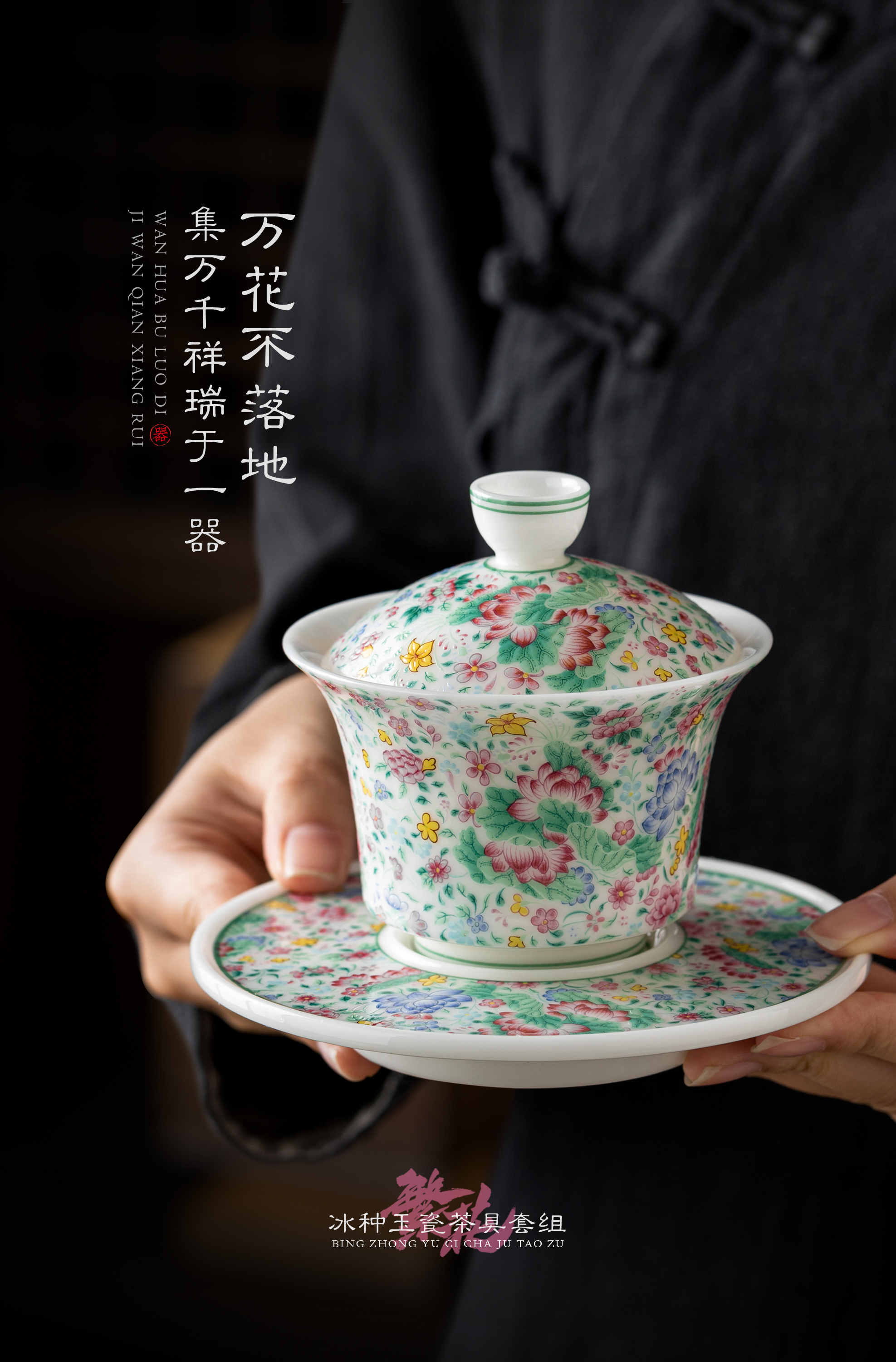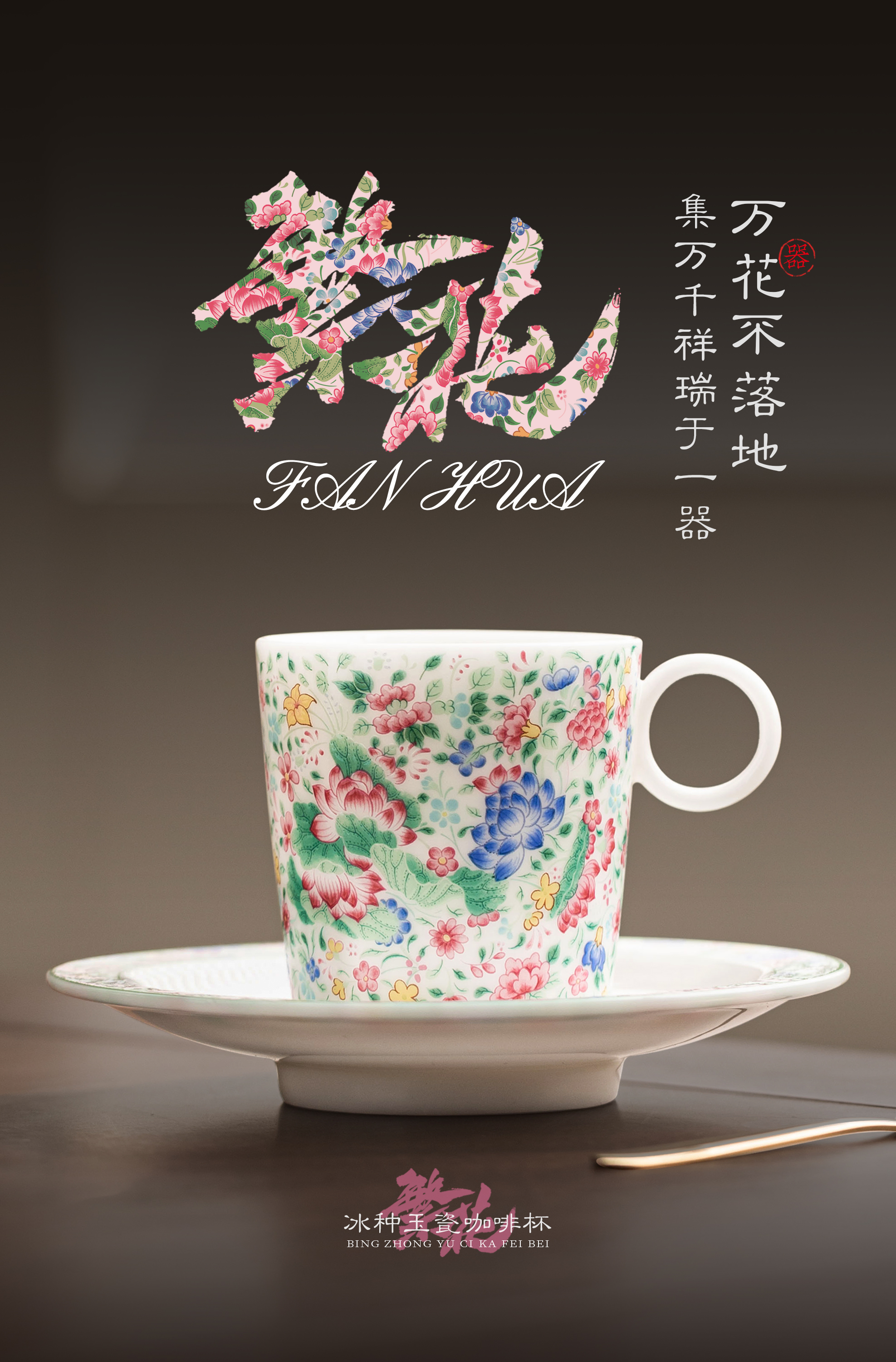 【万花呈瑞 盛世升平】繁花冰种玉瓷茶具套组/圆融杯/莲花杯主人杯/咖啡杯 徐建勇大师签章,繁花争艳 推感立体 迎光透亮,精美包装 gao端豪礼