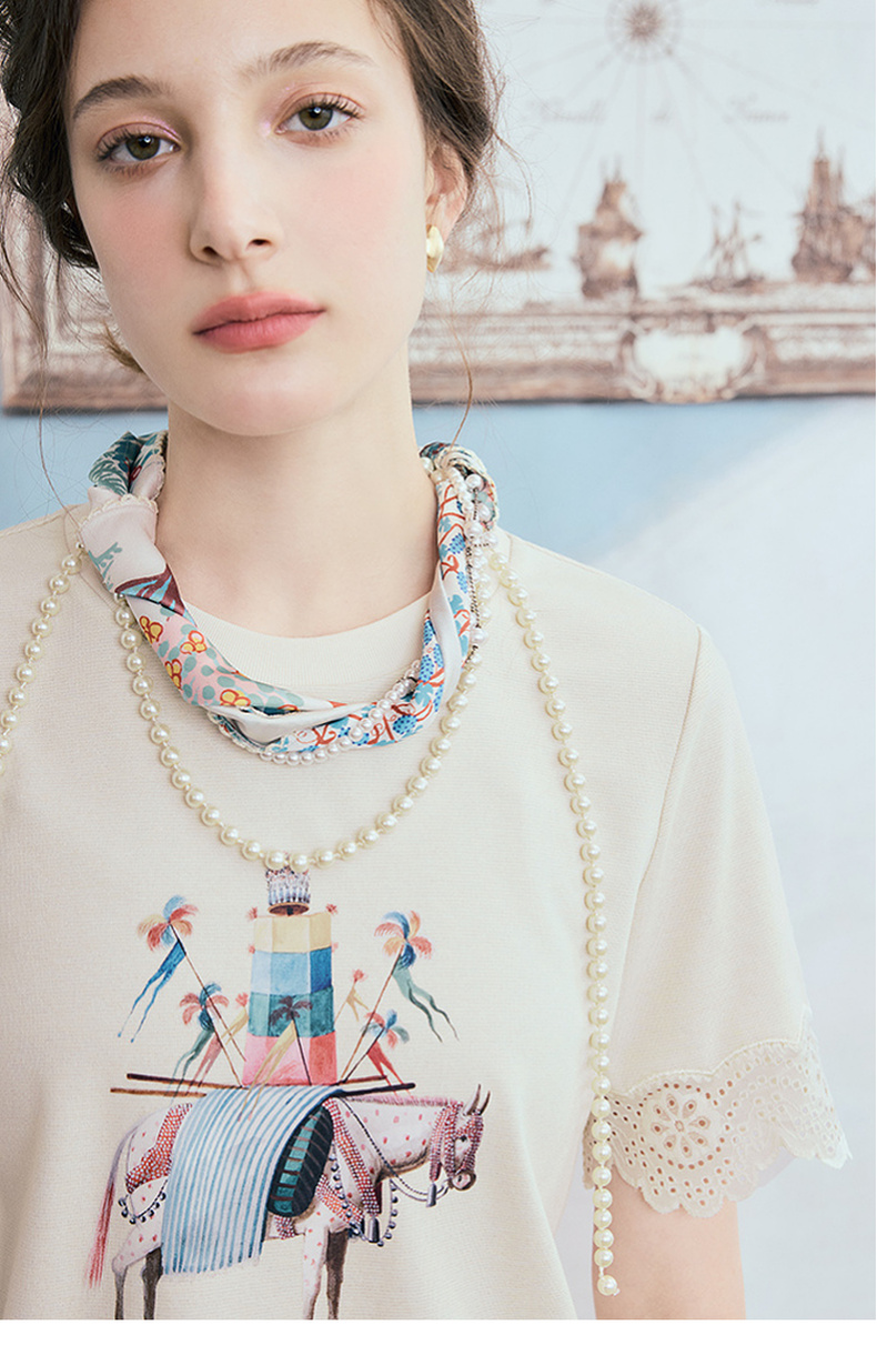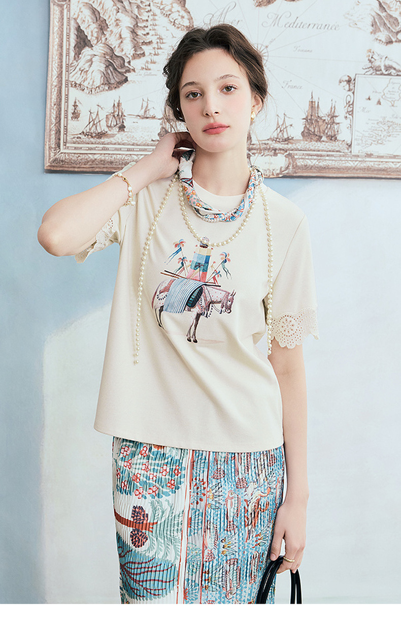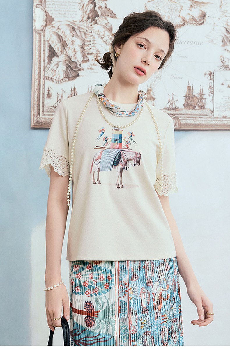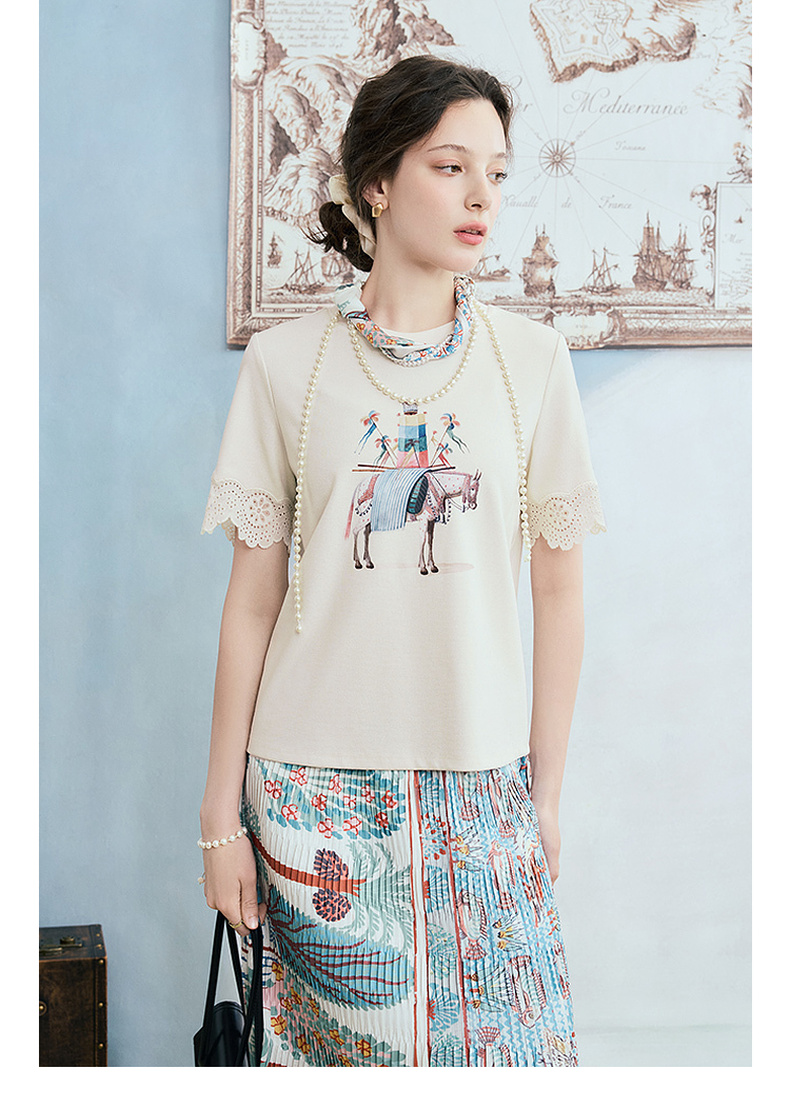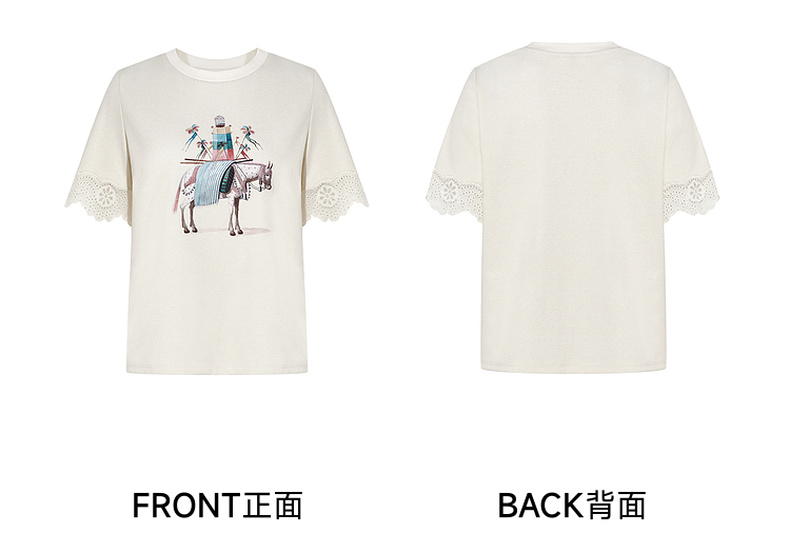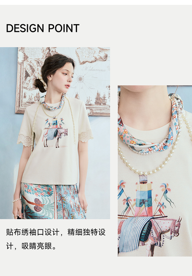 两三事 风苔骑影 2025夏季新款休闲蕾丝拼接短袖印花t恤女宽松