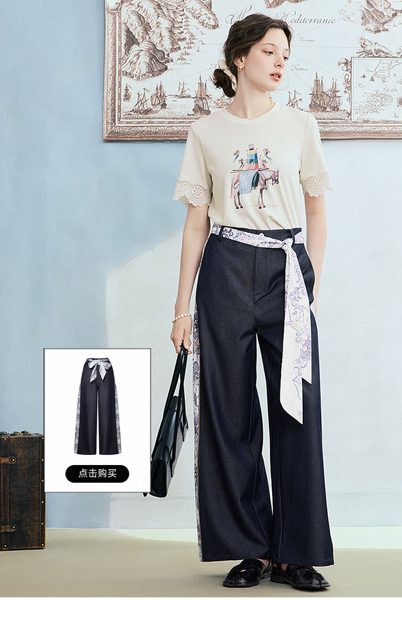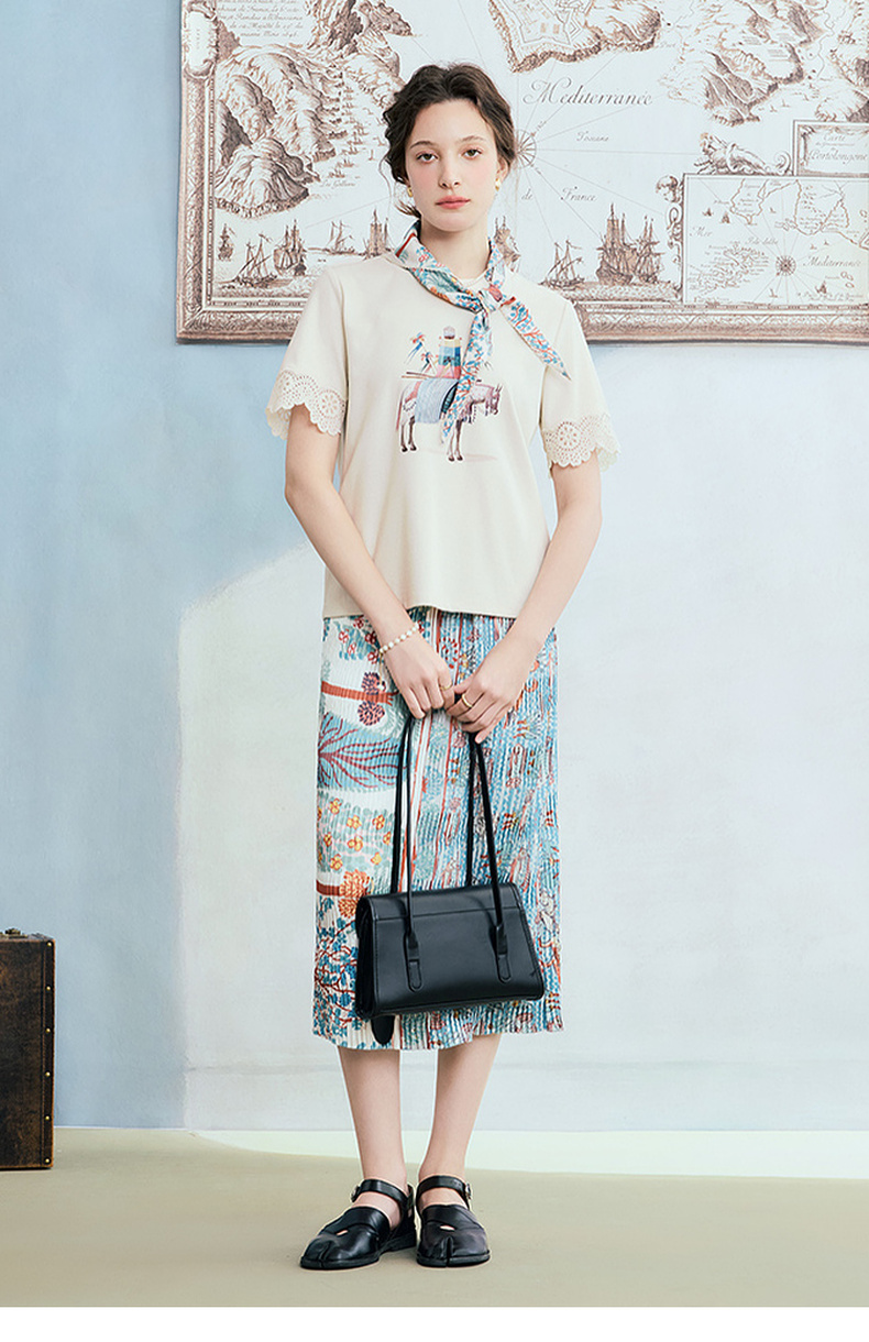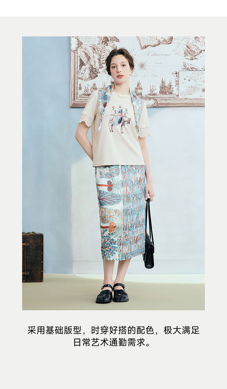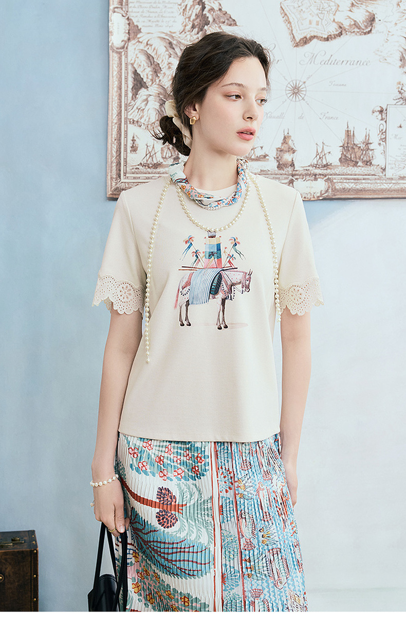两三事 风苔骑影 2025夏季新款休闲蕾丝拼接短袖印花t恤女宽松