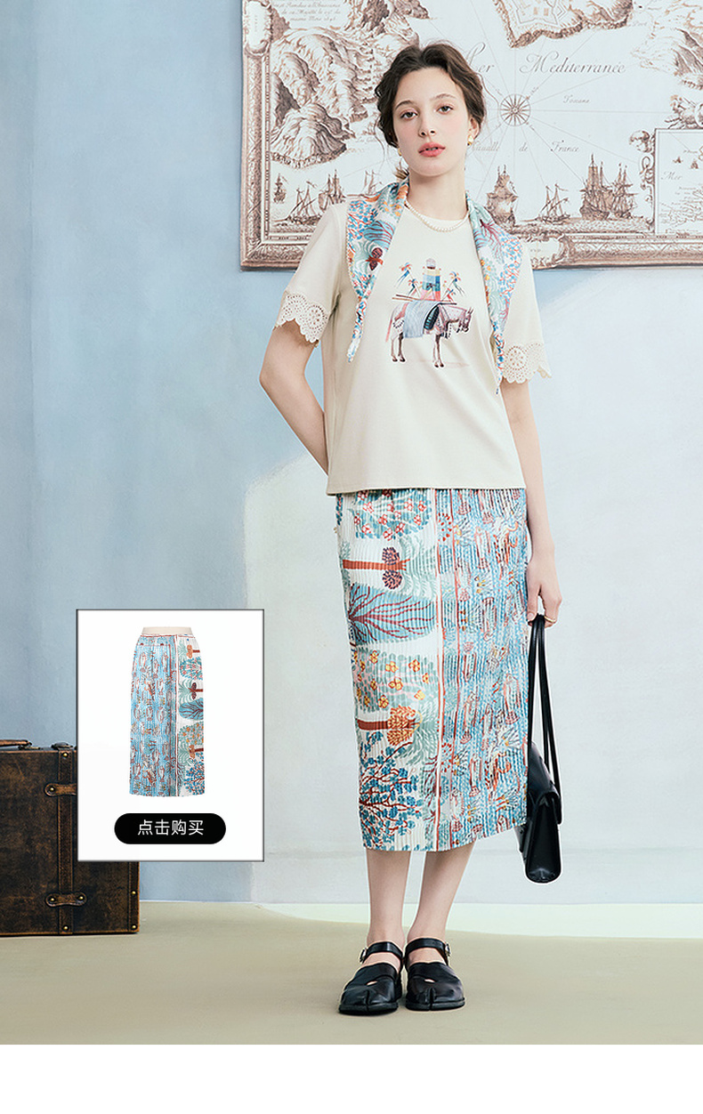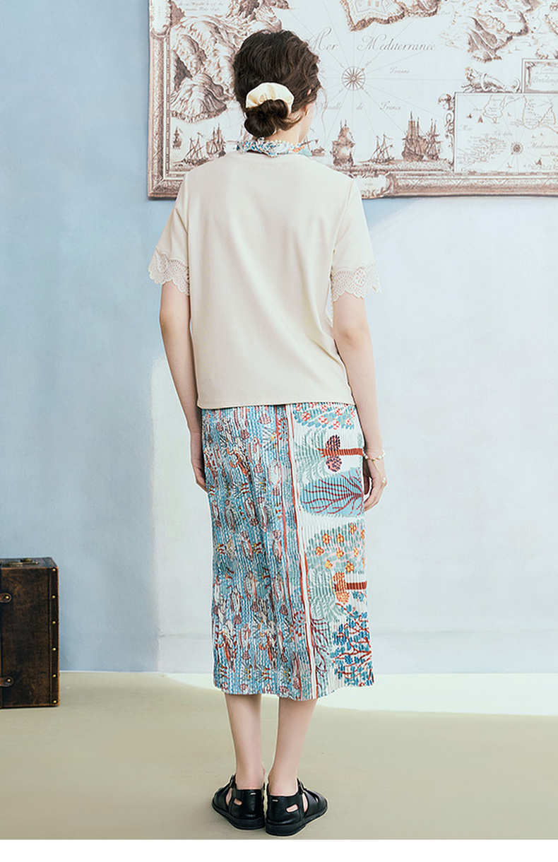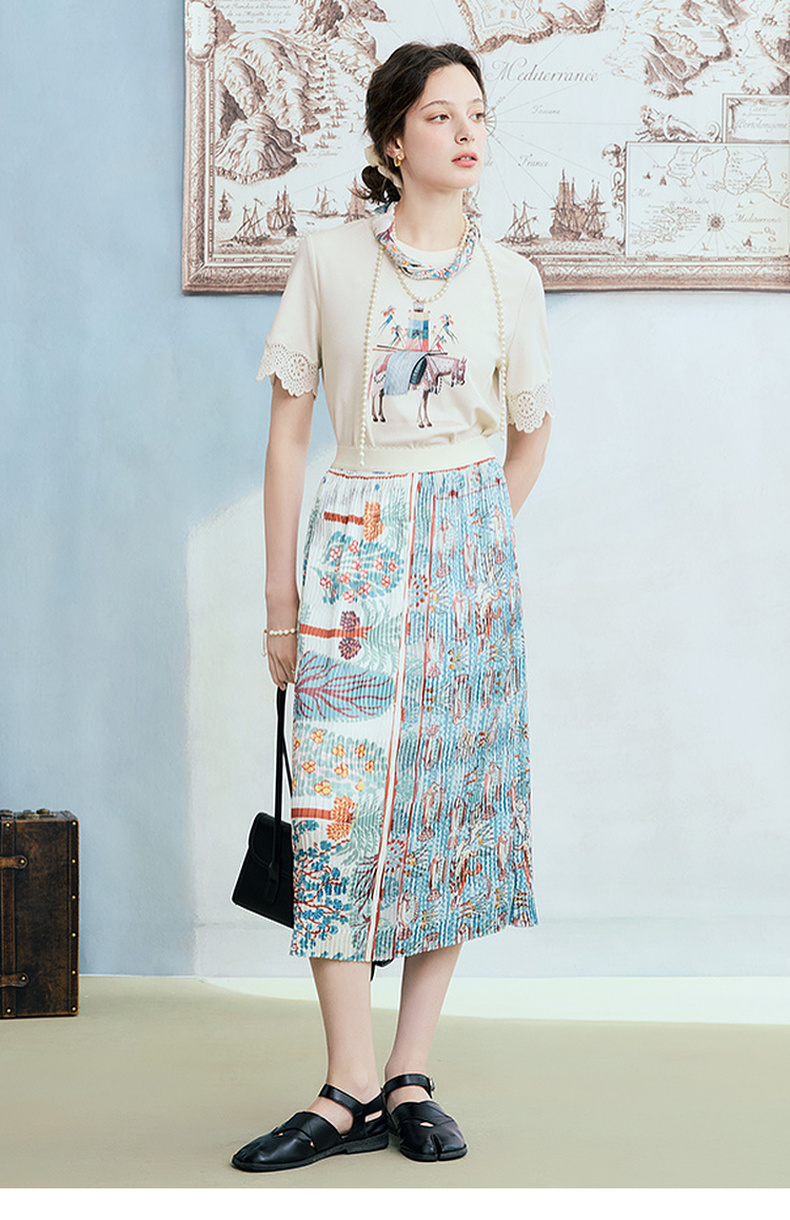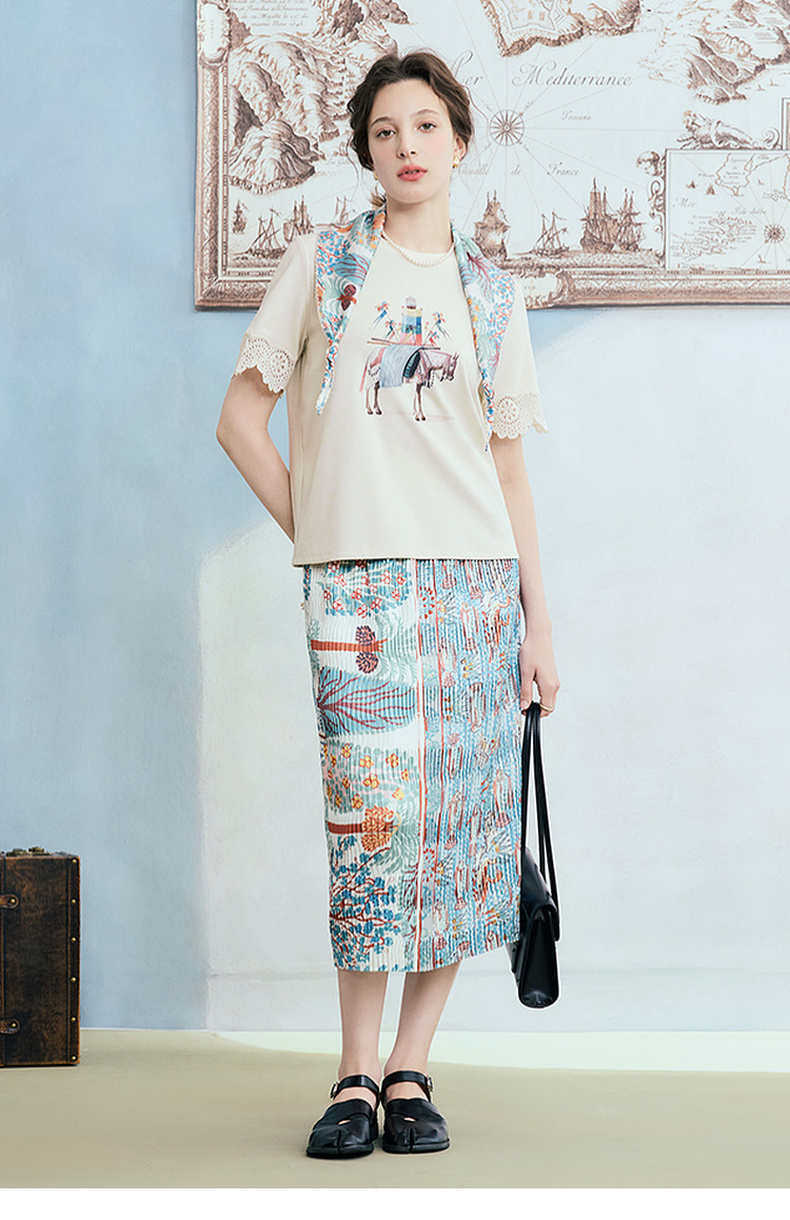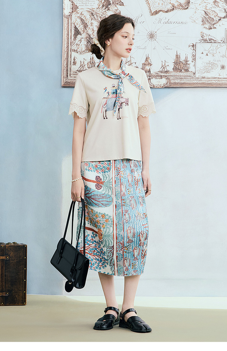 两三事 风苔骑影 2025夏季新款休闲蕾丝拼接短袖印花t恤女宽松