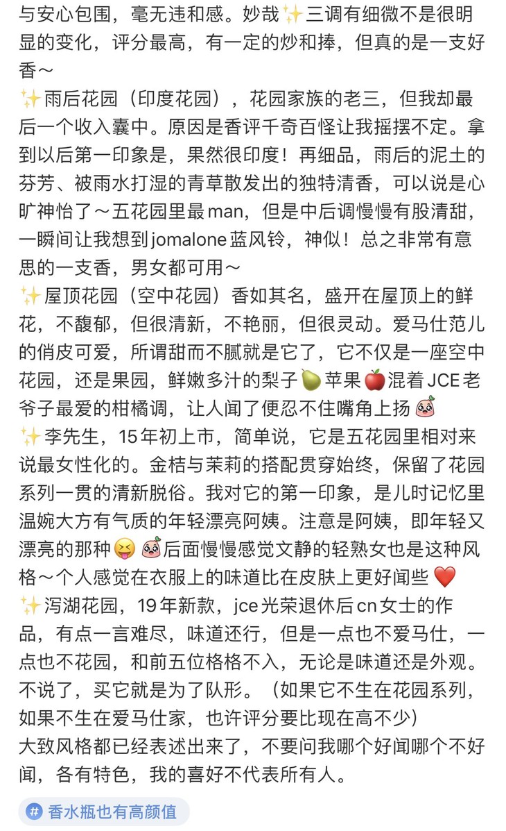 HERMES 尼罗河花园,融合了果香、青草香和木香,有一种混和嫩芽和果肉的新鲜,暗藏着胡萝卜的清脆和番茄茎的青涩,同时,具有浓烈果香的青芒果滋味、再加入衝鼻又带点苦涩的葡萄柚的芬芳也随之飘了出来,香氛中还溢出橙心草清新的果香,春意十足;随后浮出的是水生莲花,其近似呢喃的低调花香,是介於风信子和牡丹花的香味,令香氛多了些许娇奢感,而无花果树的气息,為尼罗河花园加入中性的气息,是一支男女都适用的香水。