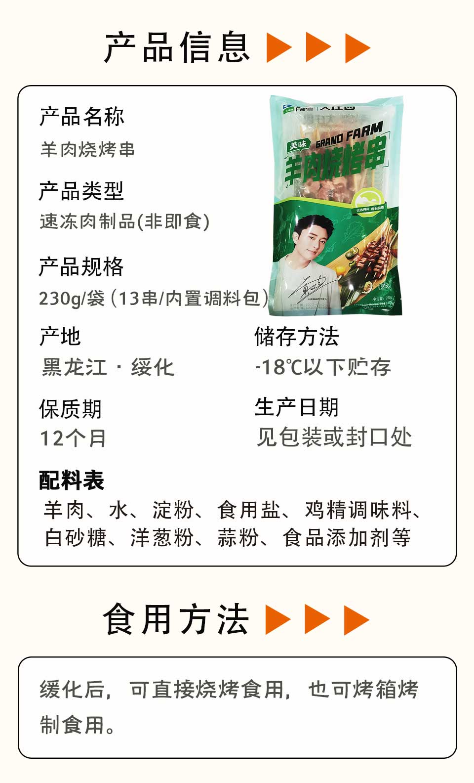 大庄园羊肉烧烤串 净含量:230g/袋(13串)18g/串 20袋/件 (内置烧烤撒料20g、辣椒粉10g)