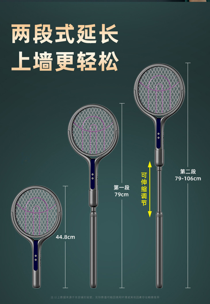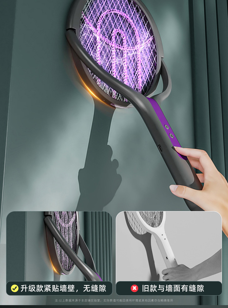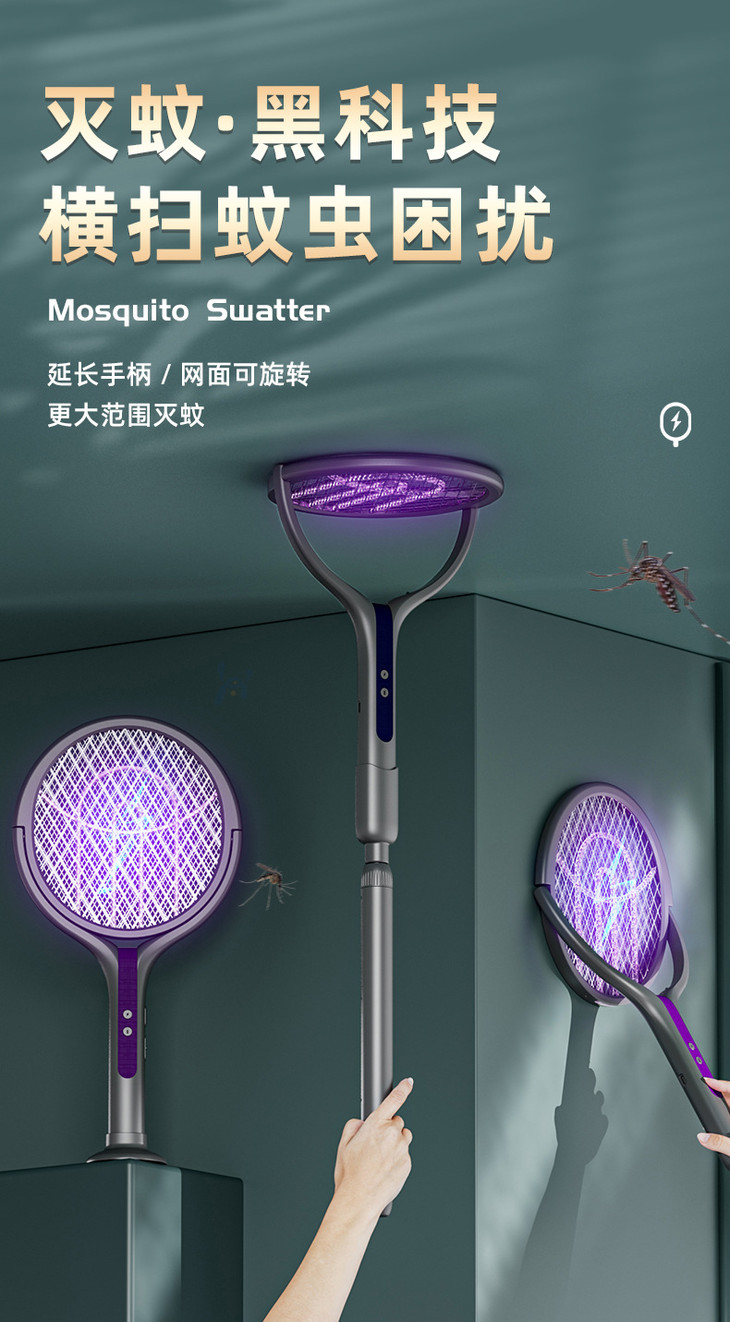 【USB充电式家用二合一诱蚊灭蚊拍神器】电蚊拍伸缩延长可旋转0°贴墙
