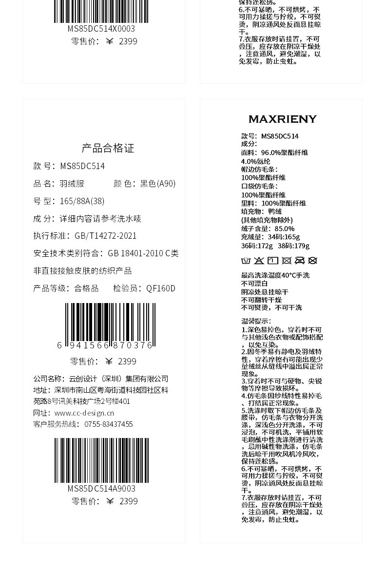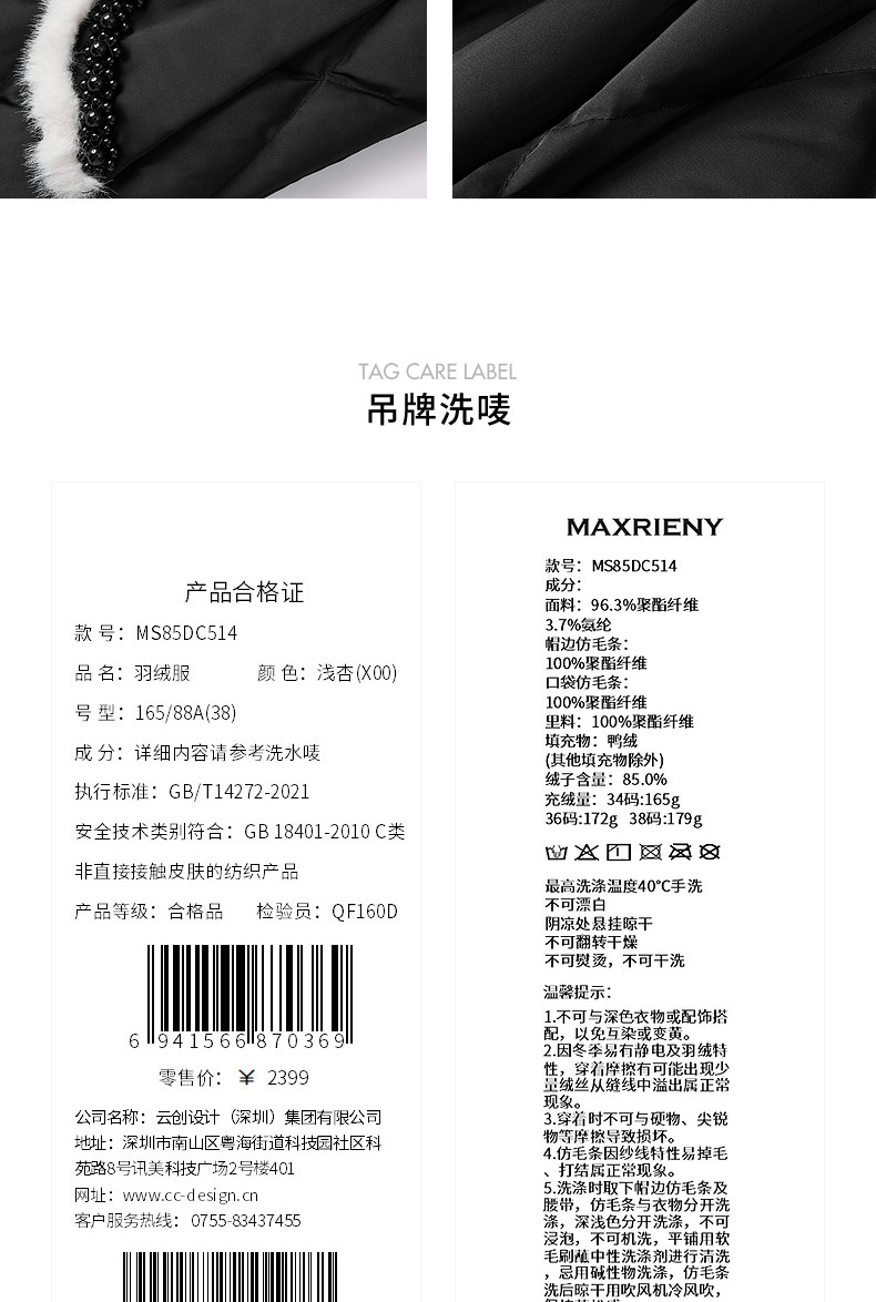 玛克门店发货:MAXRIENY羽绒服(货号:MS85DC514)