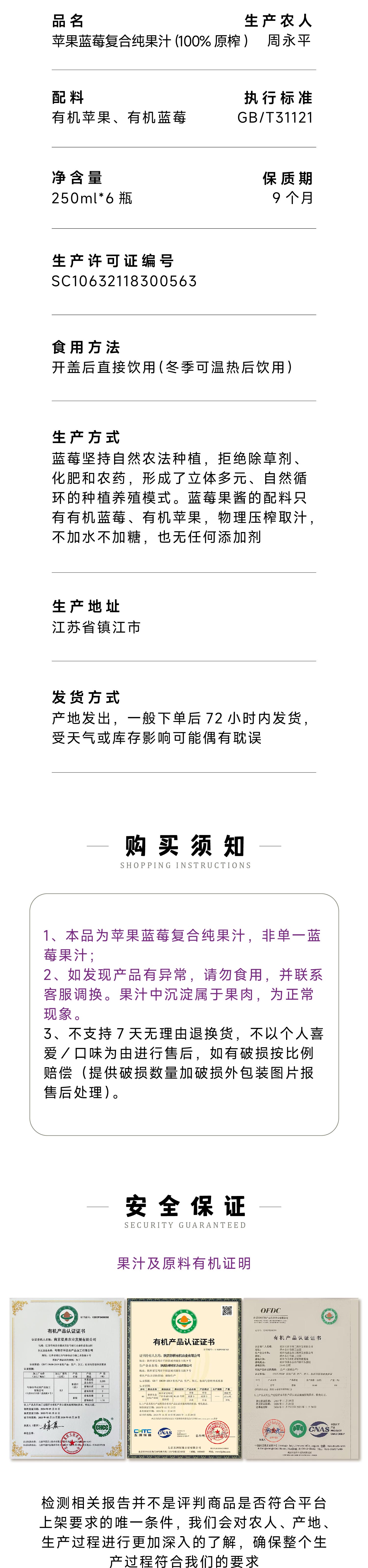 有机苹果蓝莓复合纯果汁 250ml*6瓶 | 合作农友生产,产自南京,生产者:周永平 *【公平贸易农人定价】
