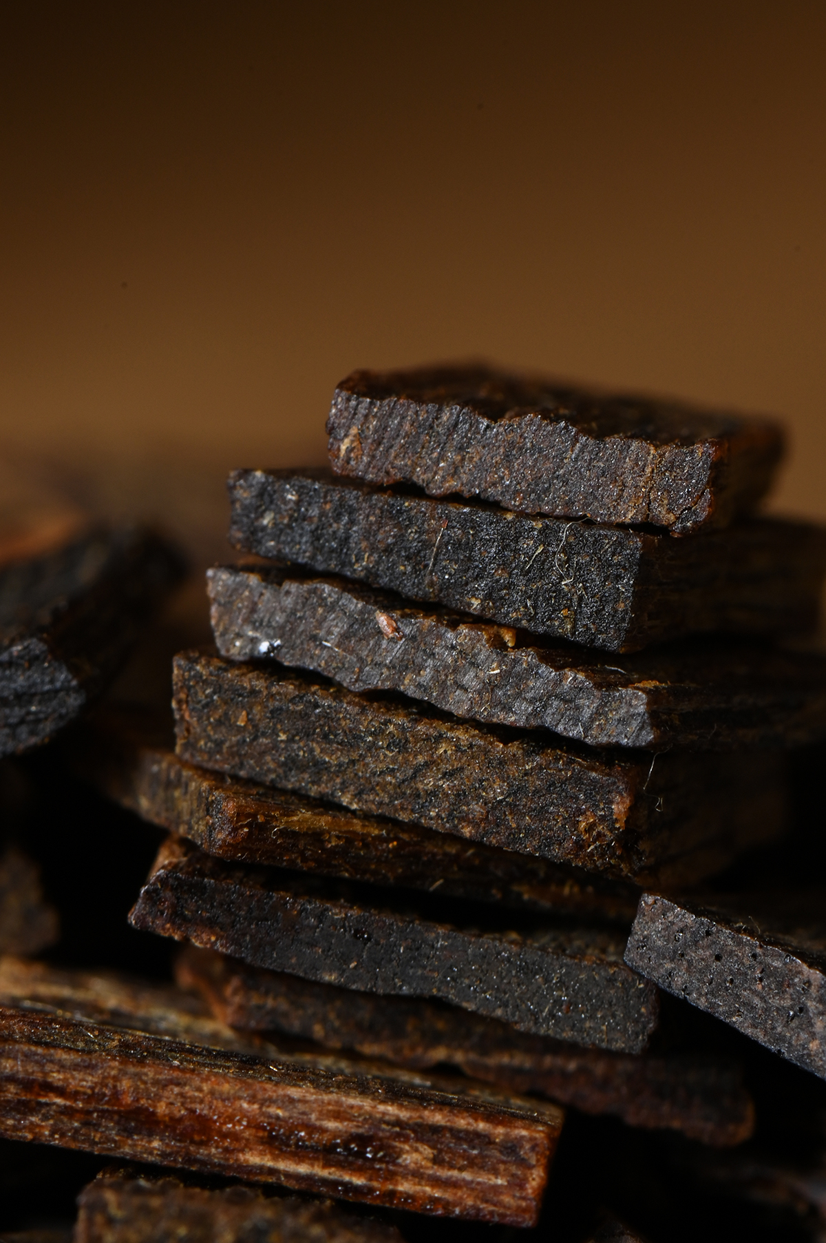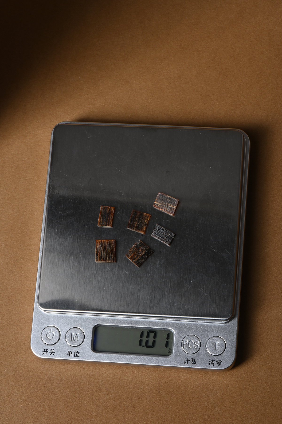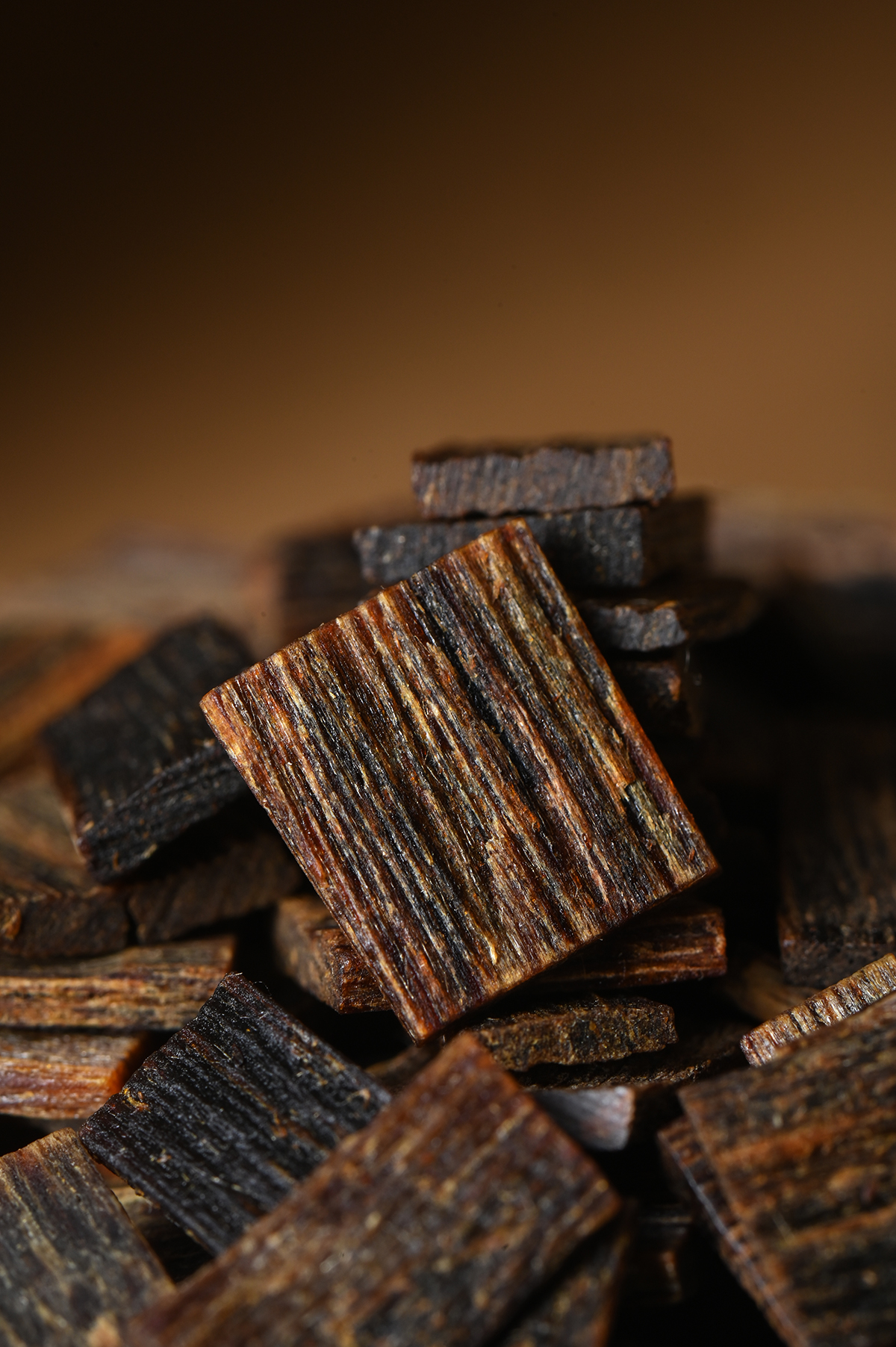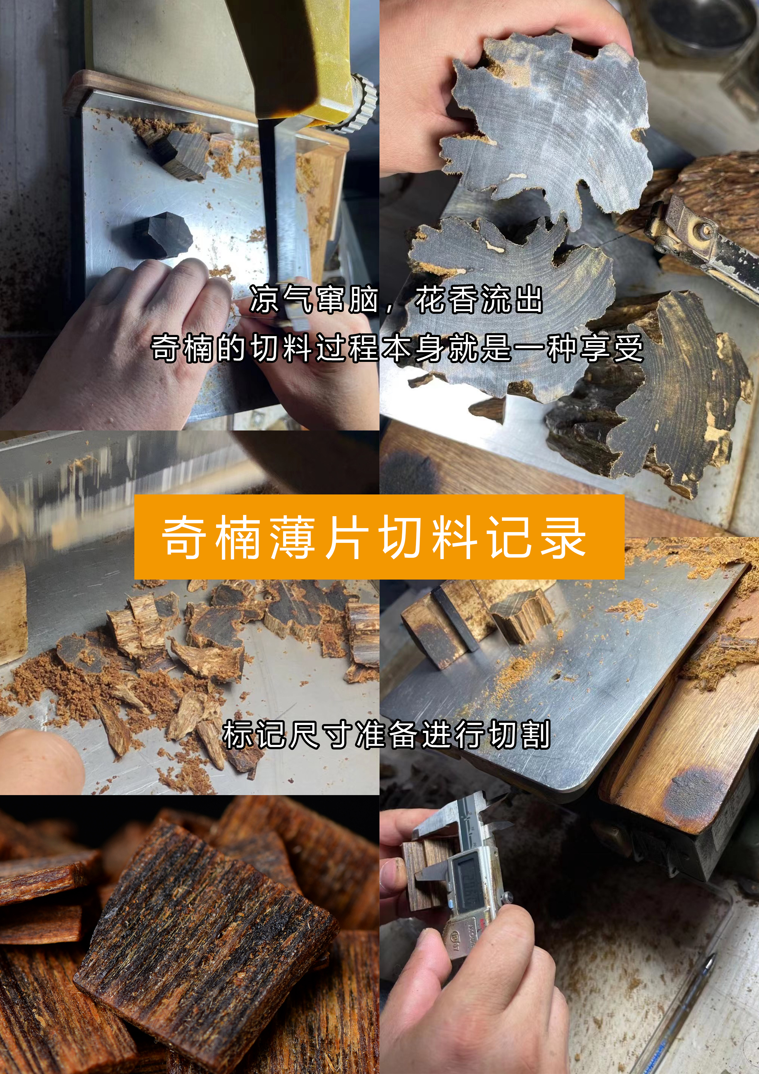 奇楠小薄片很少见,几百克的百年香结,切割成大小均衡的块块,双面切面满油,黑油膏状,密度极高,对奇楠的品质和切割工艺也是极为讲究