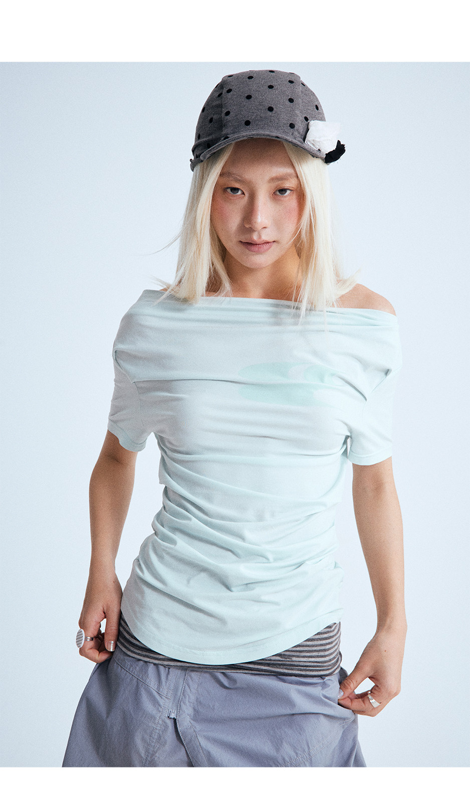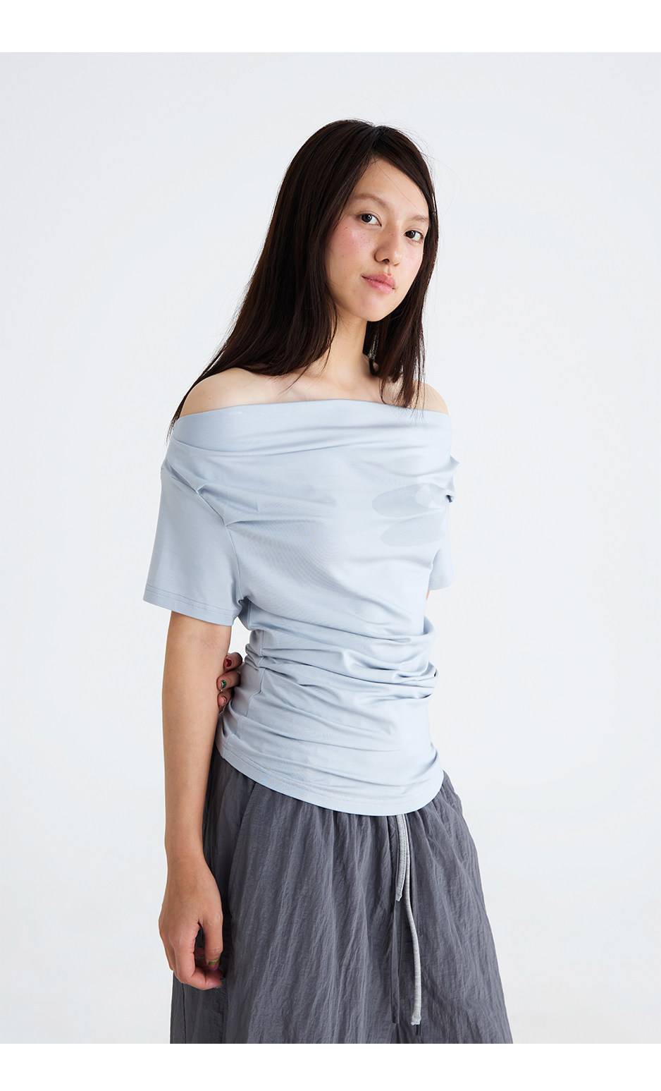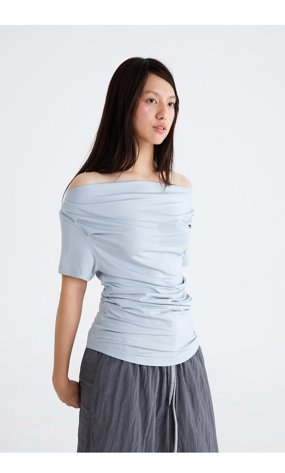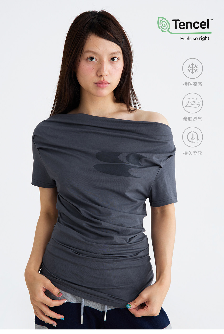 CryingCenter兰精莫代尔凉感斜肩一字肩领短袖露肩褶皱凉感上衣